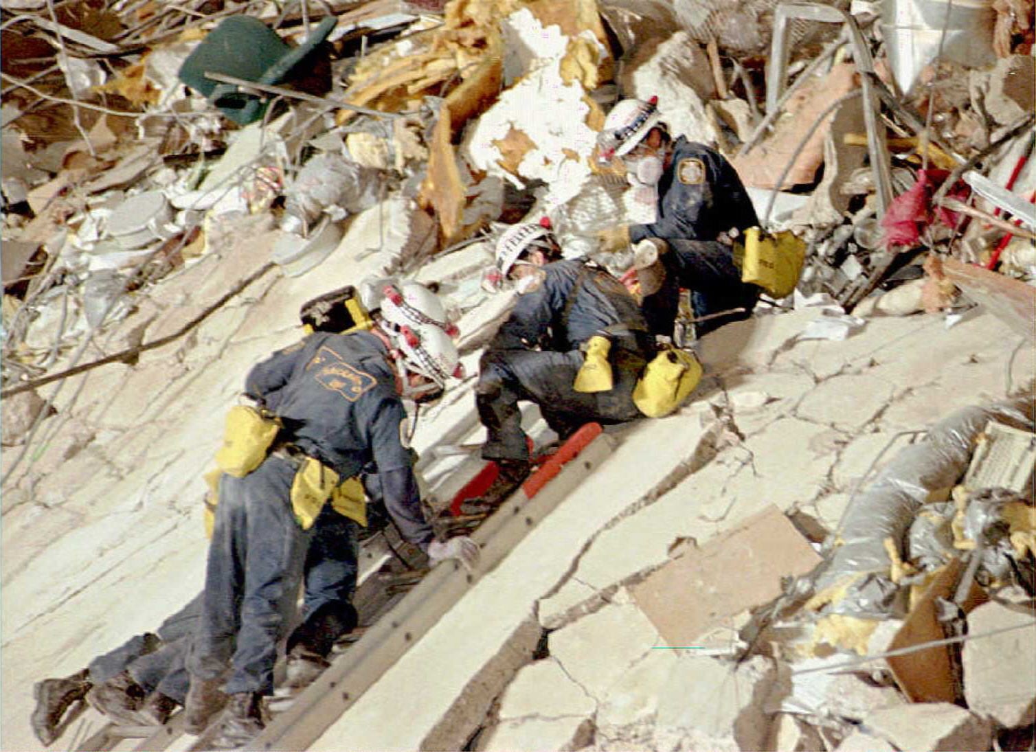 A rescue crew searches for bodies the day after the bombing at the Alfred P. Murrah Federal building in Oklahoma City.