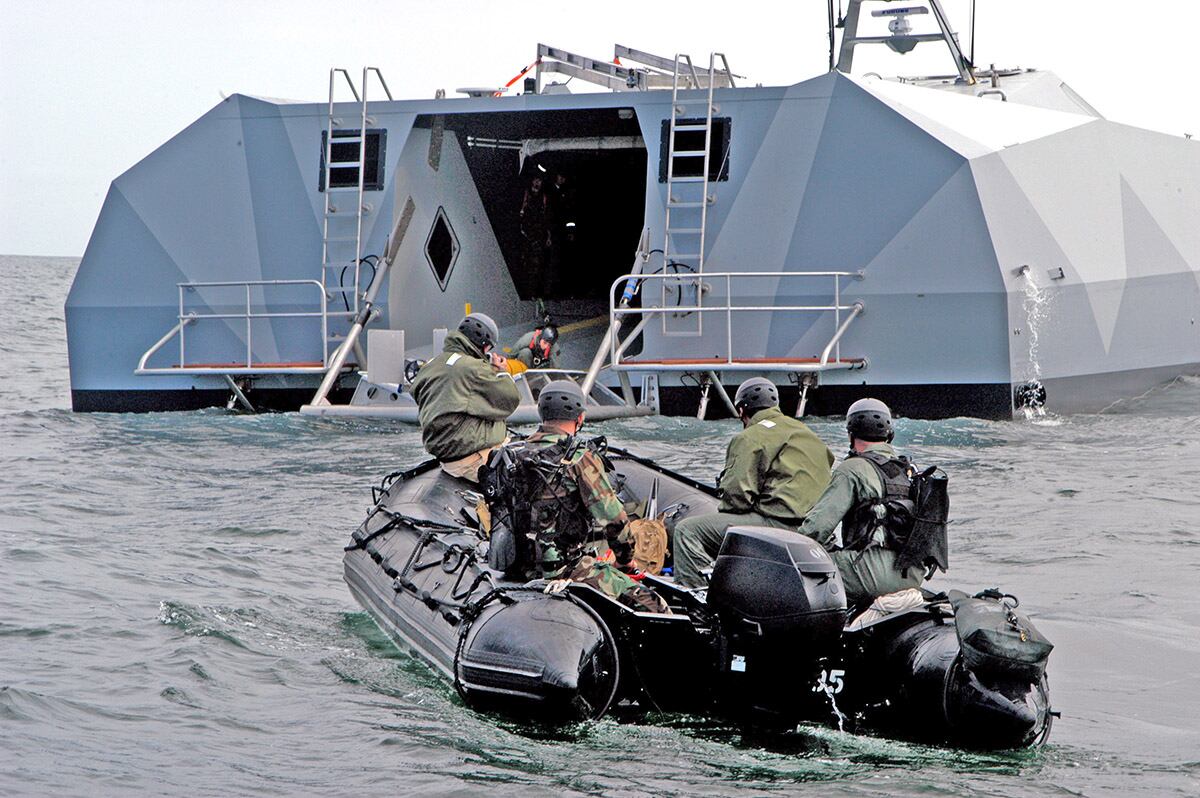 ATLANTIC OCEAN (Jan. 15, 2013) The high-speed experimental boat Stiletto pulls in to refuel before heading back out for evening operations. (U.S. Navy photo)San Diego (May 6, 2006) - Sailors assigned to Naval Special Clearance Team One (NSCT-1) prepare to enter the well deck aboard experimental boat ship Stiletto off the coast of San Diego. Members of NSCT-1 are participating in Exercise Howler. Stiletto is being tested for its usefulness in littoral combat warfare and interoperable environments. (photo by PHAN Damien Horvath/Navy)ATLANTIC OCEAN (Jan. 15, 2013) The Stiletto Maritime Demonstration Program team launches and 11-meter rigid-hull inflatable boat from the high-speed experimental boat Stiletto. (U.S. Navy photo)