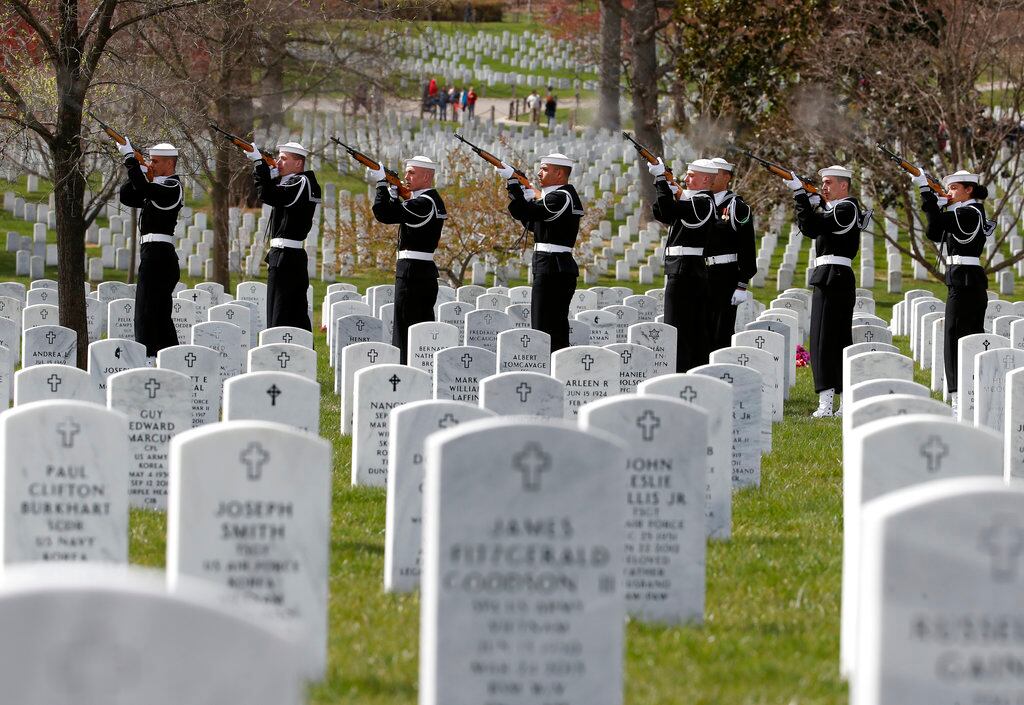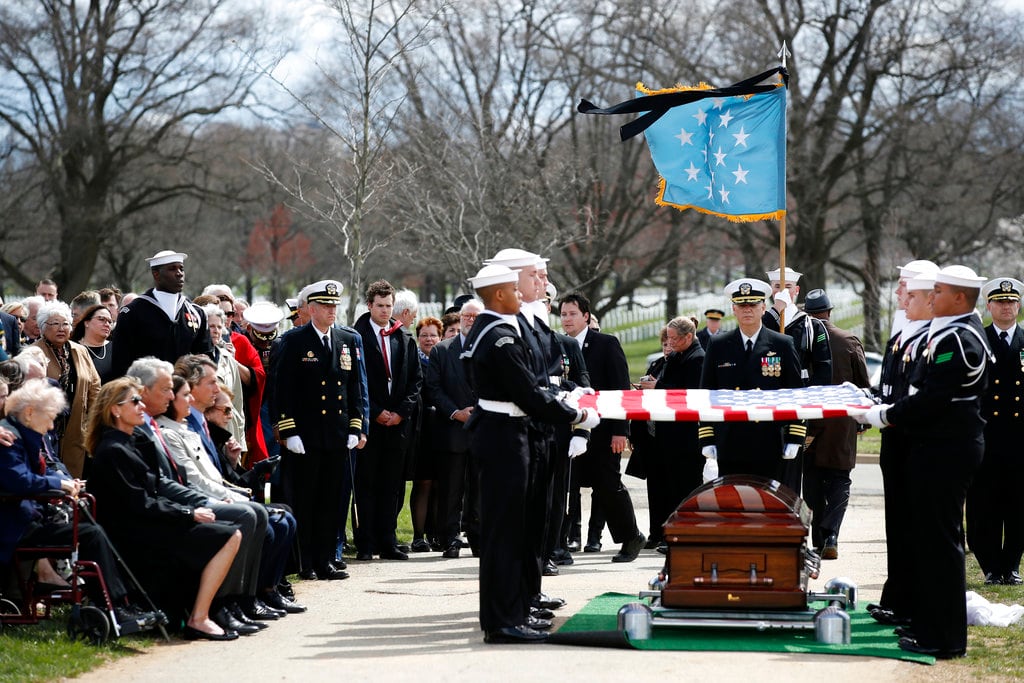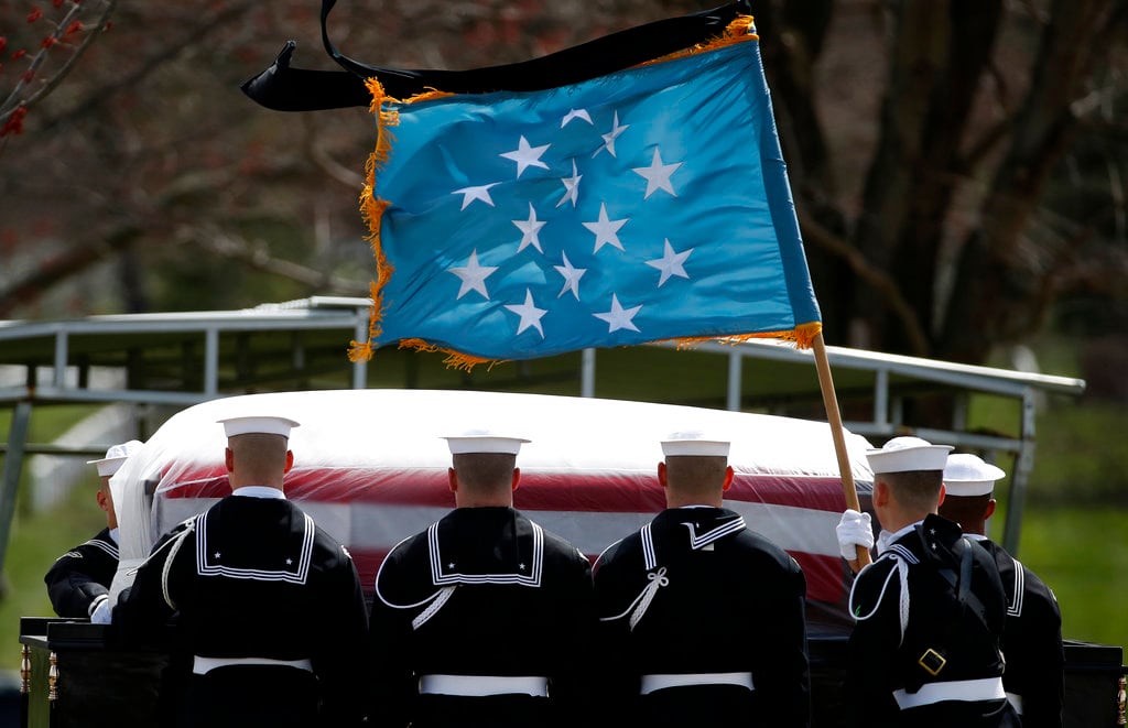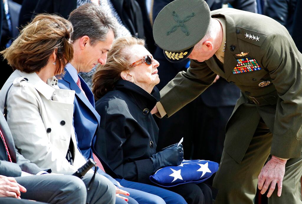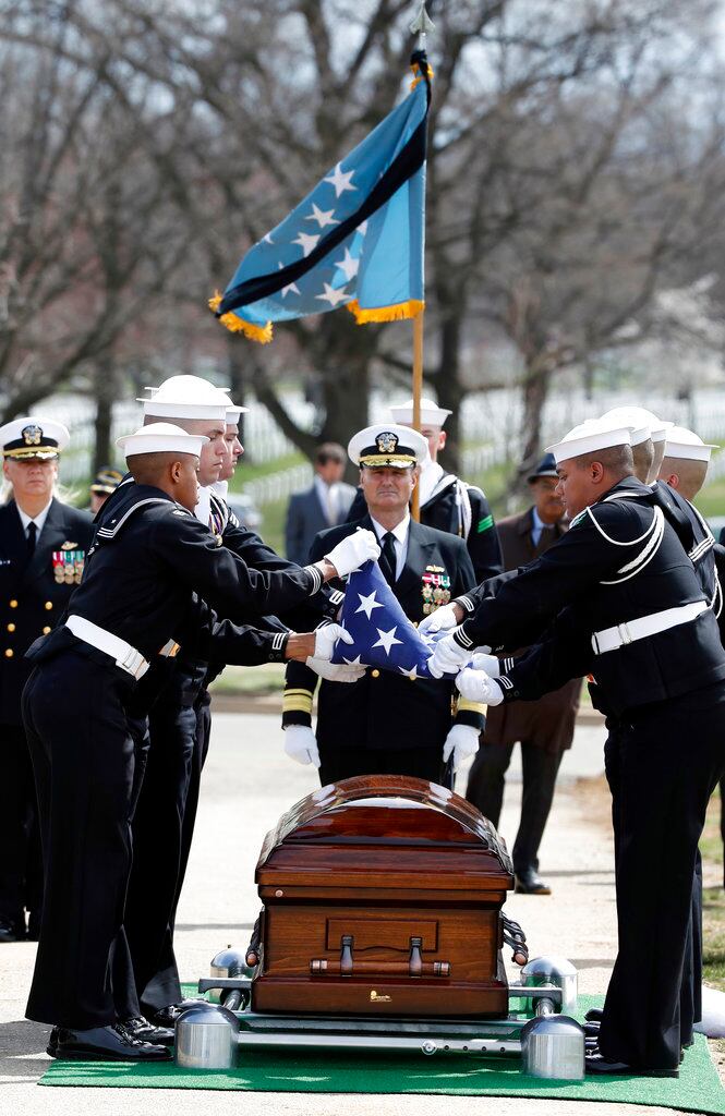 A horse drawn caisson arrives through the McClellan Gate for burial services for Capt. Thomas J. Hudner Jr., a naval aviator and Medal of Honor recipient from Concord, Mass., at Arlington National Cemetery Wednesday, April 4, 2018 in Arlington, Va. Hudner earned the Medal of Honor for his actions in the Battle of the Chosin Reservoir during the Korean War. (Alex Brandon/AP)The flag is folded during burial services for Capt. Thomas J. Hudner Jr., a naval aviator and Medal of Honor recipient from Concord, Mass., at Arlington National Cemetery Wednesday, April 4, 2018, in Arlington, Va. Hudner earned the Medal of Honor for his actions in the Battle of the Chosin Reservoir during the Korean War. (Alex Brandon/AP)The casket team prepares to fold the flag during burial services for Capt. Thomas J. Hudner Jr., a naval aviator and Medal of Honor recipient from Concord, Mass., at Arlington National Cemetery Wednesday, April 4, 2018 in Arlington, Va. Hudner earned the Medal of Honor for his actions in the Battle of the Chosin Reservoir during the Korean War. (Alex Brandon/AP)The Medal of Honor flag flies during burial services for Capt. Thomas J. Hudner Jr., a naval aviator and Medal of Honor recipient from Concord, Mass., at Arlington National Cemetery Wednesday, April 4, 2018 in Arlington, Va. Hudner earned the Medal of Honor for his actions in the Battle of the Chosin Reservoir during the Korean War. (Alex Brandon/AP)The firing party fires one of three volleys during burial services for Capt. Thomas J. Hudner Jr., a naval aviator and Medal of Honor recipient from Concord, Mass., at Arlington National Cemetery Wednesday, April 4, 2018 in Arlington, Va. Hudner earned the Medal of Honor for his actions in the Battle of the Chosin Reservoir during the Korean War.(Alex Brandon/AP)U.S. Navy Cmdr. Nathan Scherry, commanding officer, precommissioning unit, Thomas Hudner, right, gives condolences to Georgea Hudner, during burial services for her husband Capt. Thomas J. Hudner Jr., a naval aviator and Medal of Honor recipient from Concord, Mass., at Arlington National Cemetery Wednesday, April 4, 2018 in Arlington, Va. Hudner earned the Medal of Honor for his actions in the Battle of the Chosin Reservoir during the Korean War.(Alex Brandon/AP)Joint Chiefs Chairman Gen. Joseph Dunford, right, speaks with Georgea Hudner, during burial services for her husband, Capt. Thomas J. Hudner Jr., a naval aviator and Medal of Honor recipient from Concord, Mass., at Arlington National Cemetery Wednesday, April 4, 2018 in Arlington, Va. Hudner earned the Medal of Honor for his actions in the Battle of the Chosin Reservoir during the Korean War.(Alex Brandon/AP)The flag is presented by U.S. Navy Rear Adm. William Galinis, right, to Georgea Hudner, during burial services for her husband, Capt. Thomas J. Hudner Jr., a naval aviator and Medal of Honor recipient from Concord, Mass., at Arlington National Cemetery Wednesday, April 4, 2018 in Arlington, Va. Hudner earned the Medal of Honor for his actions in the Battle of the Chosin Reservoir during the Korean War. (Alex Brandon/AP)A flyover of F-18 Superhornets from Strike Fighter Squadron VFA 32 flies over during burial services for Capt. Thomas J. Hudner Jr., a naval aviator and Medal of Honor recipient from Concord, Mass., at Arlington National Cemetery Wednesday, April 4, 2018 in Arlington, Va. Hudner earned the Medal of Honor for his actions in the Battle of the Chosin Reservoir during the Korean War. (Alex Brandon/AP)In this July 12, 2013, file photo, retired U.S. Navy Capt. Thomas Hudner, who was awarded the Medal of Honor by President Truman, poses on the porch at his home in Concord, Mass. Hudner intentionally crashed his plane during the Korean War in 1950 to try to save his wingman Jesse Brown, whose plane had been shot down. Hudner died Monday, Nov. 13, 2017, at age 93, and will be buried Wednesday, April 4, 2018, at Arlington National Cemetery in Arlington, Va. (Charles Krupa/AP)
