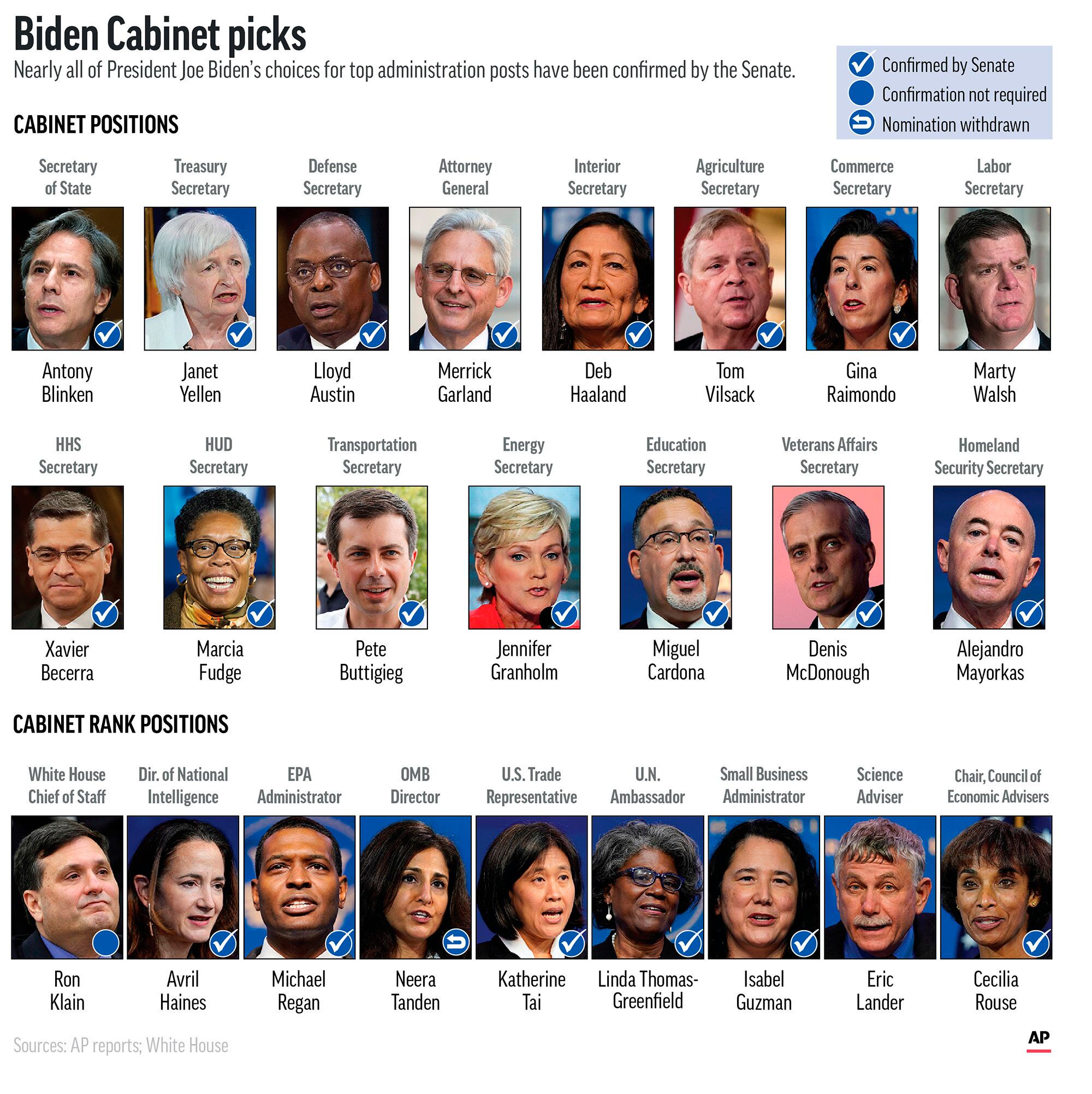 Biden has about 1,250 federal positions that require Senate confirmation, ranging from the head of the obscure Railroad Retirement Board to more urgent department positions such as assistant and deputy secretaries. Of the 790 being tracked by the Partnership for Public Service, a nonpartisan good-government group, 23 appointees have been confirmed by the Senate, 39 are being considered by the Senate, and 466 positions have no named nominee.