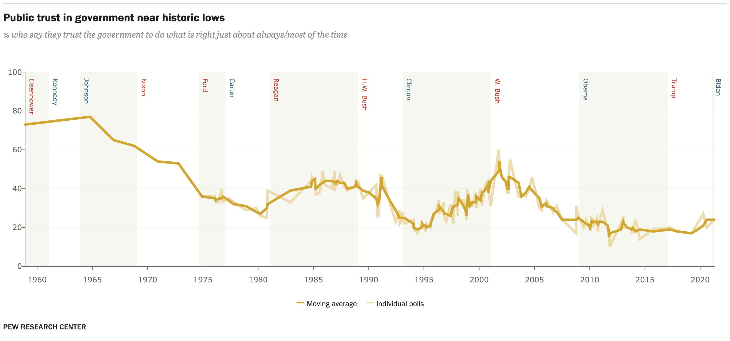 Meanwhile, the Pew Research Center shows in a September report that public trust in government has fallen once again to near-record lows. Further, while public views of lawmakers have historically been poor,” the share of Americans giving Congress an unfavorable rating is now among the highest in nearly four decades of polling,” according to the report.