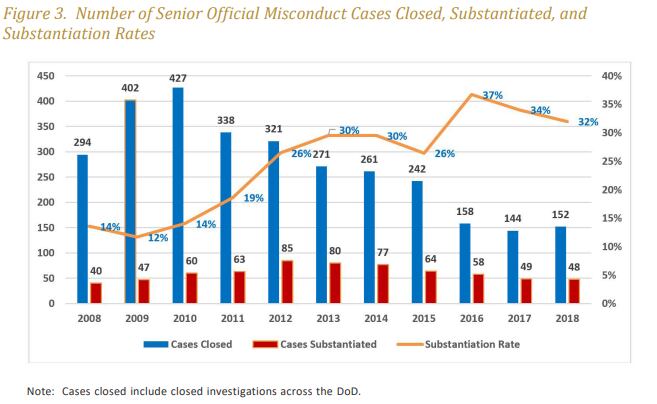 In 2018, 48 military and civilian brass had misconduct allegations substantiated against them, down from 49 in 2017, 58 in 2016 and 64 in 2015.