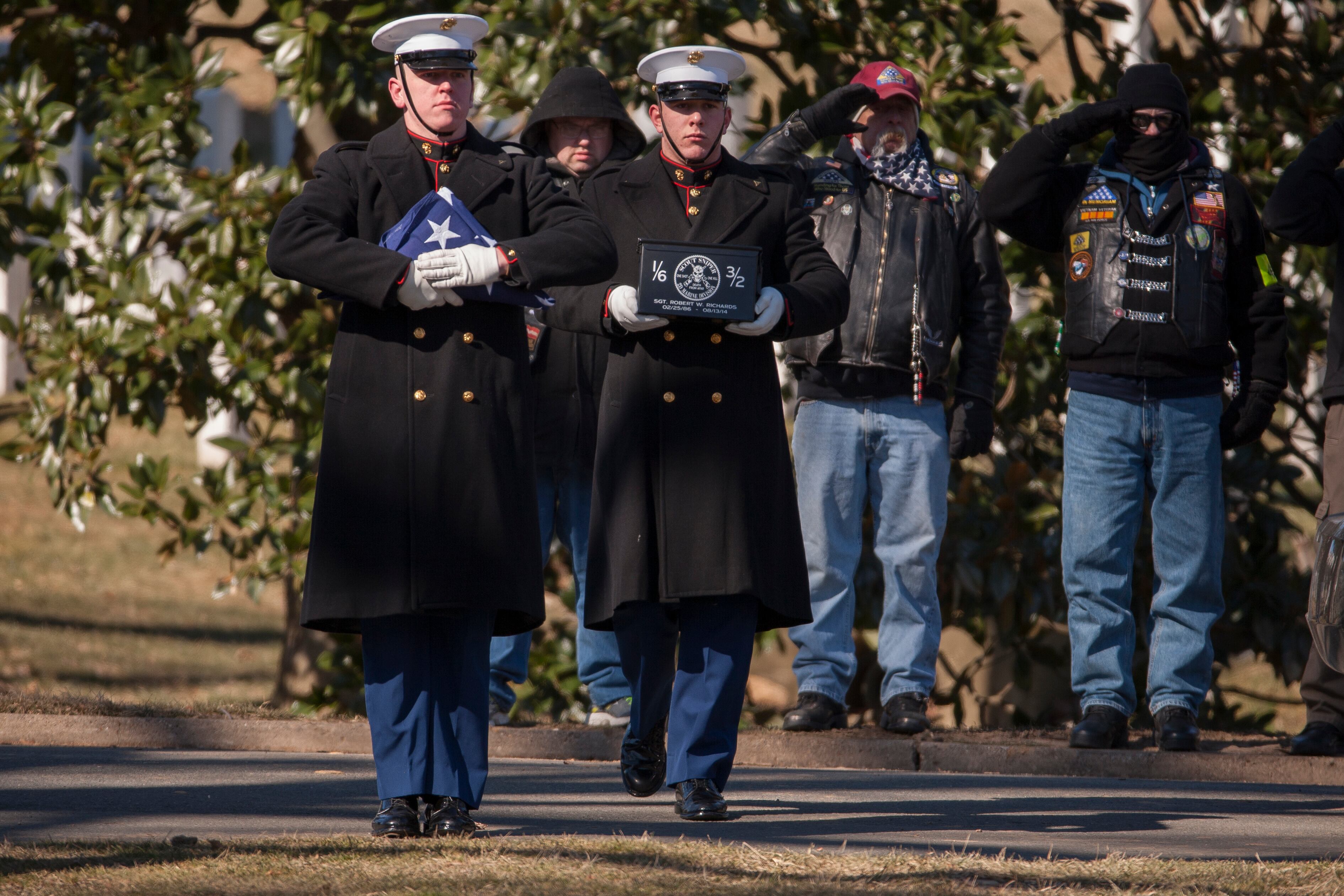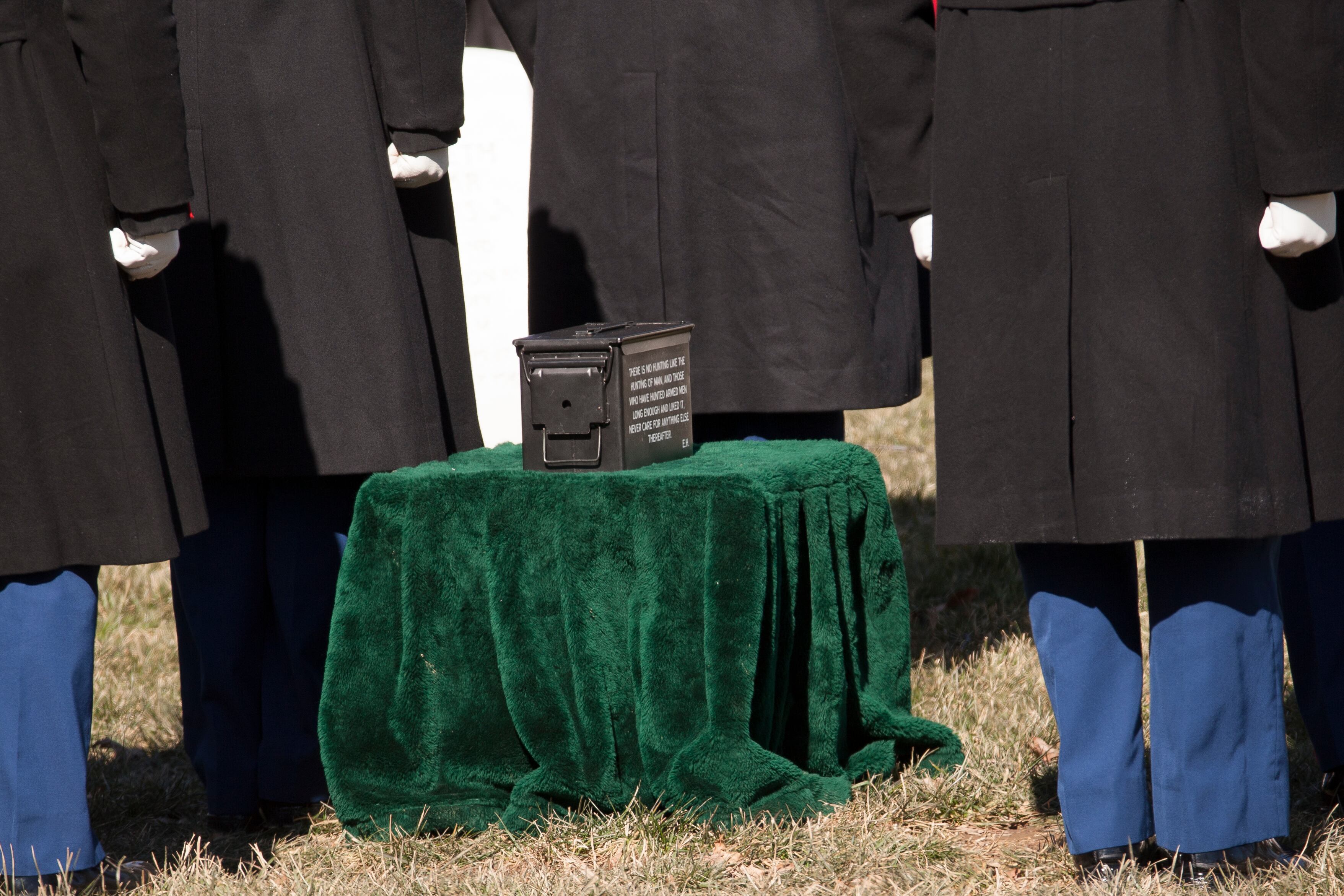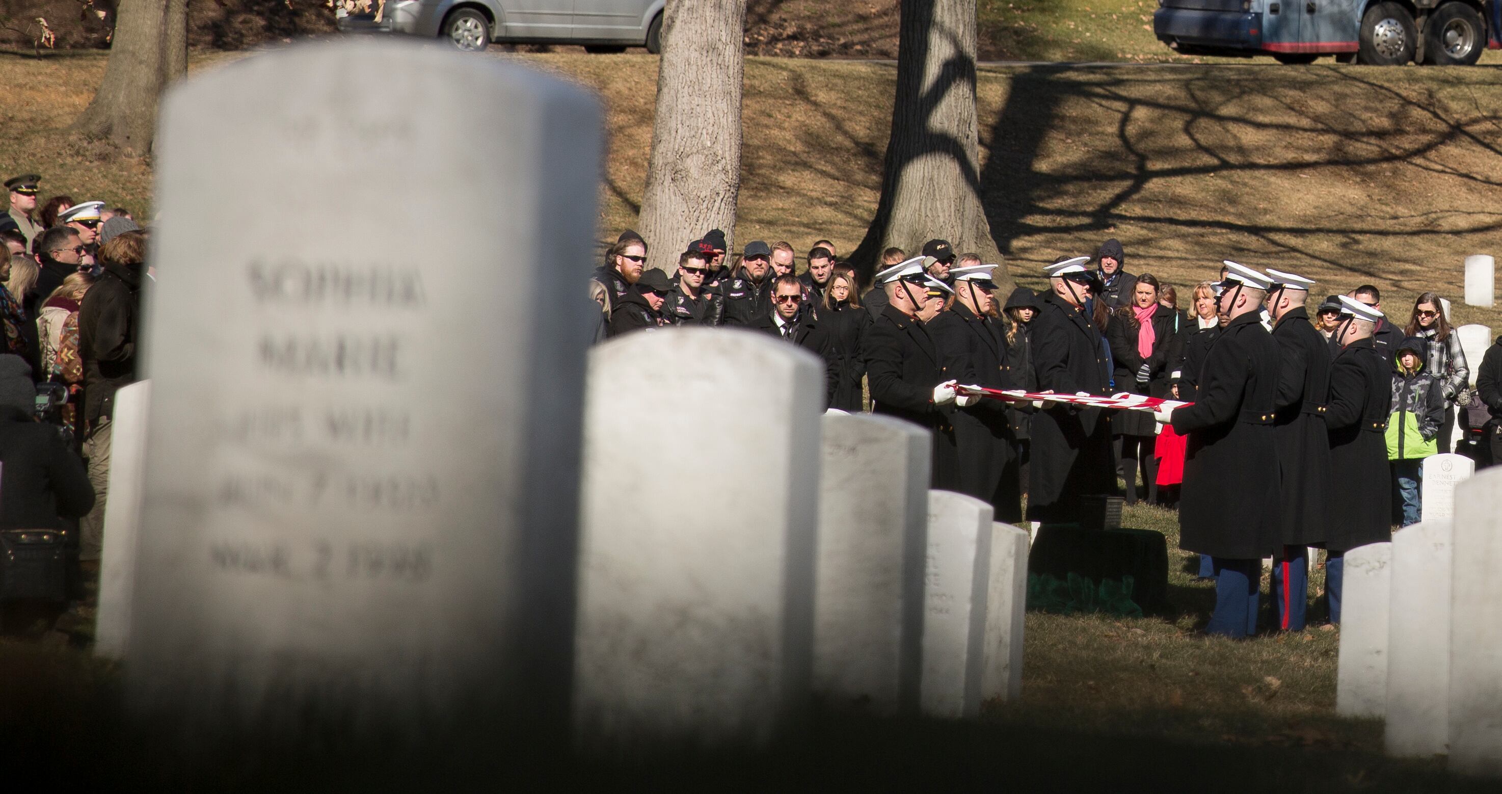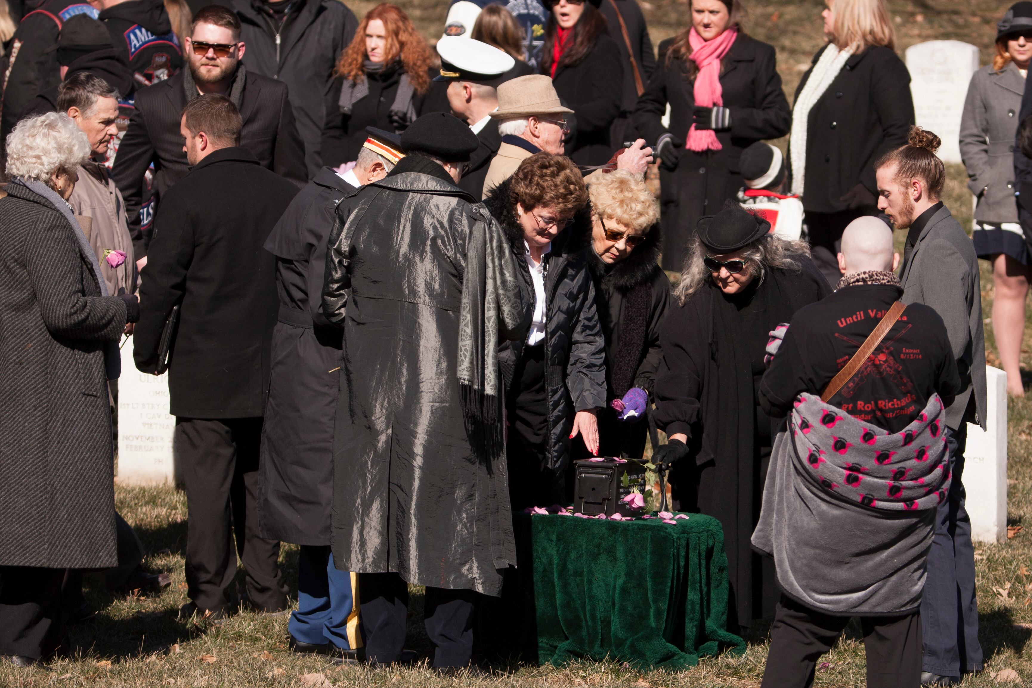 Gunnery Sgt. Robert Singer, a bugler with the U.S. Marine band waits for the burial service for retired Marine Cpl. Rob Richards to begin at Arlington National Cemetery in Arlington, Va., on Friday, February 13, 2015. (Mike Morones/Staff)Marines from Marine Barracks Washington carry the remains of retired Marine Cpl. Rob Richards at Arlington National Cemetery in Arlington, Va., on Friday, February 13, 2015. Richards, a former sniper with 1/6 and 3/2 died at his home in August, 2014. (Mike Morones/Staff)Raechel Richards is joined by friends and family for a burial service for her husband retired Marine Cpl. Rob Richards at Arlington National Cemetery on February 13, 2015. (Mike Morones/Staff)Marines from Marine Barracks Washington conduct a burial service for retired Marine Cpl. Rob Richards at Arlington National Cemetery in Arlington, Va., on Friday, February 13, 2015. Richards, a former sniper with 1/6 and 3/2 died at his home in August, 2014. (Mike Morones/Staff)Friends and family attend a burial service for retired Marine Cpl. Rob Richards at Arlington National Cemetery in Arlington, Va., on Friday, February 13, 2015. (Mike Morones/Staff)Marines from Marine Barracks Washington fire a volley at the burial service for retired Marine Cpl. Rob Richards at Arlington National Cemetery in Arlington, Va., on Friday, February 13, 2015. (Mike Morones/Staff)Raechel Richards, right, is joined by her mother-in-law Cate Richards and other family members at a burial service for her husband retired Marine Cpl. Rob Richards at Arlington National Cemetery in Arlington, Va., on Friday, February 13, 2015. (Mike Morones/Staff)Master Sgt. Leonard J. Spain presents a flag to Raechel Richards during the burial service for her husband retired Marine Cpl. Rob Richards at Arlington National Cemetery in Arlington, Va., on Friday, February 13, 2015. (Mike Morones/Staff)Raechel Richards had the remains of her husband, retired Marine Cpl. Rob Richards, placed in a custom ammunition can. Richards, a former sniper in 1/6 and 3/2, was buried at Arlington National Cemetery in Arlington, Va., on Friday, February 13, 2015. (Mike Morones/Staff)Cate Richards touches the custom ammunition can containing the remains of her son, retired Marine Cpl. Rob Richards at Arlington National Cemetery in Arlington, Va., on Friday, February 13, 2015. Richards was a scout sniper in 1/6 and 3/2. (Mike Morones/Staff)Friends and family gather around the remains of retired Marine sniper Cpl. Rob Richards following a burial service at Arlington National Cemetery in Arlington, Va., on Friday, February 13, 2015. (Mike Morones/Staff)