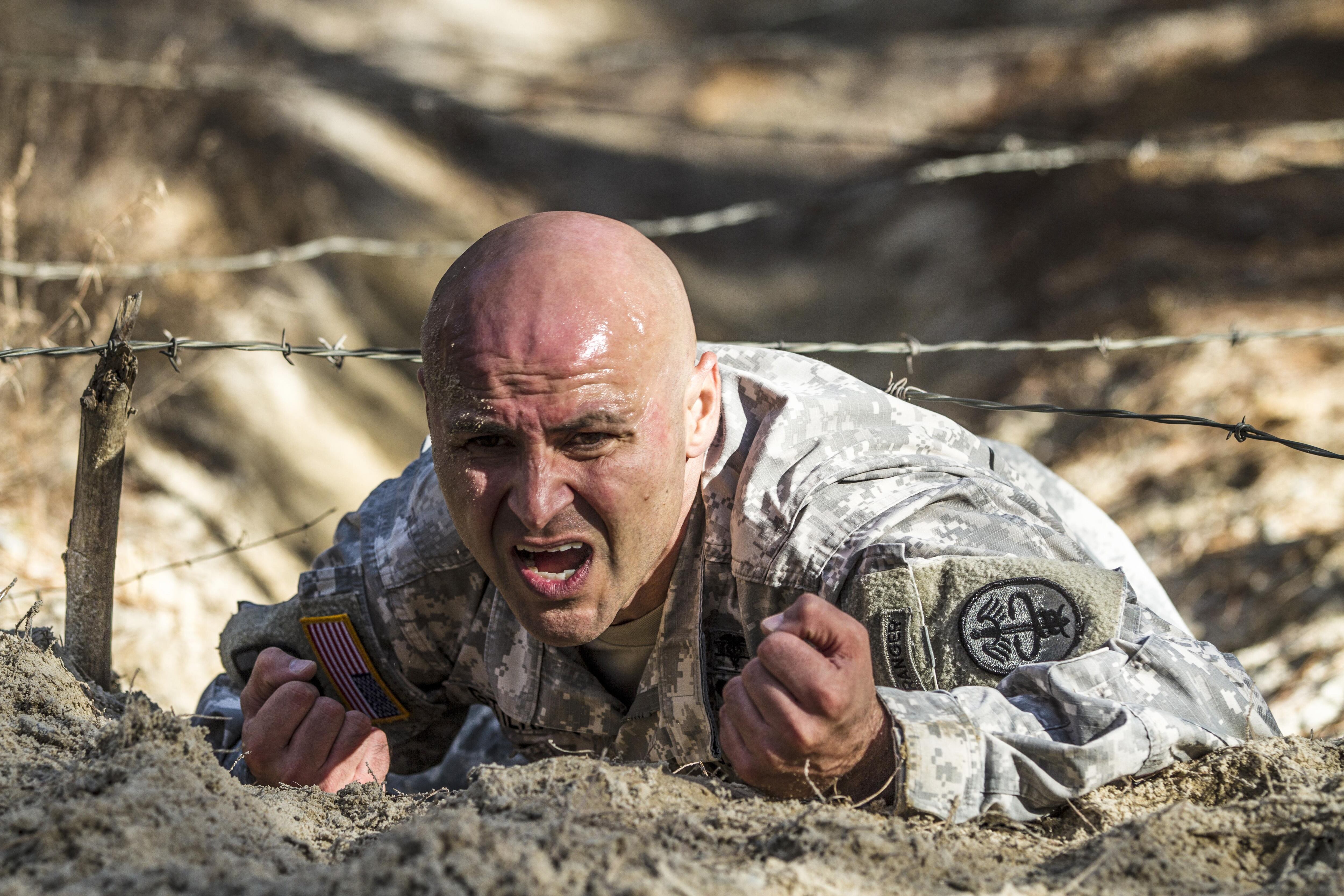 Army 1st Sgt. Ricardo Gutierrez low-crawls under a wire obstacle during the assessment phase of the Best Ranger competition on Fort Jackson, S.C., Nov. 24, 2015. Gutierrez is one of three Fort Jackson soldiers fighting for a position on a two-soldier team that will represent the post during the 33rd annual competition on Fort Benning, Ga., in April 2016. U.S. Army photo by Sgt. 1st Class Brian Hamilton
