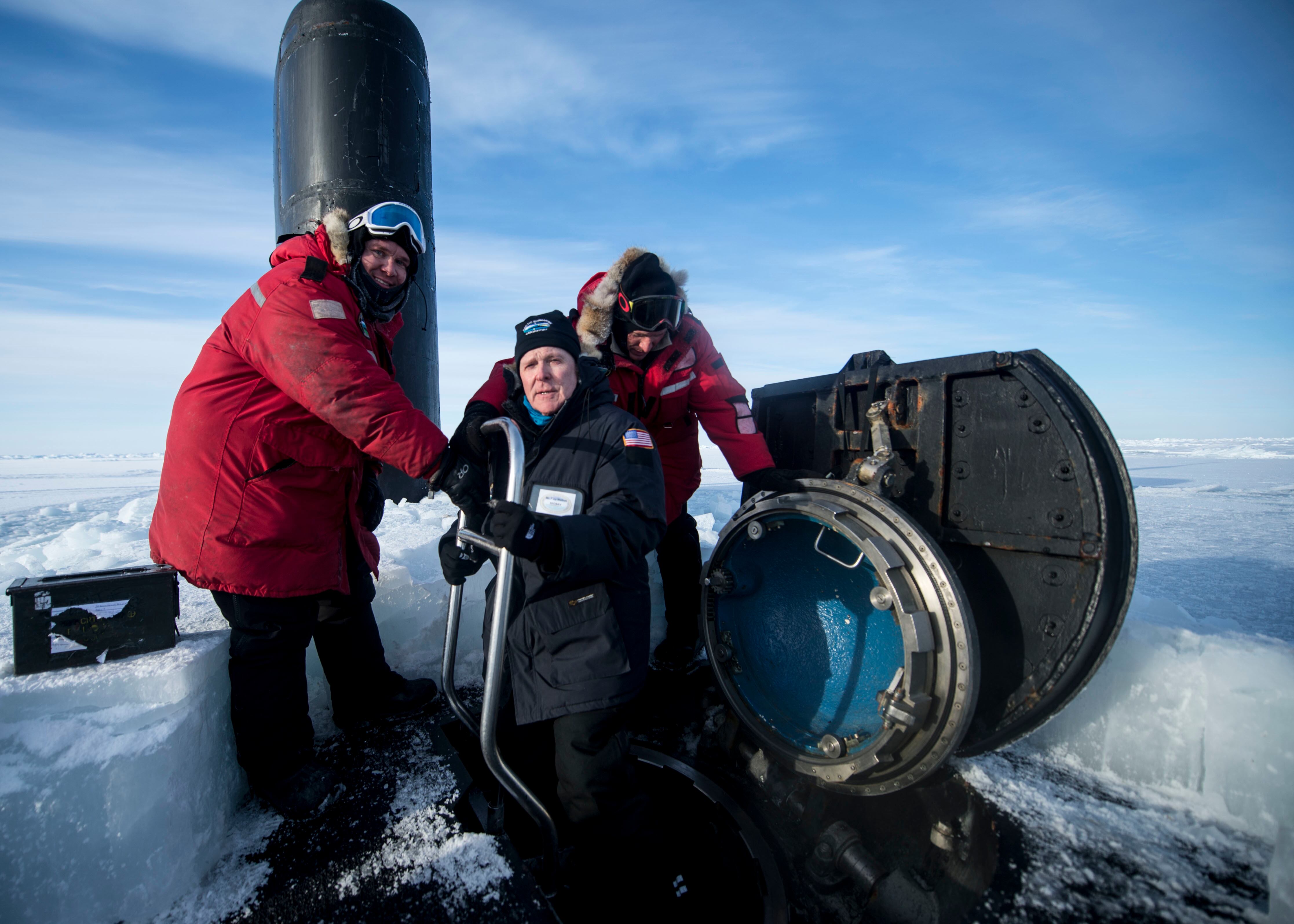 ARCTIC CIRCLE (March 15, 2016) Secretary of the Navy (SECNAV) Ray Mabus greets the captain and the chief of the boat as he boards the Los Angeles-class fast attack submarine USS Hampton (SSN 757) during Ice Exercise (ICEX) 2016. ICEX 2016 is a five-week exercise designed to research, test, and evaluate operational capabilities in the region. ICEX 2016 allows the U.S. Navy to assess operational readiness in the Arctic, increase experience in the region, advance understanding of the Arctic environment, and develop partnerships and collaborative efforts. (U.S. Navy photo by Mass Communication Specialist 2nd Class Tyler Thompson/Released)160318-N-QA919-234 Join the conversation: http://www.navy.mil/viewGallery.asp http://www.facebook.com/USNavy http://www.twitter.com/USNavy http://navylive.dodlive.mil http://pinterest.com https://plus.google.com