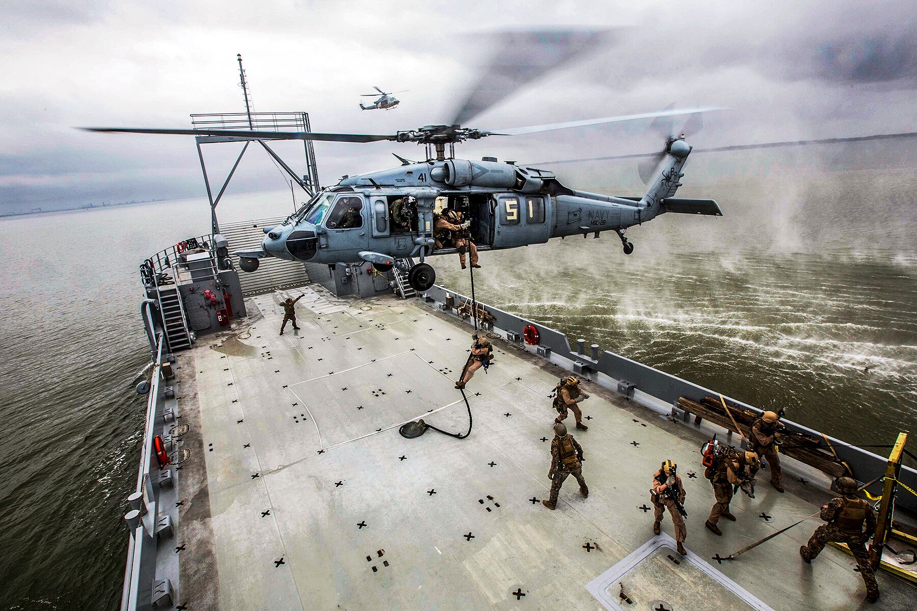 Marines fast rope from an SH-60 Seahawk helicopter onto a ship during visit, board, search and seizure training off the coast of Joint Base Langley-Eustis, Va., April 14, 2015.