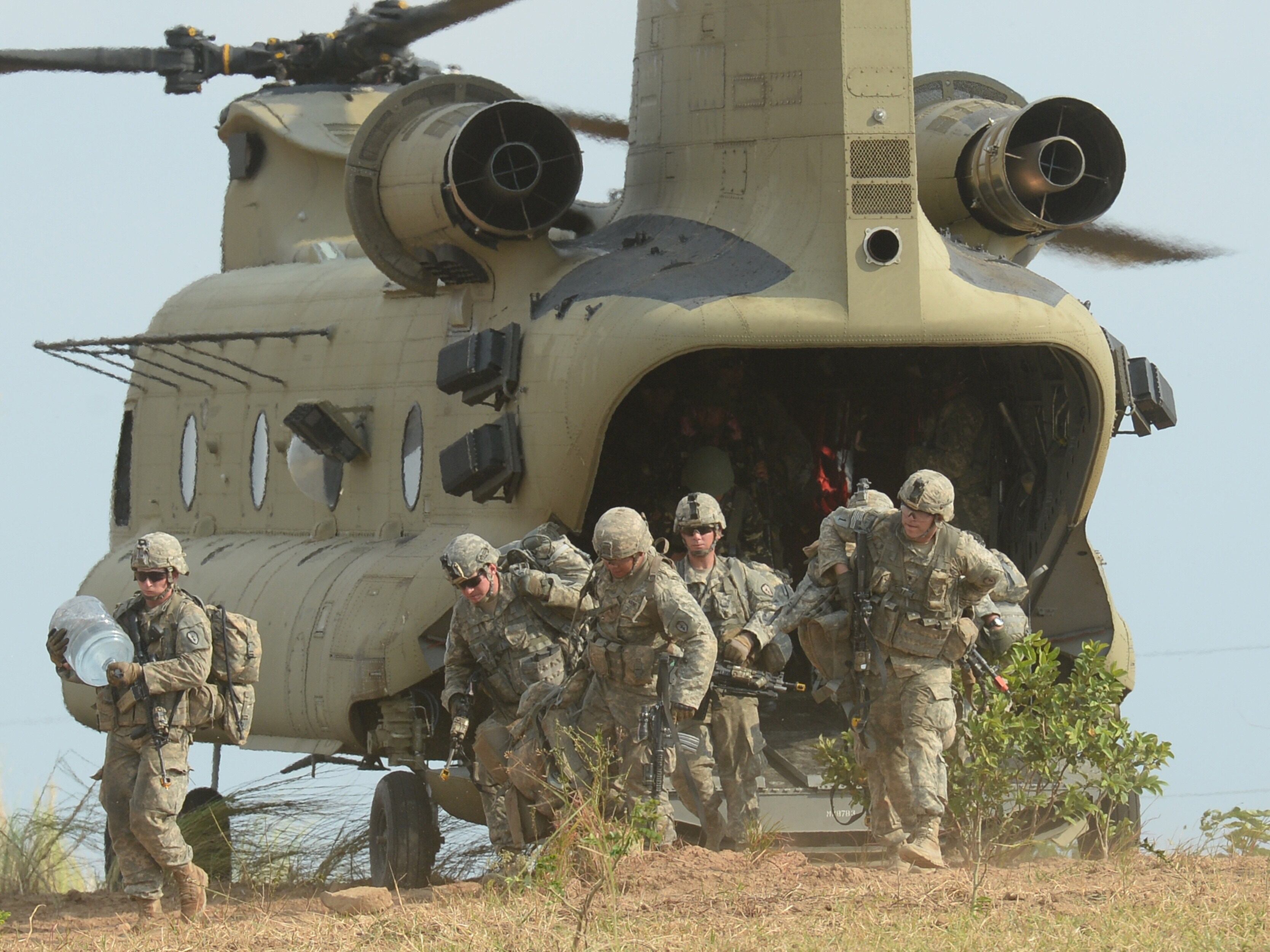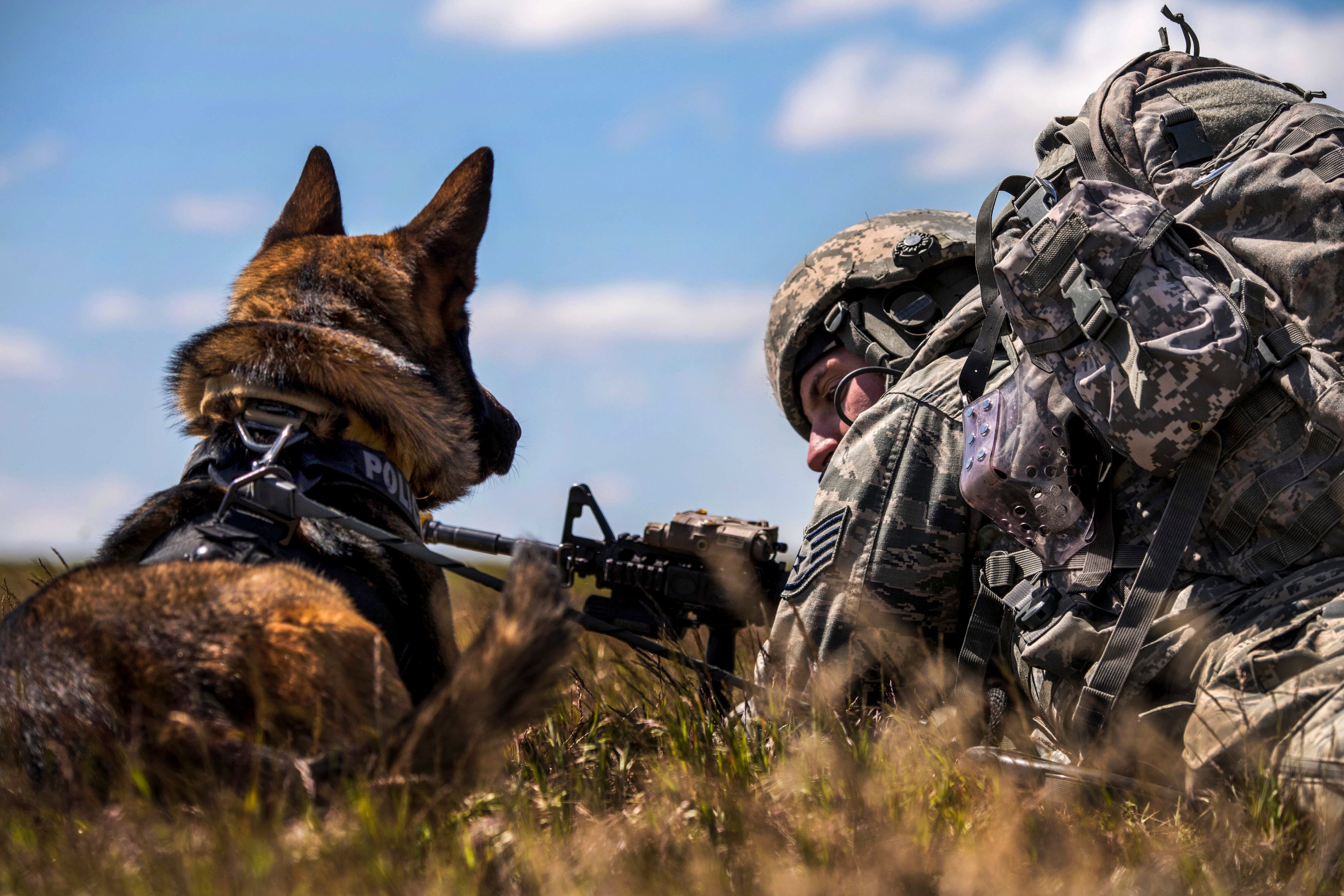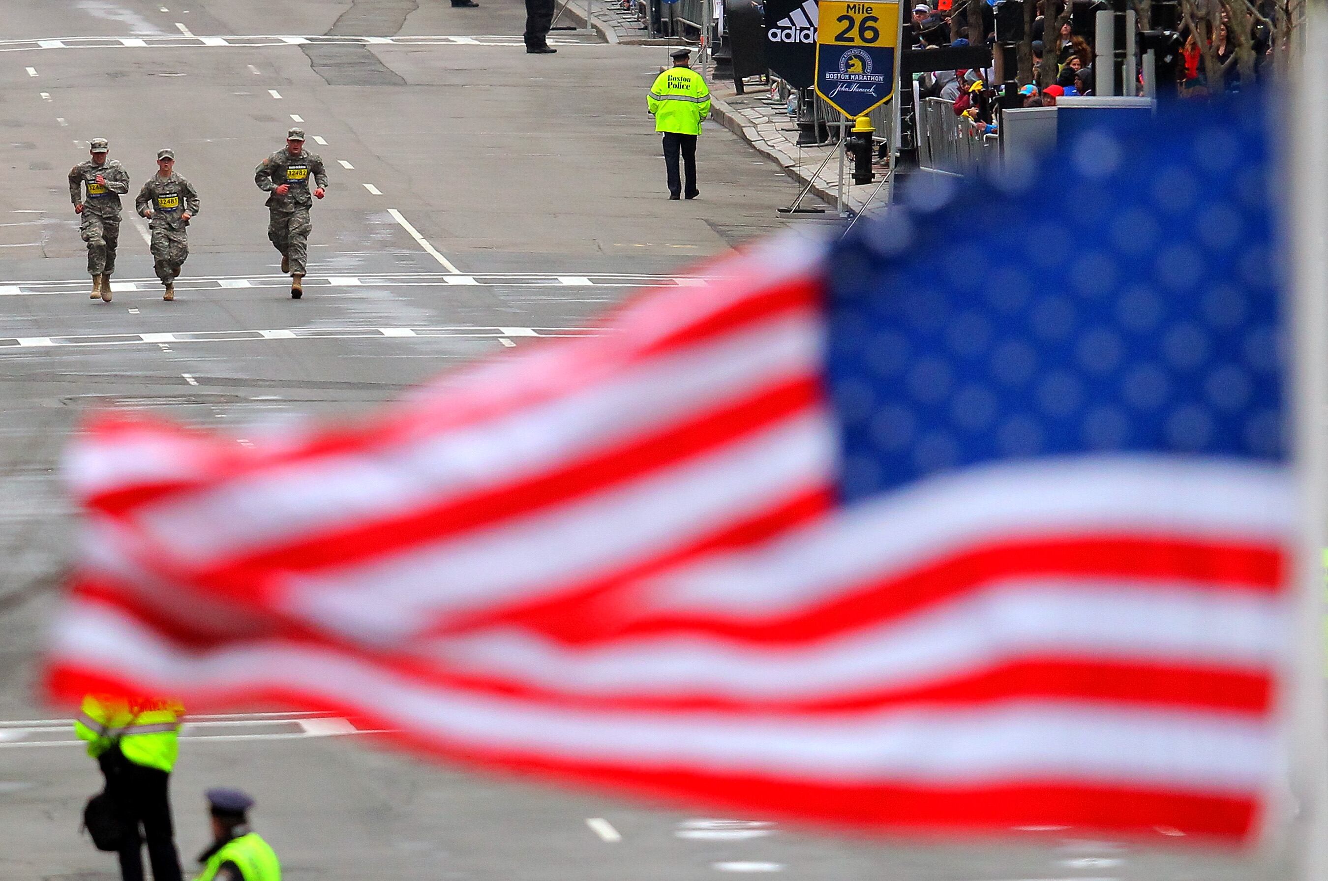U.S. Marine Corps photo by Lance Cpl. Andre Dakis US army soldiers from 2nd Stryker Brigade Combat of the 5th Infantry Division based in Hawaii take their positions after disembarking from a CH-47 Chinook helicopter during an air assault exercise with their Philippine counterparts inside the military training camp of Fort Magsaysay in Nueva Ecija province north of Manila on April 20, 2015, at the start of the joint US-Philippines annual military exercise. The Philippines voiced alarm April 20 about Chinese "aggressiveness" in disputed regional waters as it launched giant war games with the United States that were partly aimed at warning China. AFP PHOTO/TED ALJIBETED ALJIBE/AFP/Getty ImagesBOSTON, MA - APRIL 20: Military service members run down Boylston Street during the 119th Boston Marathon on April 20, 2015 in Boston, Massachusetts. (Photo by Mike Lawrie/Getty Images)Air Force Staff Sgt. Joshua Rettschlag talks to his military dog, Onur, during Gunfighter Flag 15-2 on Saylor Creek Range, Idaho, April 15, 2015. Rettschlag is a military working dog handler assigned to the 366th Security Forces Squadron, which participated in the exercise to train in realistic scenarios with joint service members in a tactical environment.