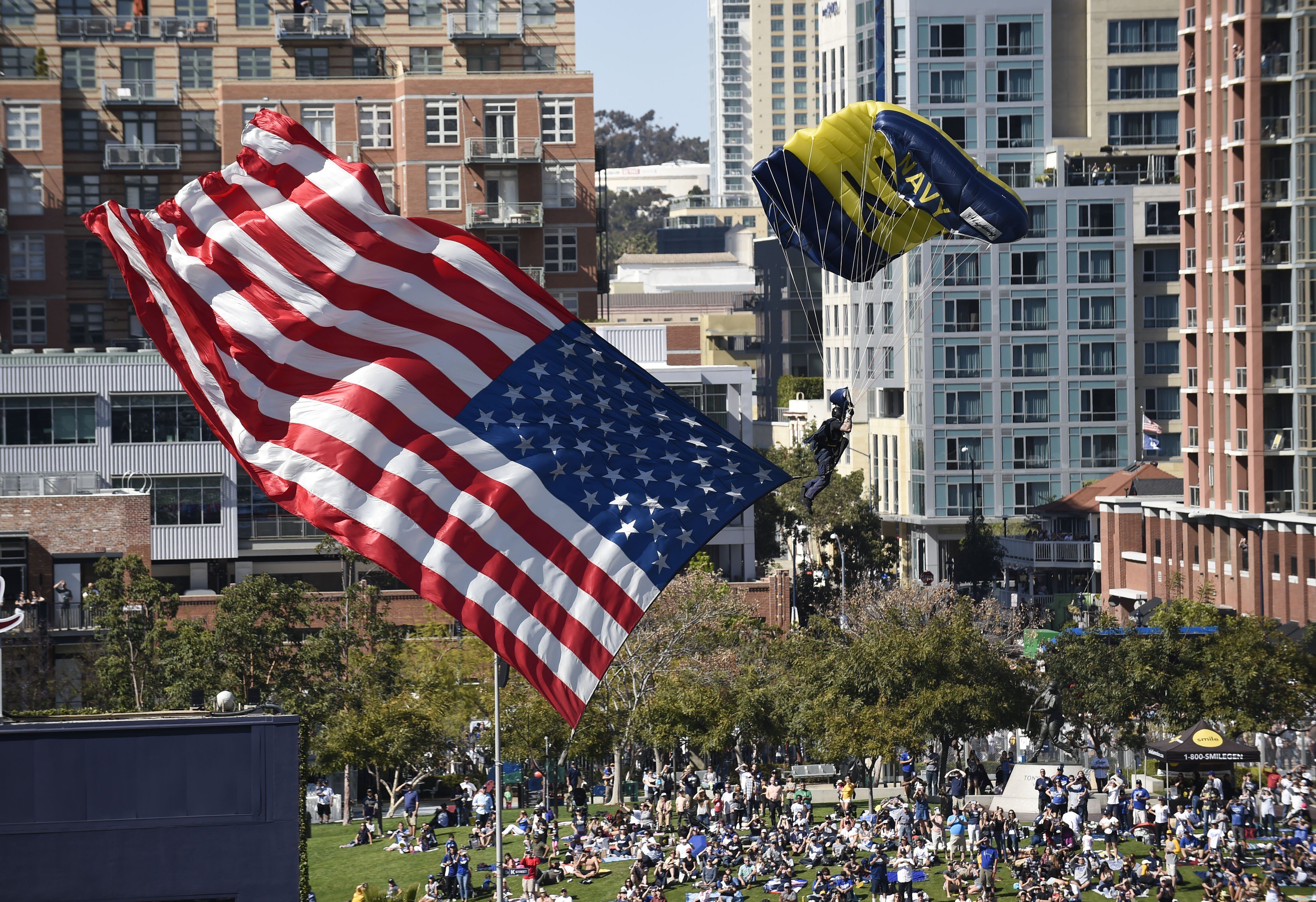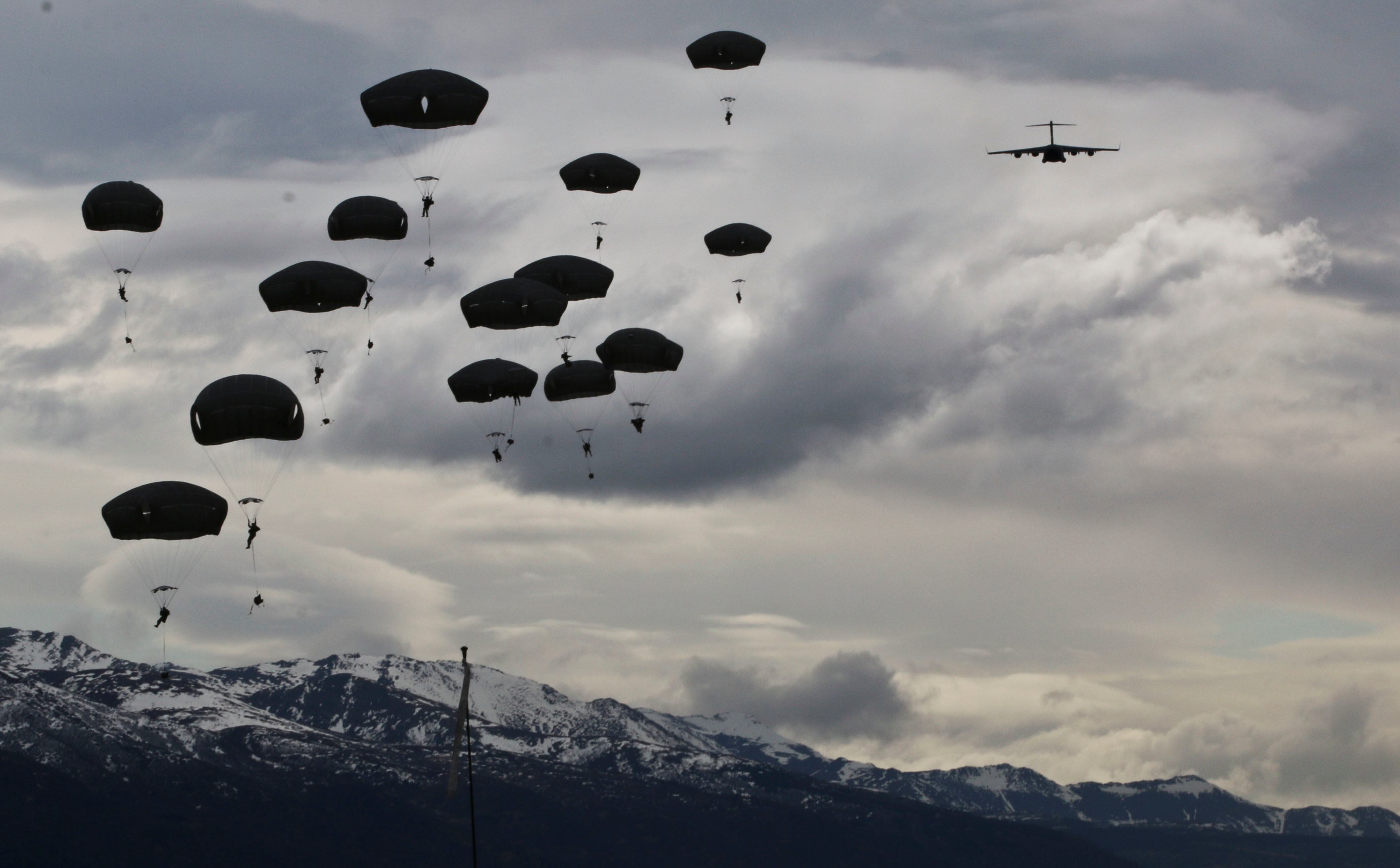 U.S. Army Paratroopers with 2nd Battalion (Airborne), 377th Field Artillery, 4th Infantry Brigade Combat Team (Airborne), 25th Infantry Division participate in an airborne operation at Malemute Drop Zone, Joint Base Elemendorf-Richardson, Alaska, April 5, 2016. (U.S. Army photo by Staff Sgt. Brian Ragin)Staff Sgt. John Ross and Spc. Alex Spears, both with 501st Chemical Biological Radiological Nuclear and Explosive Company, 23rd Chemical Battalion, 2nd Infantry Division, Explosive Ordnance Disposal team complete a CBRNE Exploitation Evaluation at Black Village to destroy and disable the manufacturing equipment Republic of Korea, March 23.A Dover C-17A Globemaster III expends countermeasure flares to defeat a simulated surface-to-air missile, or smokey SAM, shot from a Man-Portable Aircraft Survivability Trainer system during a training mission March 24, 2016, at the Bollen Live-Fire Range Complex on Fort Indiantown Gap, Pa. A total of 240 flares were expended for the aircraft during the training mission. (U.S. Air Force photo/Senior Airman William Johnson)SAN DIEGO, CALIFORNIA - APRIL 04: A member of the U.S. Navy Seals Leapfrog team carrying an American flag lands on the field during pre-game festivities on Opening Day before a baseball game between the San Diego Padres and the Los Angeles Dodgers at PETCO Park on April 4, 2016 in San Diego, California. (Photo by Denis Poroy/Getty Images)160404-N-CM124-002