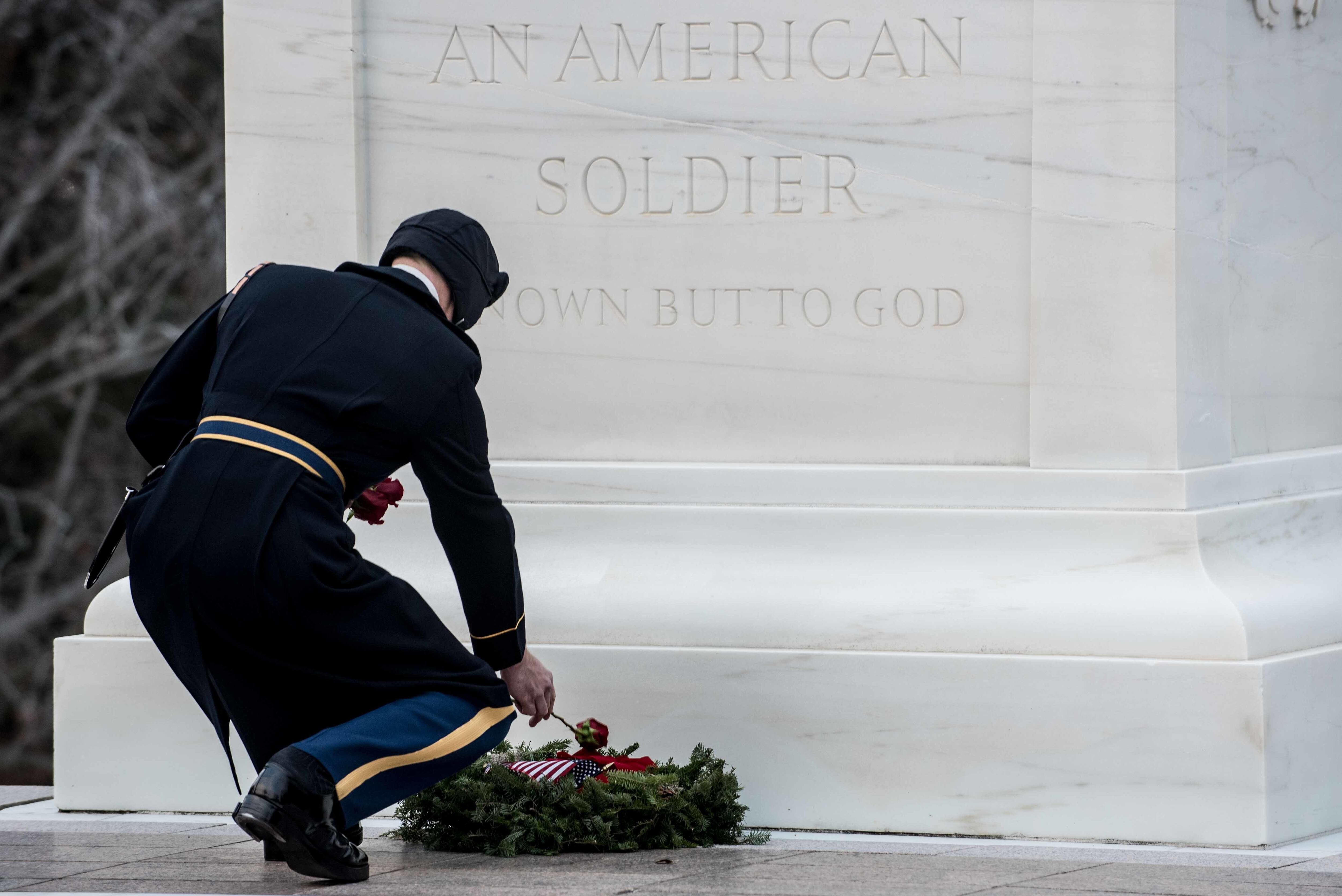 Staff Sgt. Robbie Petry, tomb sentinel, Tomb of the Unknown Soldier, 3rd U.S. Infantry Regiment (The Old Guard), places a rose at each of the four crypts of the Unknowns during his last walk ceremony Dec. 19 in Arlington National Cemetery, Va. Petry has the honor of being badge number 618. (U.S. Army photo by Spc. Cody W. Torkelson)Spc. Robert Brink, an engineer with the 36th Engineer Brigade, works on electrical conduit at the site of a new Ebola treatment unit being built in support of Operation United Assistance in Gbediah, Liberia, Dec. 19, 2014. United Assistance is a Department of Defense operation to provide command and control, logistics, training and engineering support to U.S. Agency for International Development-led efforts to contain the Ebola virus outbreak in West African nations. (U.S. Army Photo by Sgt. 1st Class Brien Vorhees, 55th Signal Company (Combat Camera) / Released)Marine Corps Cpl. Kuamutsua Xiong moves under the concealment of smoke during a combined arms exercise on Marine Corps Air Ground Combat Center, Twentynine Palms, Calif., Dec. 17, 2014. Xiong is a radio operator assigned to Battalion Landing Team 3rd Battalion, 1st Marine Regiment, 15th Marine Expeditionary Unit.