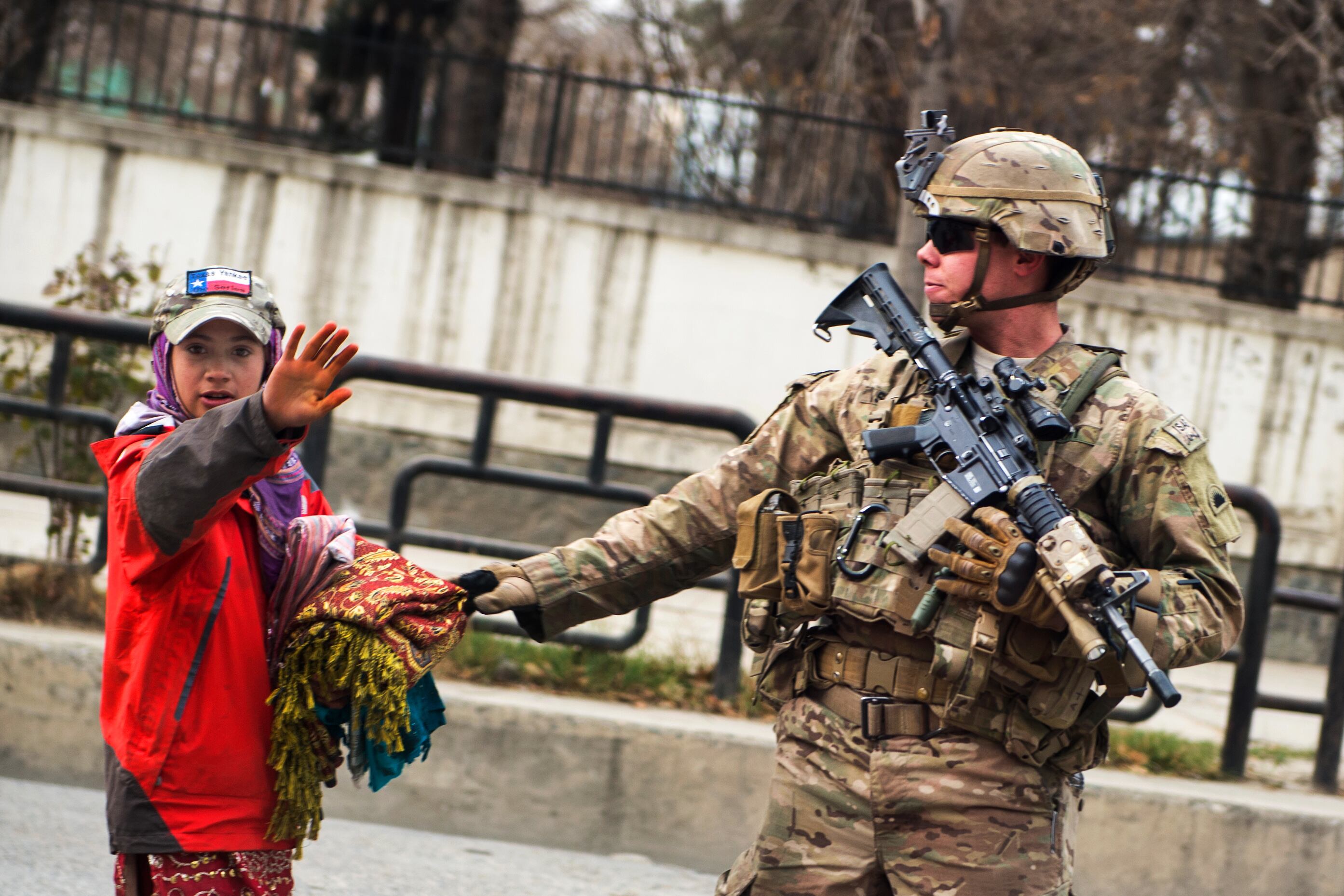 New Jersey National Guard photo by U.S. Air Force Tech. Sgt. Matt Hecht A U.S. soldier provides security as an Afghanistan child waves to International Security Assistance Force members as they pass by in Kabul, Afghanistan, Dec. 20, 2014.