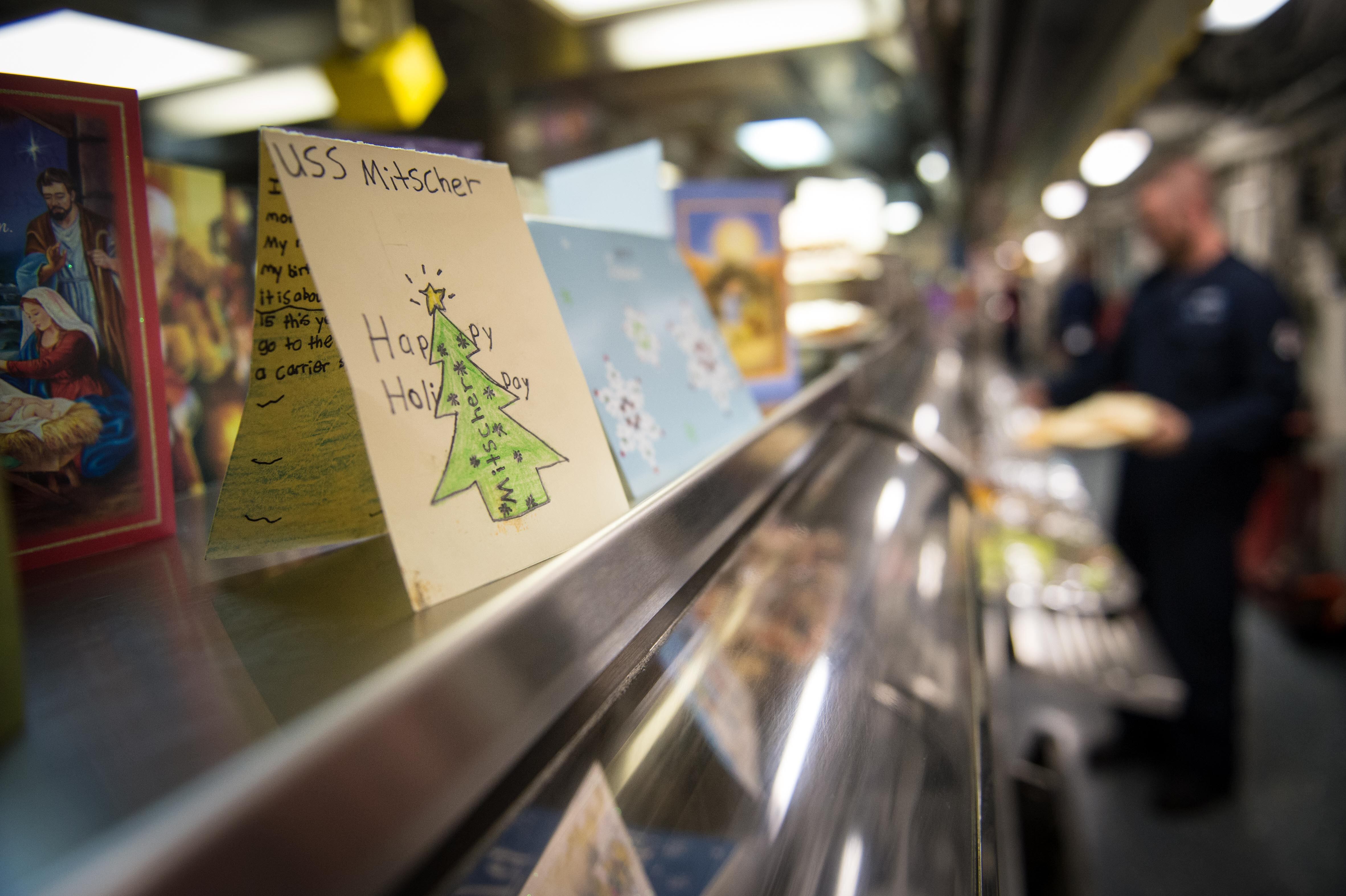 U.S. Navy photo by Petty Officer 2nd Class Alex King ARABIAN GULF (Dec. 16, 2014) Holiday greetings from schools in Virginia decorate the mess deck aboard the guided-missile destroyer USS Mitscher (DDG 57). Mitscher is deployed in the U.S. 5th Fleet area of responsibility supporting Operation Inherent Resolve, strike operations in Iraq and Syria as directed, maritime security operations, and theater security cooperation efforts in the region. (U.S. Navy photo by Mass Communication Specialist 2nd Class Anthony R. Martinez/Released) 141216-N-RB546-199