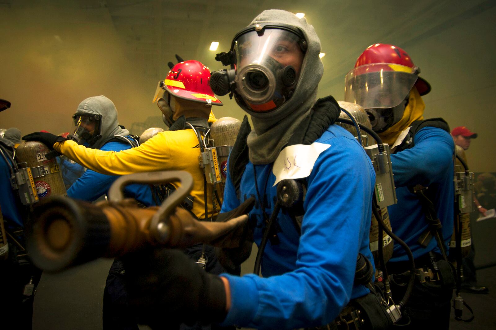 U.S. Army photo by Staff Sgt. Mikki L. Sprenkle U.S. sailors man a hose during a general quarters drill aboard the aircraft carrier USS Carl Vinson in the Arabian Gulf, Dec. 19, 2014.