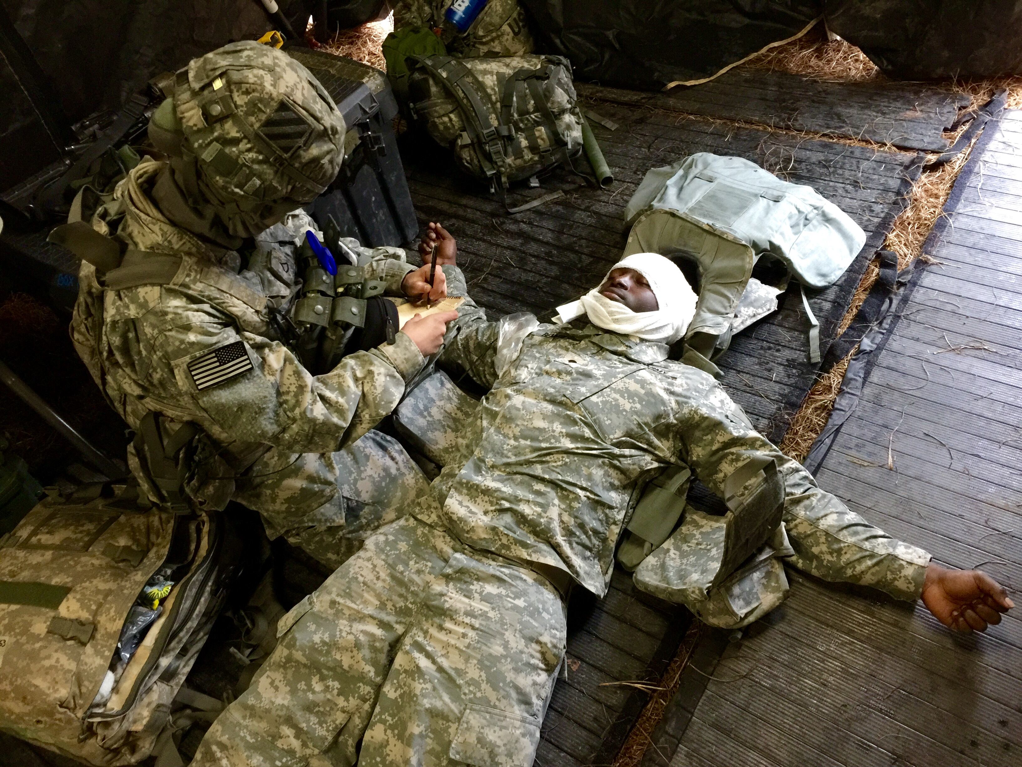 A soldier from the 4th Infantry Brigade Combat team has his simulated wounds tended to after an attack on his position during Vanguard Focus at Ft. Stewart, Georgia on February 24,2015. (Photo by Alan Lessig/Staff)I