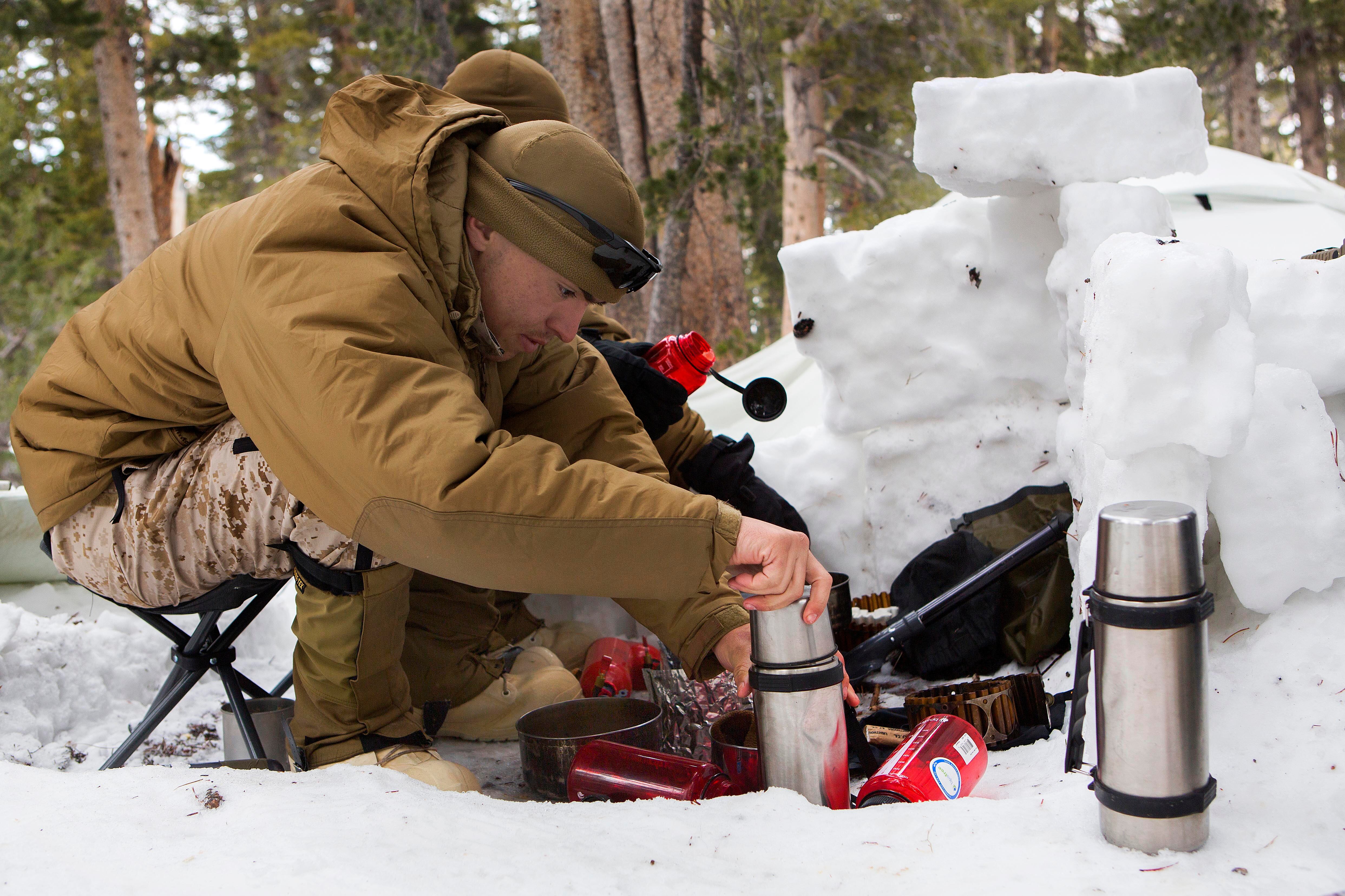 U.S. Army photo by Capt. Thomas Cieslak Marine Corps Lance Cpl. Ryan Molik prepares to melt snow to make drinking water for his fellow Marines during a training exercise on the U.S. Marine Corps Mountain Warfare Training Center in Bridgeport, Calif., Jan. 22, 2015. Molik is assigned to the Combat Logistics Battalion 26, 2nd Marine Logistics Group.