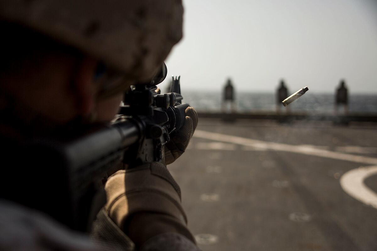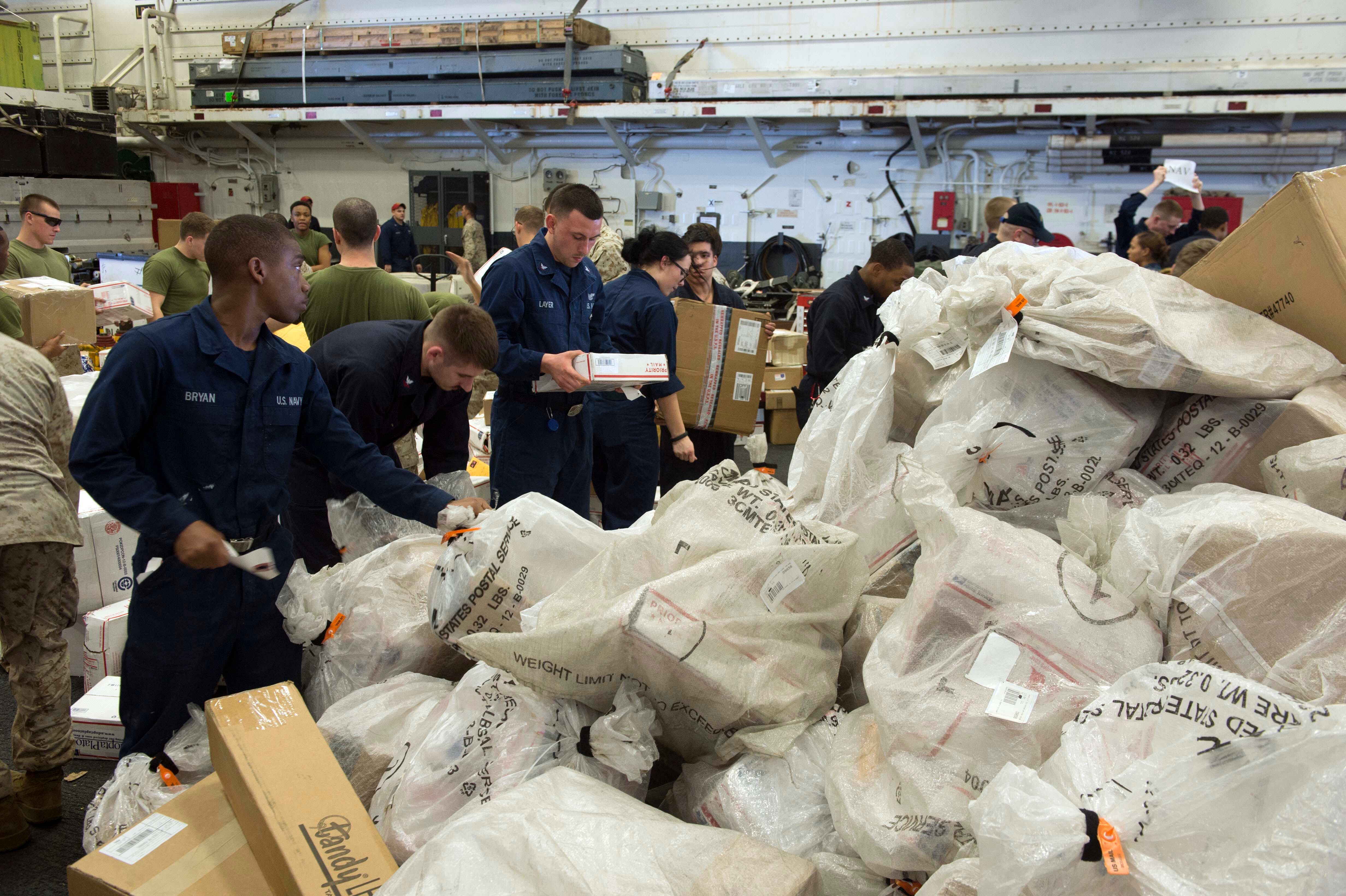 U.S. Marine Corps photo by Sgt. Anthony L. Ortiz Sailors and Marines sort mail aboard the amphibious assault ship USS Iwo Jima (LHD 7). Iwo Jima is the flagship for the Iwo Jima Amphibious Ready Group and, with the embarked 24th Marine Expeditionary Unit (24th MEU), provides a versatile sea-based, expeditionary force that can be tailored to a variety of missions in the U.S. 5th Fleet area of responsibility. (U.S. Navy photo by Mass Communication Specialist Seaman Magen F. Weatherwax/Released)U.S. Marine Corps Sgt. David Losacano fires an M4 carbine during a live-fire exercise aboard the amphibious dock landing ship USS Fort McHenry, Jan. 24, 2015. Losacano is a radio operator assigned to Combat Logistics Battalion 24, 24th Marine Expeditionary Unit.