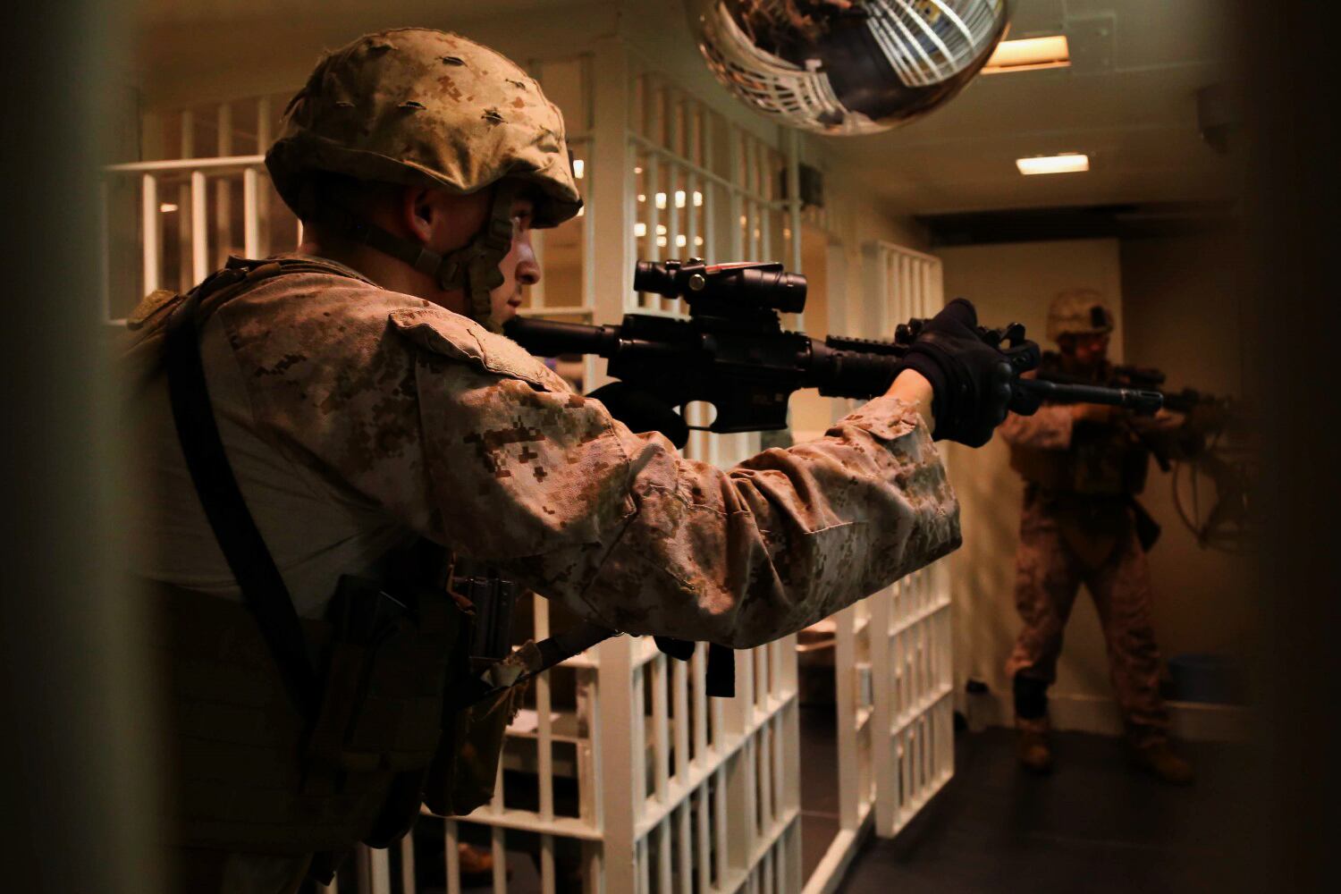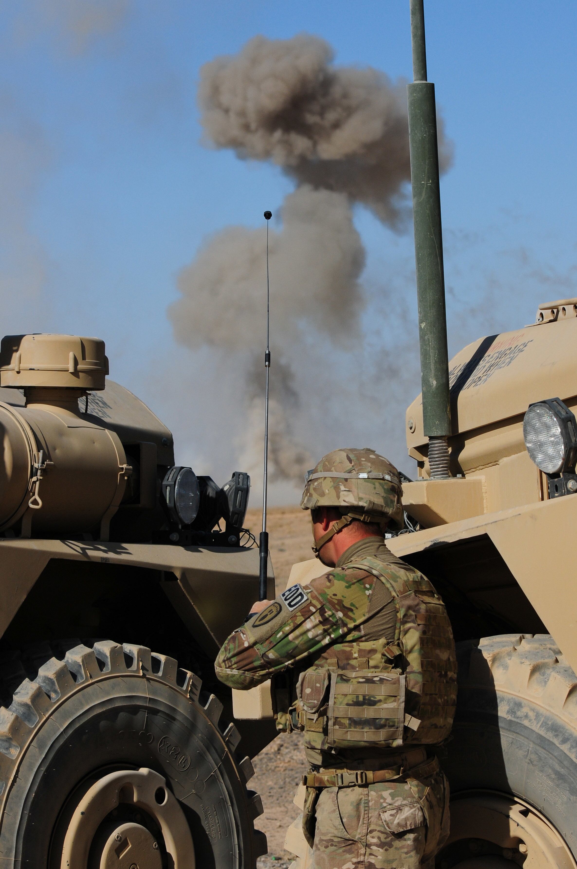 U.S. Army Spc. Anthony Buono, an explosive ordnance disposal technician with the 787th Ordnance Company, 3rd Ordnance Battalion, uses a remote control device to detonate expired and unserviceable explosives Oct. 15, 2014, near Kandahar Airfield, Afghanistan. (U.S. Army National Guard photo by Staff Sgt. Whitney Houston/Released)Cpl. Andrew J. Citriniti, a military policeman with the 11th Marine Expeditionary Unit (MEU), and Sauquoit, New York native, practices close quarter tactics aboard the USS Makin Island (LHD 8), Oct. 11. The Makin Island Amphibious Ready Group (ARG) and the embarked 11th MEU are deployed in support of maritime security operations and theater security cooperation efforts in the U.S. 5th Fleet area of responsibility.