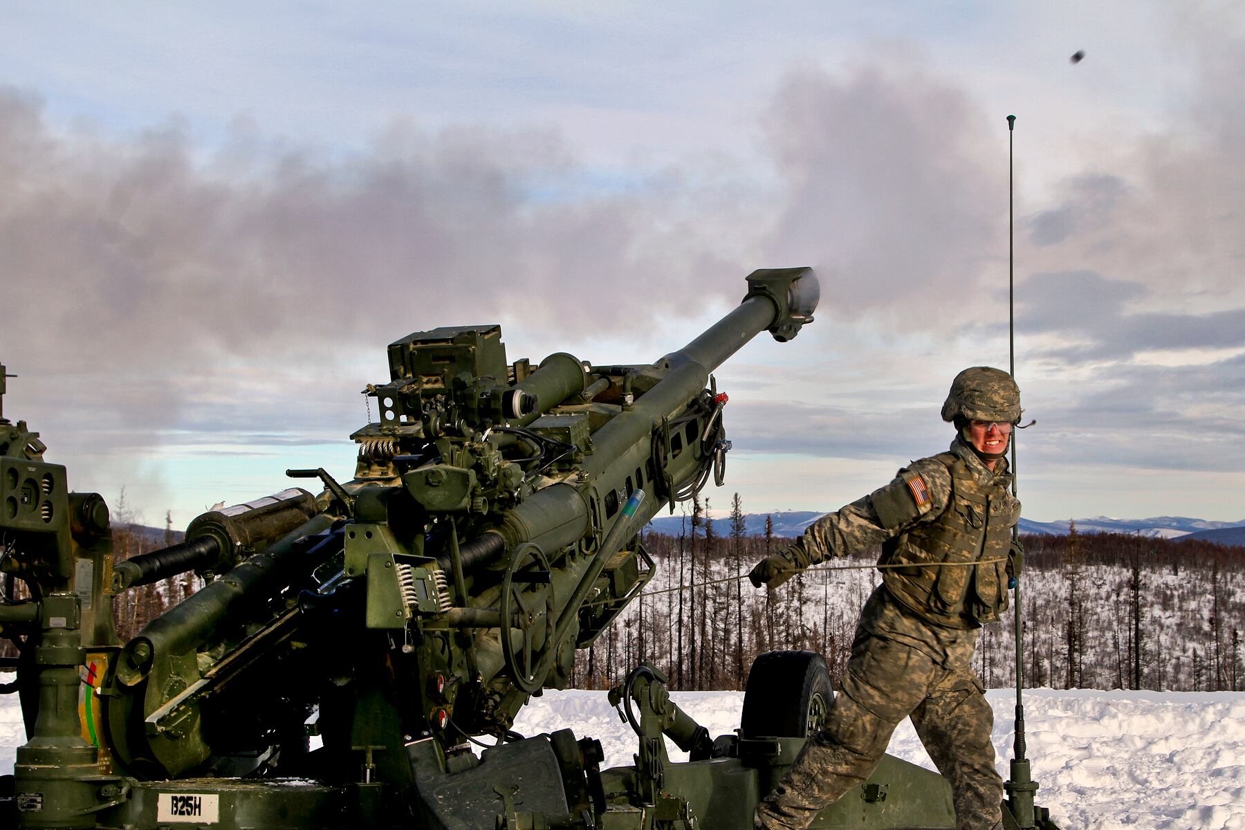 U.S. Navy photo by Petty Officer 3rd Class Beverly J. Lesonik Army Pfc. Alexander Ivie fires a howitzer during a field artillery walk and shoot in Alaska, Oct. 11, 2014. Ivie is a howitzer crew member assigned to 2nd Battalion, 8th Field Artillery Regiment.
