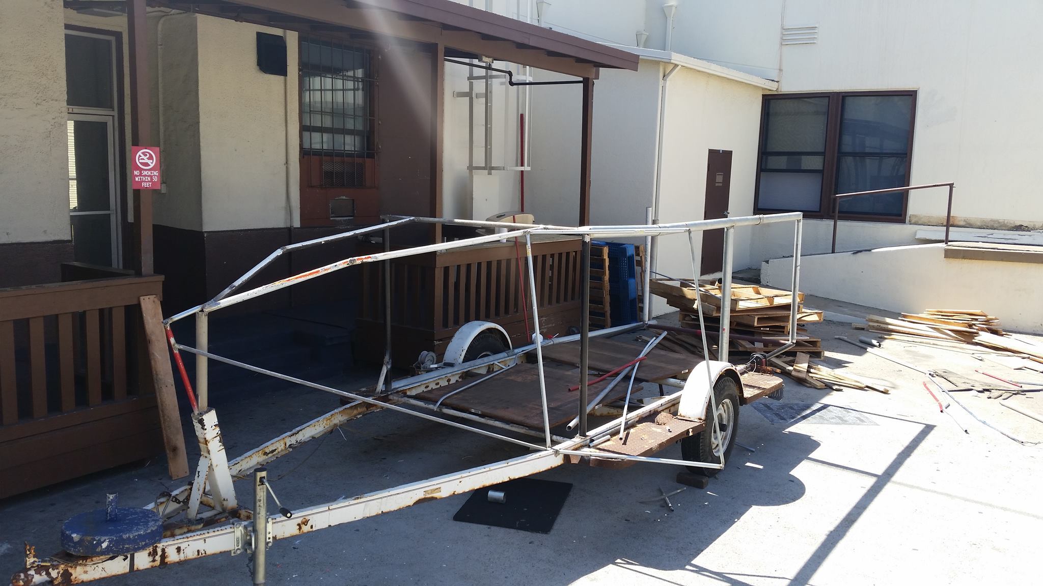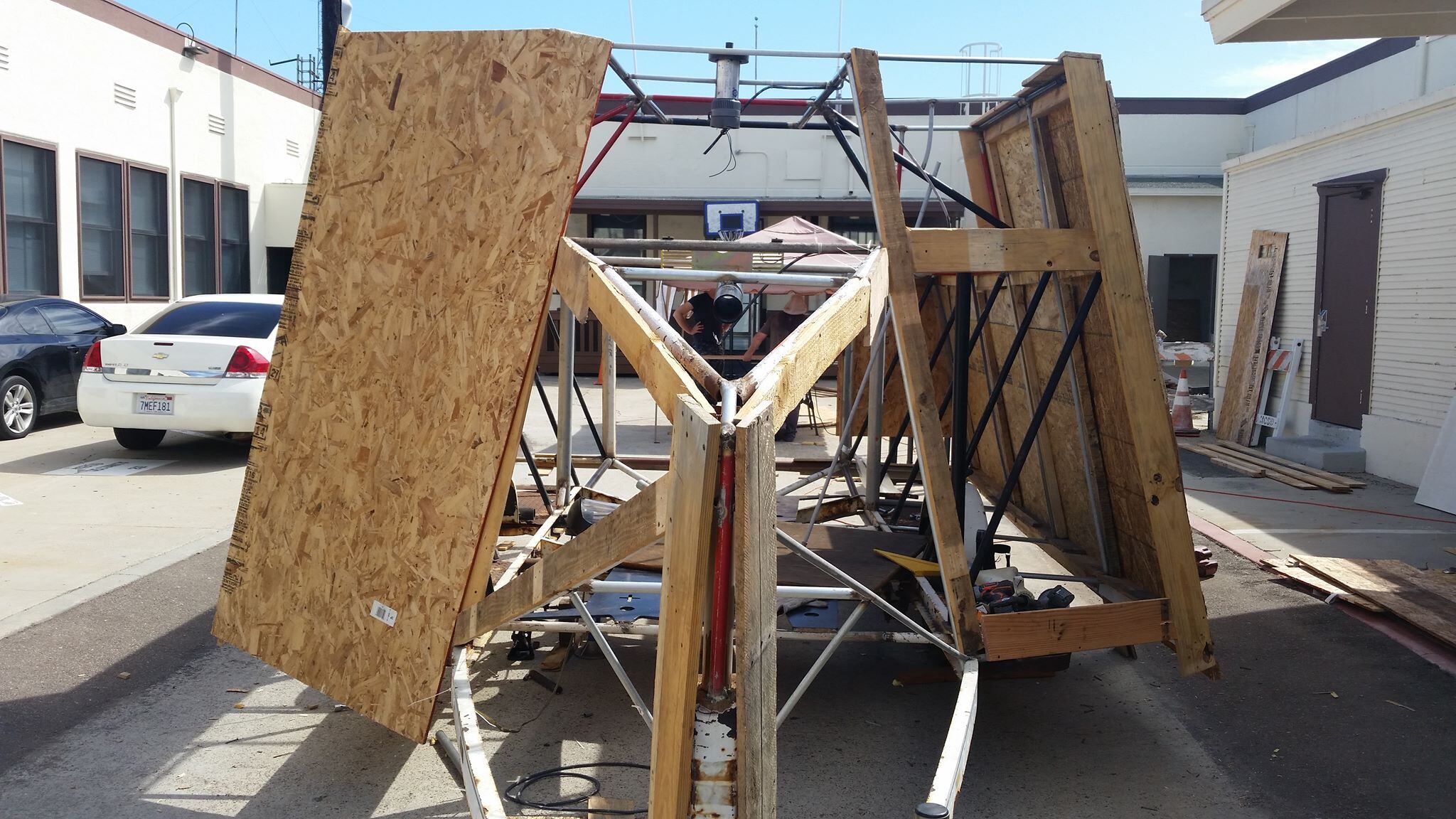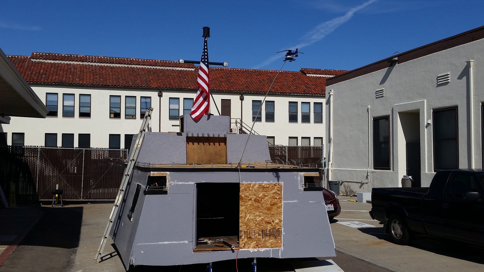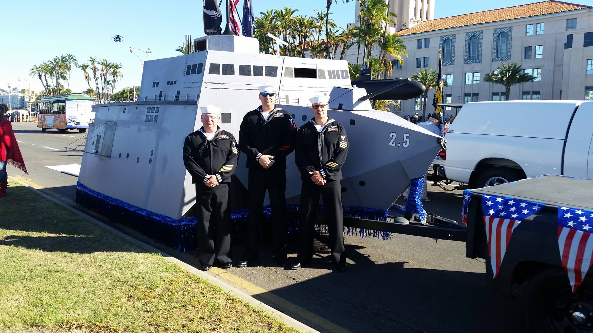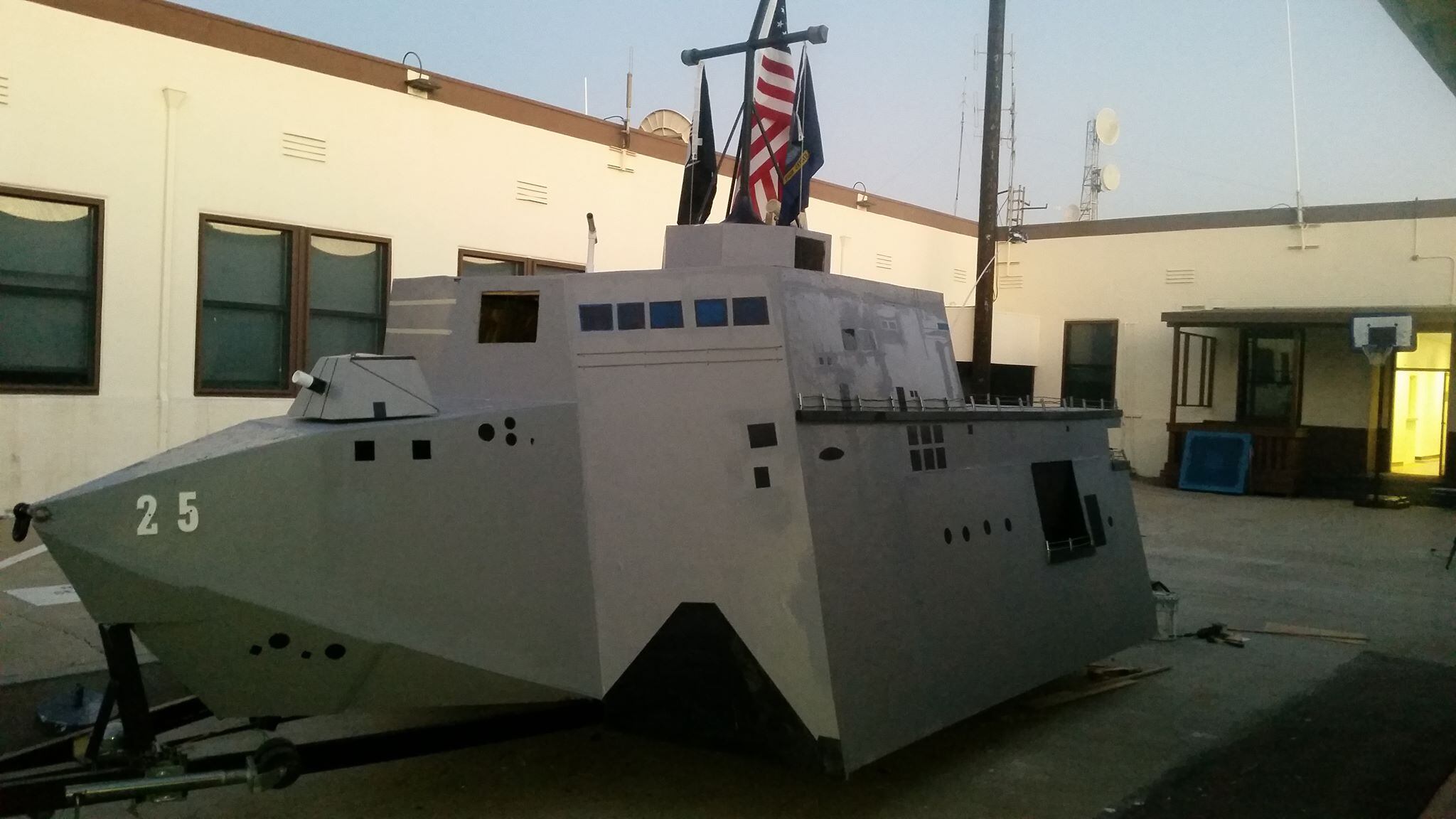 The project began when FC1 Bryan Wells acquired a boat trailer off Craigslist to use as the base for the LCS parade float he envisioned. The trailer, like almost all of the parts Wells used, were picked up or borrowed from Craigslist, junk piles and garbage bins.This is a bow shot of the parade float coming together. The shipÕs structure is made of metal pipes and planks from discarded wooden pallets. From this, Wells and ET1 Jody Voss added particleboard sheets to fashion the hull.They painted the hull with leftover haze gray paint and carved a window for the command and control room inside.The stern has a crawl through space to get to the command and control room inside, which has enough room for a person to stand in. The shipÕs quarters are guarded by action figures manning fake machine guns.LCS 25 is ready for parade action, complete with a rotating gun turret that fires confetti, a 1MC that can blast out ÒAnchors Aweigh,Ó and a whirling ÒradarÓ at the top of the mast that spins on a treadmill motor.The homemade LCS wowed paradegoers and landed its builders on the local TV news. Manning the parade float on Wednesday were, from left, ET1 Kirk Vivian, FC1 Bryan Wells, and ET1 Jody Voss.