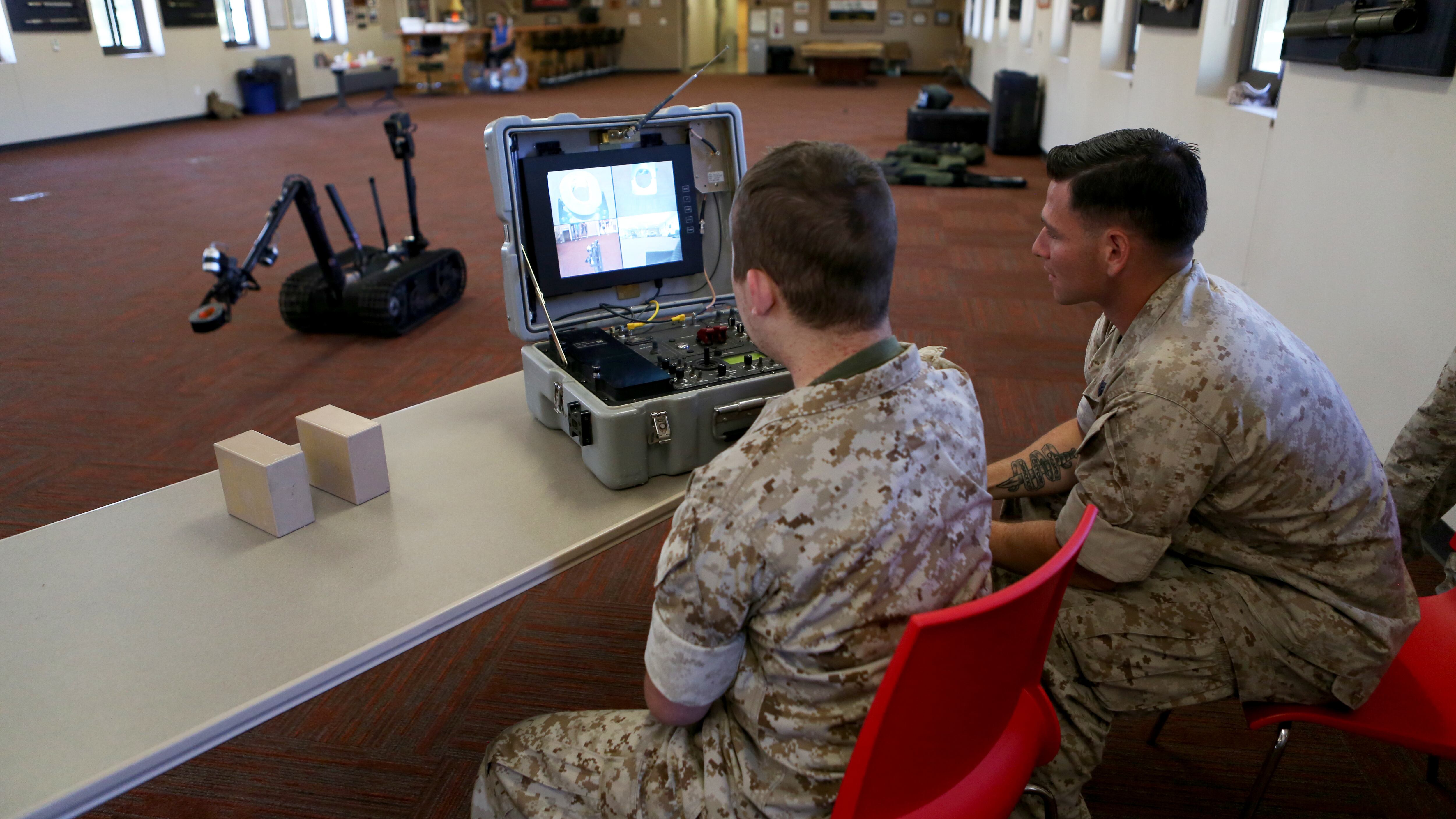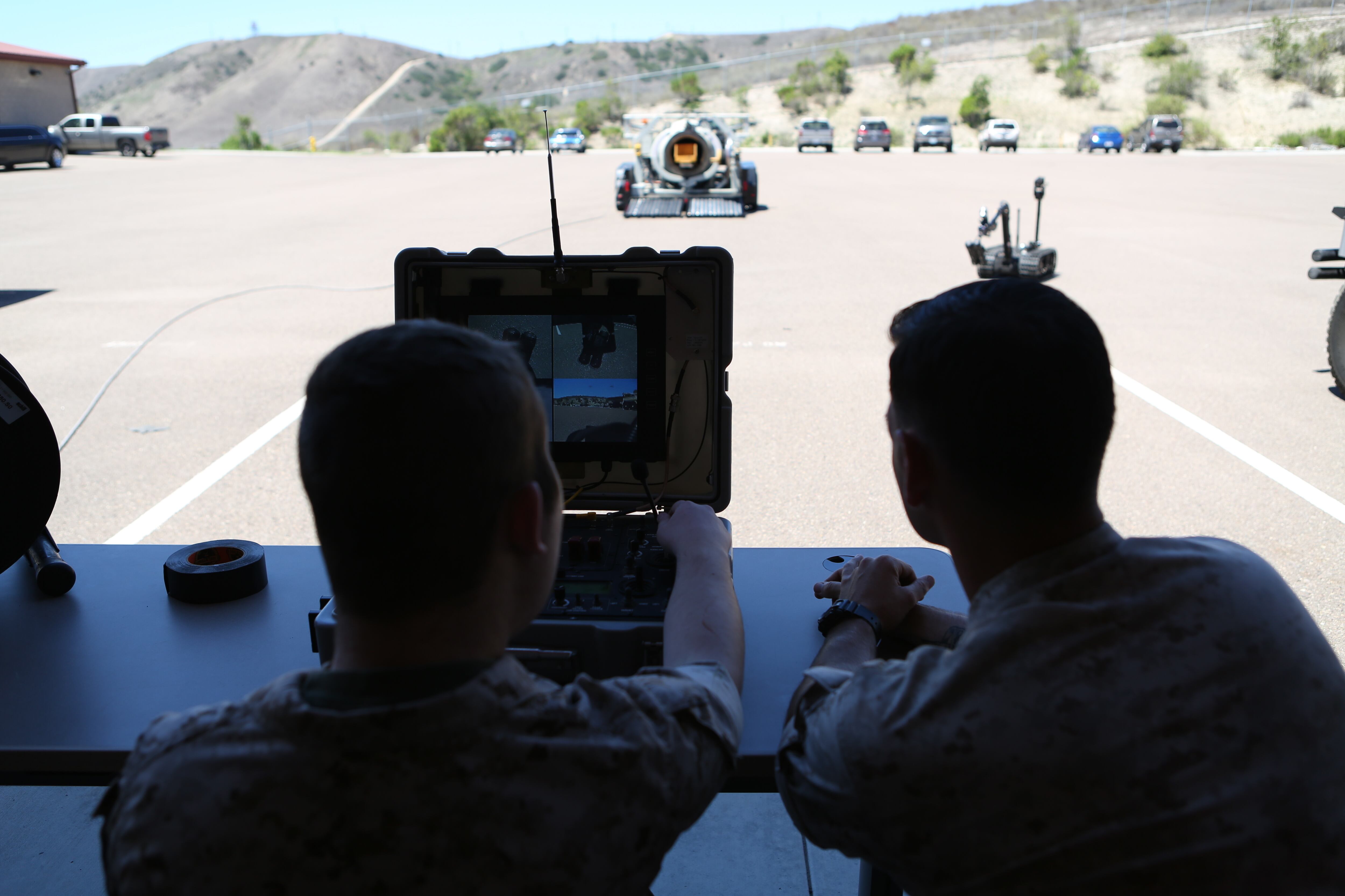 James Gallant, a young man diagnosed with brain cancer, operates the TALON Explosive Ordnance Disposal robot with Marines of 1st EOD Company, 1st Marine Logistics Group, aboard Camp Pendleton, Calif., July 25, 2015. Collaborating with the Make-A-Wish Foundation, 1st EOD helped James experience what being an EOD technician is like by giving him a tour through their library of ordnance and EOD tools, teaching him to operate the TALON bomb disposing robot and presenting him with his own desert utilities and EOD badge.