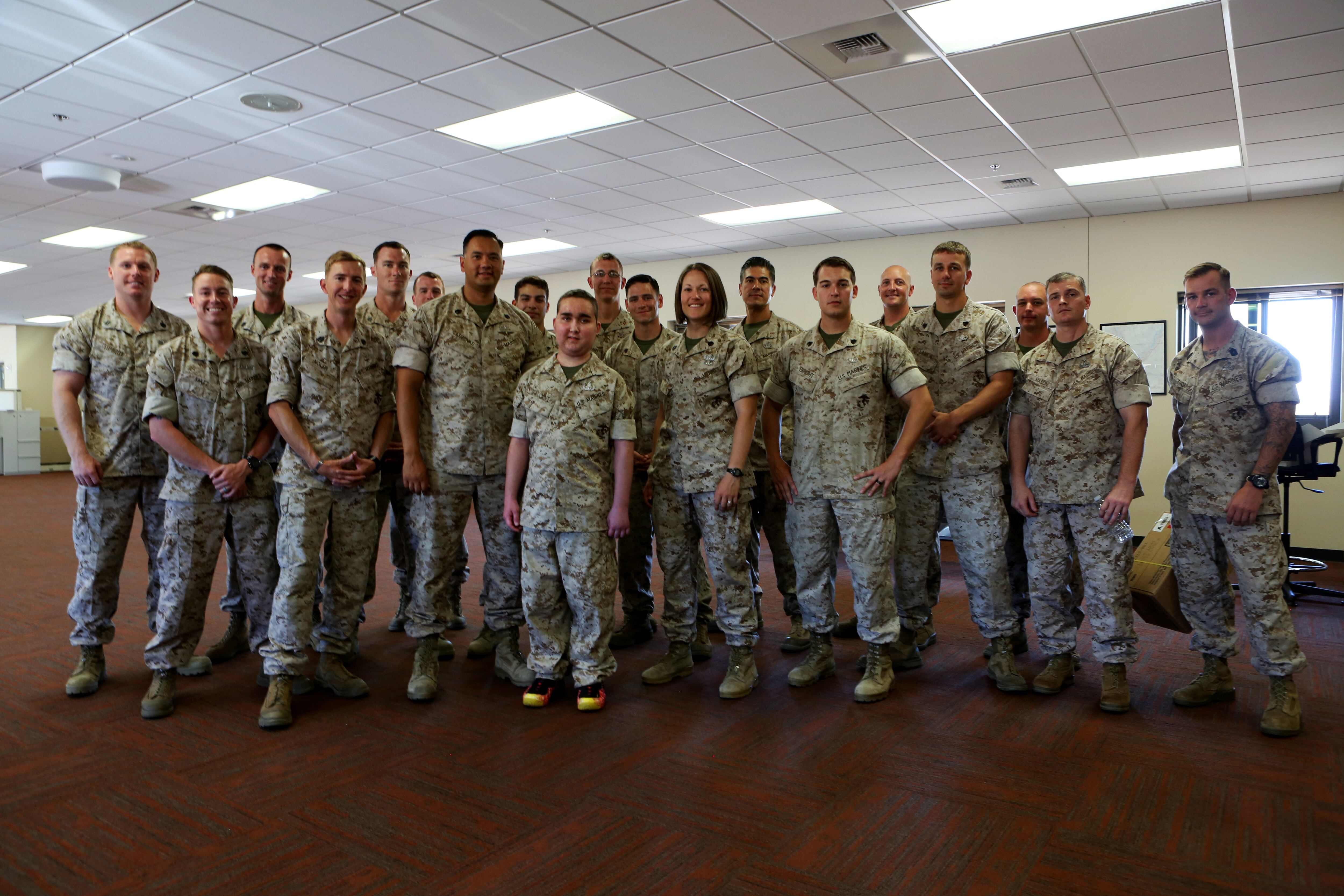 James Gallant, a young man diagnosed with brain cancer, poses for a photo with Marines of 1st Explosive Ordnance Disposal Company, 1st Marine Logistics Group, aboard Camp Pendleton, Calif., July 25, 2015. Collaborating with the Make-A-Wish Foundation, 1st EOD helped James experience what being an EOD technician is like by giving him a tour through their library of ordnance and EOD tools, teaching him to operate the TALON bomb disposing robot and presenting him with his own desert utilities and EOD badge.