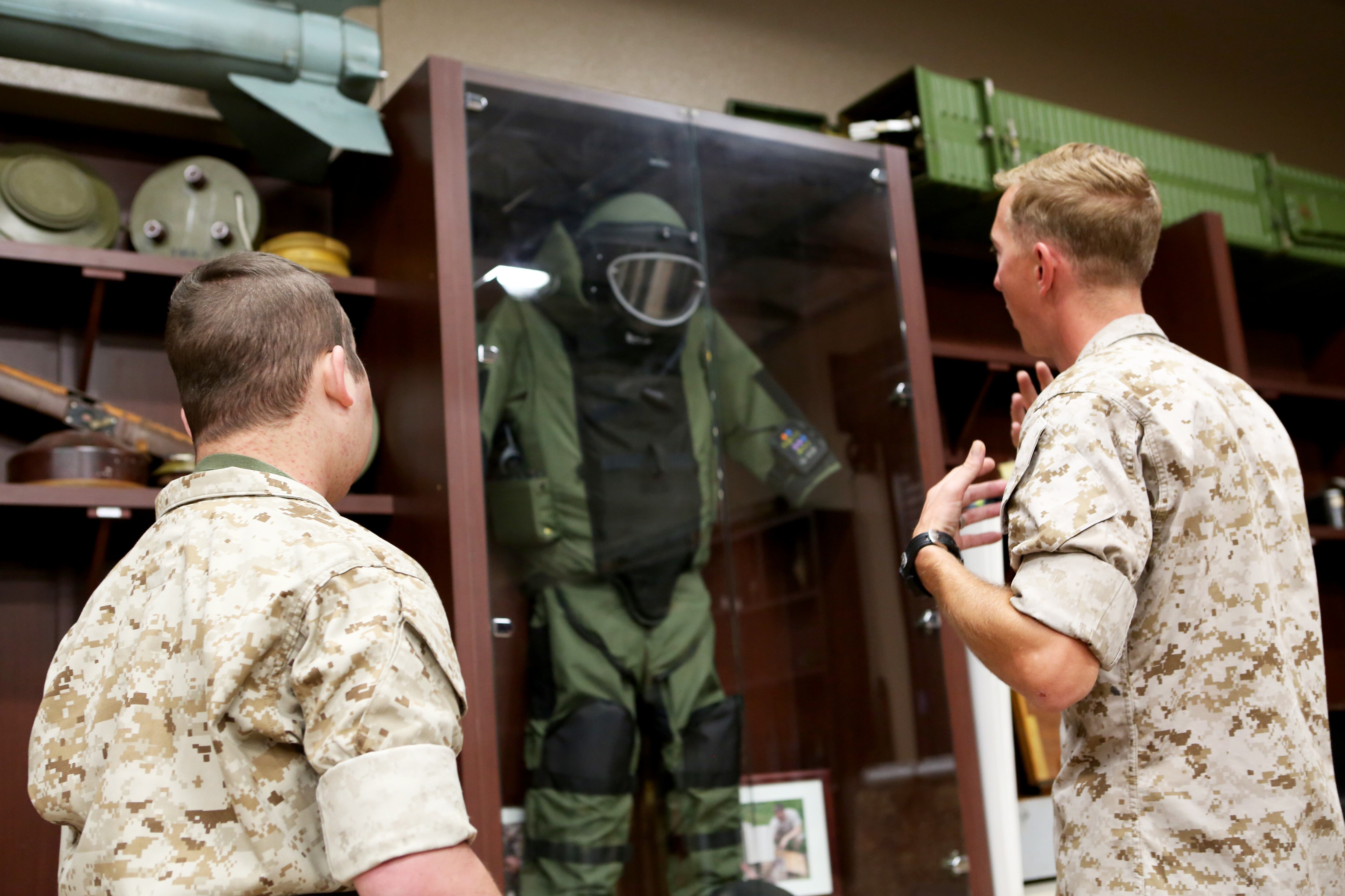 James Gallant, a young man diagnosed with brain cancer, tours the Explosive Ordnance Disposal library with Marines of 1st EOD Company, 1st Marine Logistics Group, aboard Camp Pendleton, Calif., July 25, 2015. Collaborating with the Make-A-Wish Foundation, 1st EOD helped James experience what being an EOD technician is like by giving him a tour through their library of ordnance and EOD tools, teaching him to operate the TALON bomb disposing robot and presenting him with his own desert utilities and EOD badge.