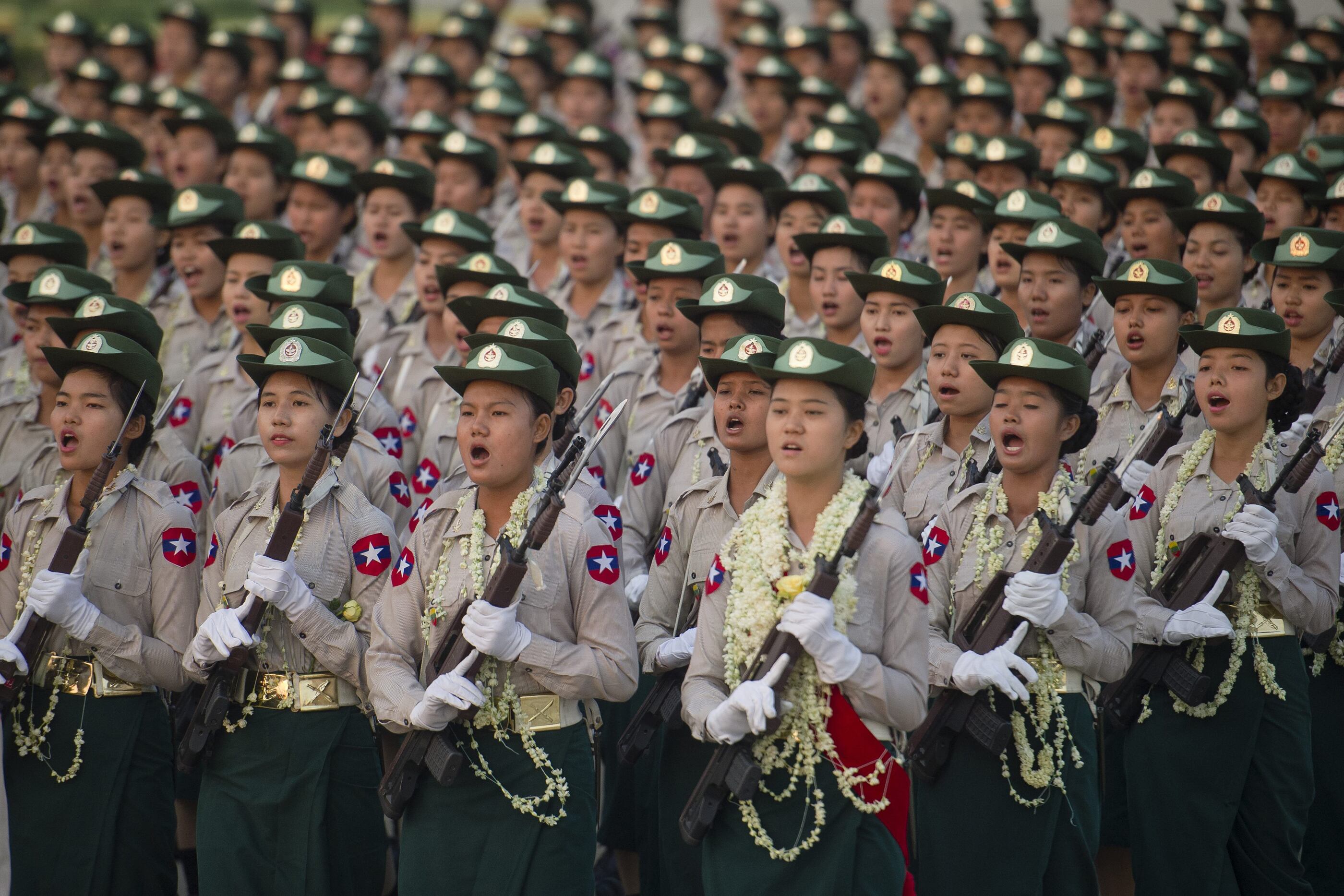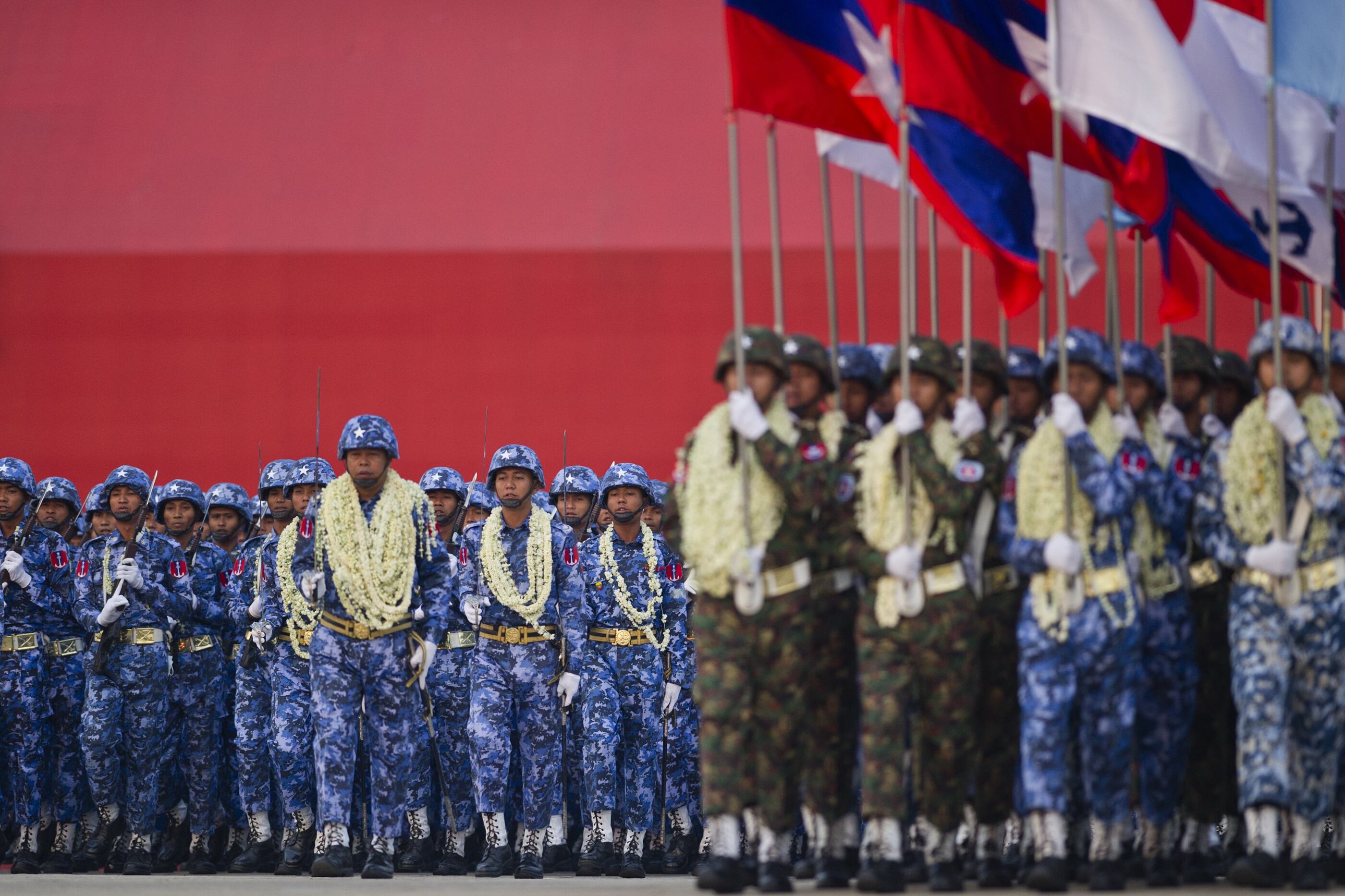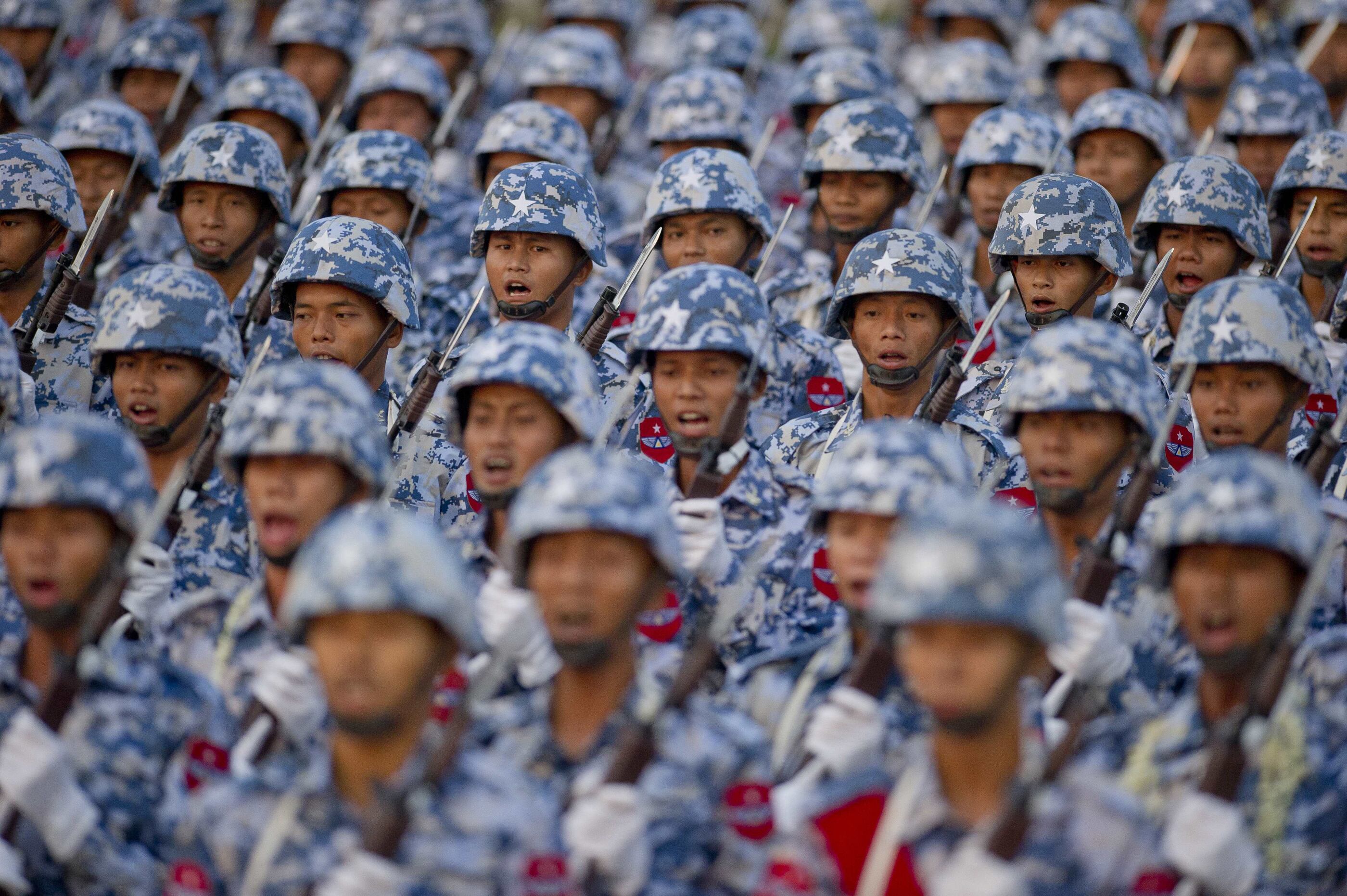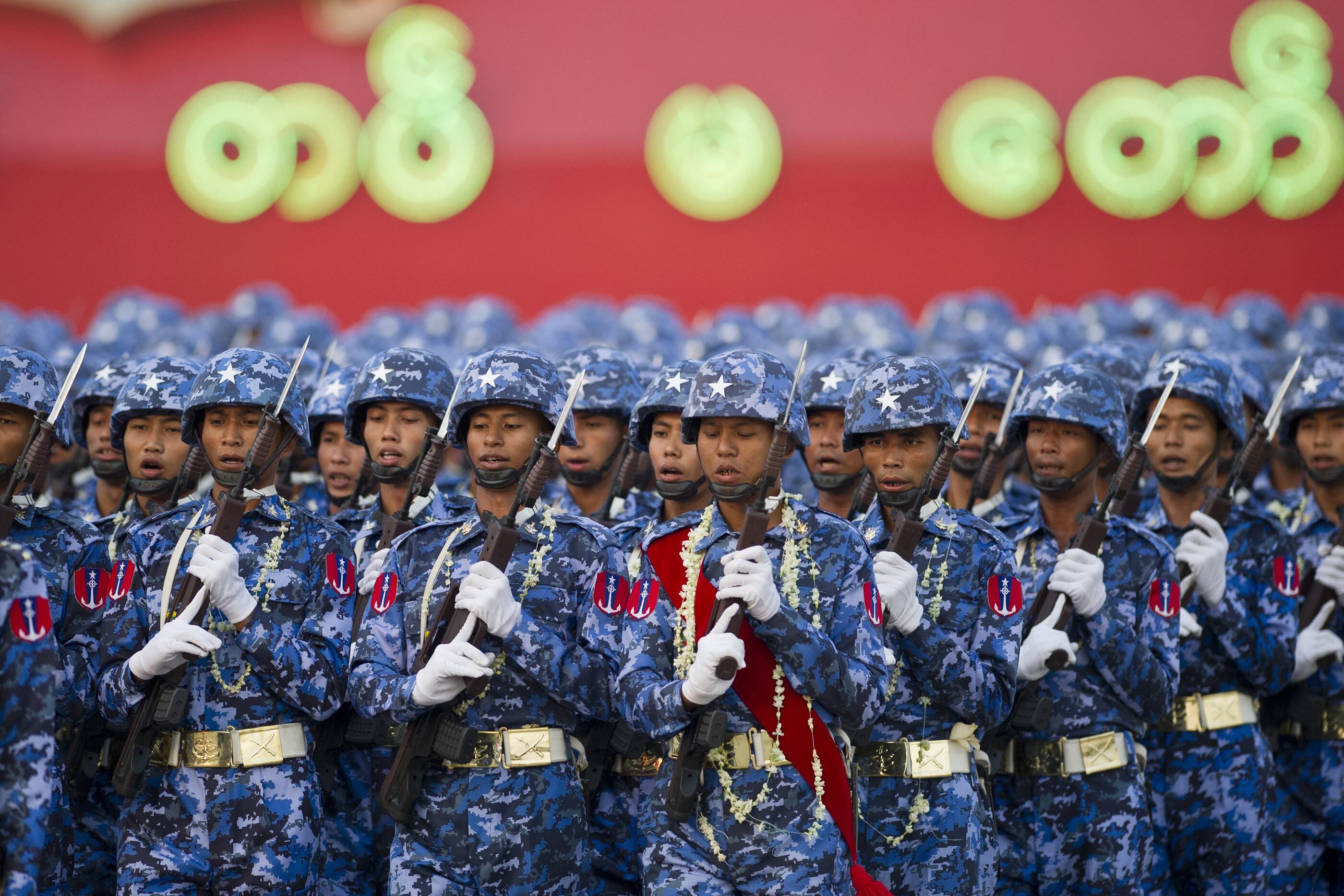 Myanmar military helicopters (background) fly in formation as statues are seen during a ceremony to mark the 71st Armed Forces Day in Myanmar's capital Naypyidaw on March 27, 2016. / AFP / YE AUNG THU (Photo credit should read YE AUNG THU/AFP/Getty Images)Members of Myanmar's military march in formation during a ceremony to mark the 71st Armed Forces Day in Myanmar's capital Naypyidaw on March 27, 2016. / AFP / YE AUNG THU (Photo credit should read YE AUNG THU/AFP/Getty Images)Members of Myanmar's military march in formation during a ceremony to mark the 71st Armed Forces Day in Myanmar's capital Naypyidaw on March 27, 2016. / AFP / YE AUNG THU (Photo credit should read YE AUNG THU/AFP/Getty Images)Members of Myanmar's military march in formation during a ceremony to mark the 71st Armed Forces Day in Myanmar's capital Naypyidaw on March 27, 2016. / AFP / YE AUNG THU (Photo credit should read YE AUNG THU/AFP/Getty Images)Members of Myanmar's military march in formation during a ceremony to mark the 71st Armed Forces Day in Myanmar's capital Naypyidaw on March 27, 2016. / AFP / YE AUNG THU (Photo credit should read YE AUNG THU/AFP/Getty Images)Members of Myanmar's military march in formation during a ceremony to mark the 71st Armed Forces Day in Myanmar's capital Naypyidaw on March 27, 2016. / AFP / YE AUNG THU (Photo credit should read YE AUNG THU/AFP/Getty Images)Members of Myanmar's military march in formation during a ceremony to mark the 71st Armed Forces Day in Myanmar's capital Naypyidaw on March 27, 2016. / AFP / YE AUNG THU (Photo credit should read YE AUNG THU/AFP/Getty Images)Chief Senior General Min Aung Hlaing, commander in chief of the Myanmar armed forces, inspects troops during a ceremony to mark the 71st Armed Forces Day in Myanmar's capital Naypyidaw on March 27, 2016. / AFP / afp / YE AUNG THU (Photo credit should read YE AUNG THU/AFP/Getty Images)Surface to air missiles of the Myanmar military are paraded during a ceremony to mark the 71st Armed Forces Day in Myanmar's capital Naypyidaw on March 27, 2016. / AFP / YE AUNG THU (Photo credit should read YE AUNG THU/AFP/Getty Images)Surface to air missiles of the Myanmar military are paraded during a ceremony to mark the 71st Armed Forces Day in Myanmar's capital Naypyidaw on March 27, 2016. / AFP / YE AUNG THU (Photo credit should read YE AUNG THU/AFP/Getty Images)Armoured vehicles of the Myanmar military are paraded during a ceremony to mark the 71st Armed Forces Day in Myanmar's capital Naypyidaw on March 27, 2016. / AFP / YE AUNG THU (Photo credit should read YE AUNG THU/AFP/Getty Images)Myanmar military tanks are paraded during a ceremony to mark the 71st Armed Forces Day in Myanmar's capital Naypyidaw on March 27, 2016. / AFP / YE AUNG THU (Photo credit should read YE AUNG THU/AFP/Getty Images)Myanmar's military hardware is paraded during a ceremony to mark the 71st Armed Forces Day in Myanmar's capital Naypyidaw on March 27, 2016. / AFP / YE AUNG THU (Photo credit should read YE AUNG THU/AFP/Getty Images)Myanmar Air Force MiG-29 fighter aircraft fly in formation during a ceremony to mark the 71st Armed Forces Day in Myanmar's capital Naypyidaw on March 27, 2016. / AFP / YE AUNG THU (Photo credit should read YE AUNG THU/AFP/Getty Images)Myanmar Navy special forces personnel rappel from helicopters during a ceremony to mark the 71st Armed Forces Day in Myanmar's capital Naypyidaw on March 27, 2016. / AFP / YE AUNG THU (Photo credit should read YE AUNG THU/AFP/Getty Images)Chief Senior General Min Aung Hlaing, commander in chief of the Myanmar armed forces, salutes during a ceremony to mark the 71st Armed Forces Day in Myanmar's capital Naypyidaw on March 27, 2016. / AFP / AUNG HTET (Photo credit should read AUNG HTET/AFP/Getty Images)