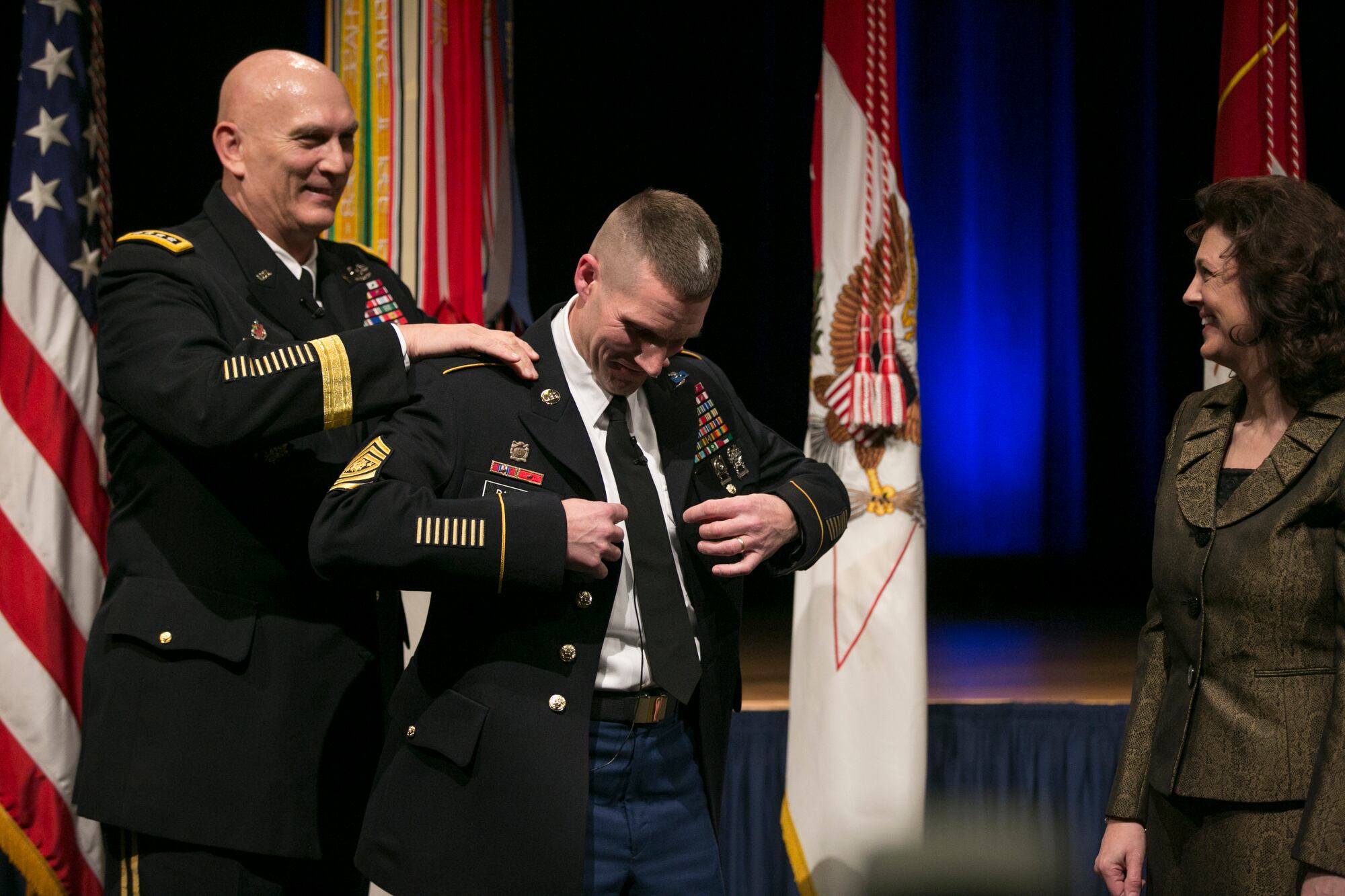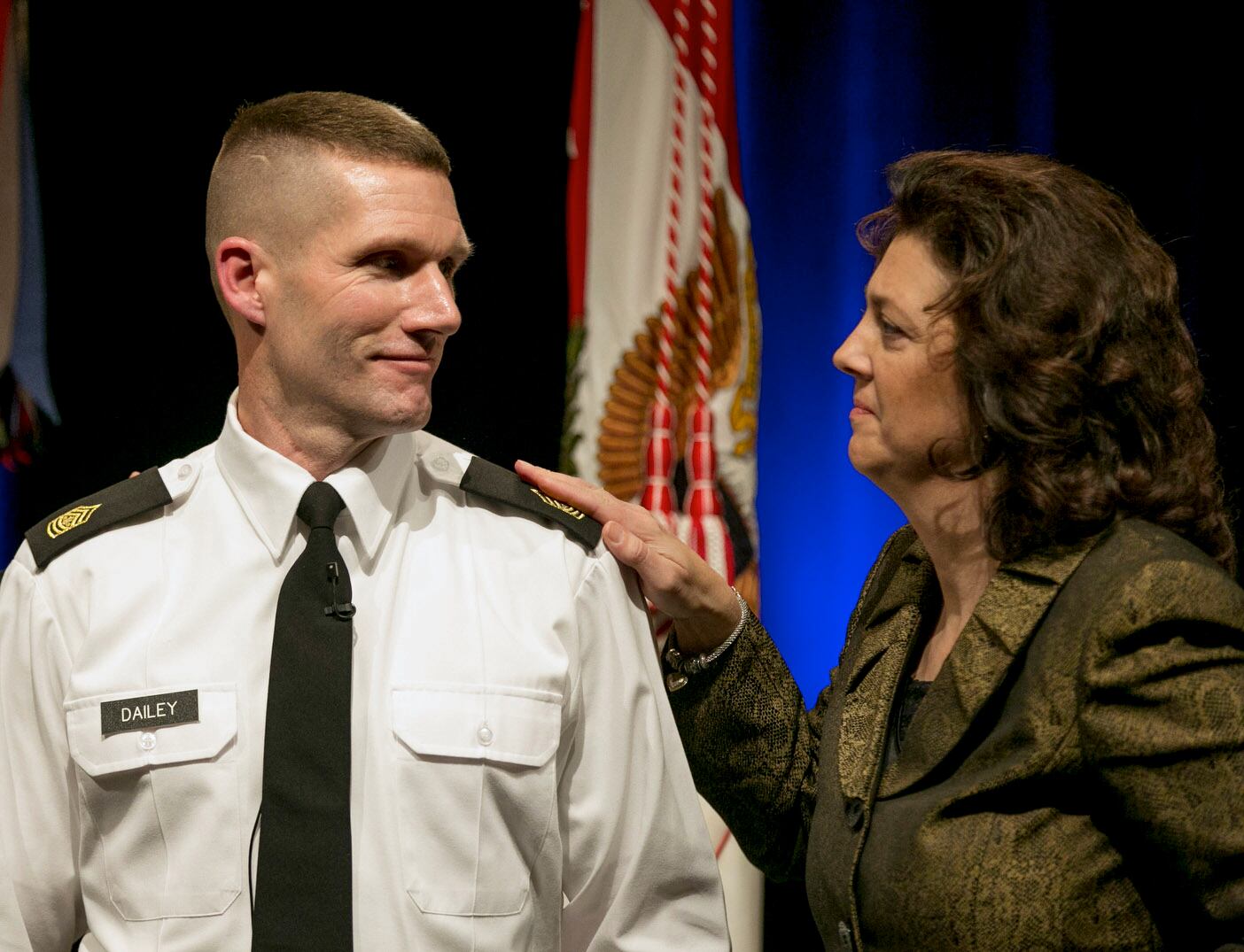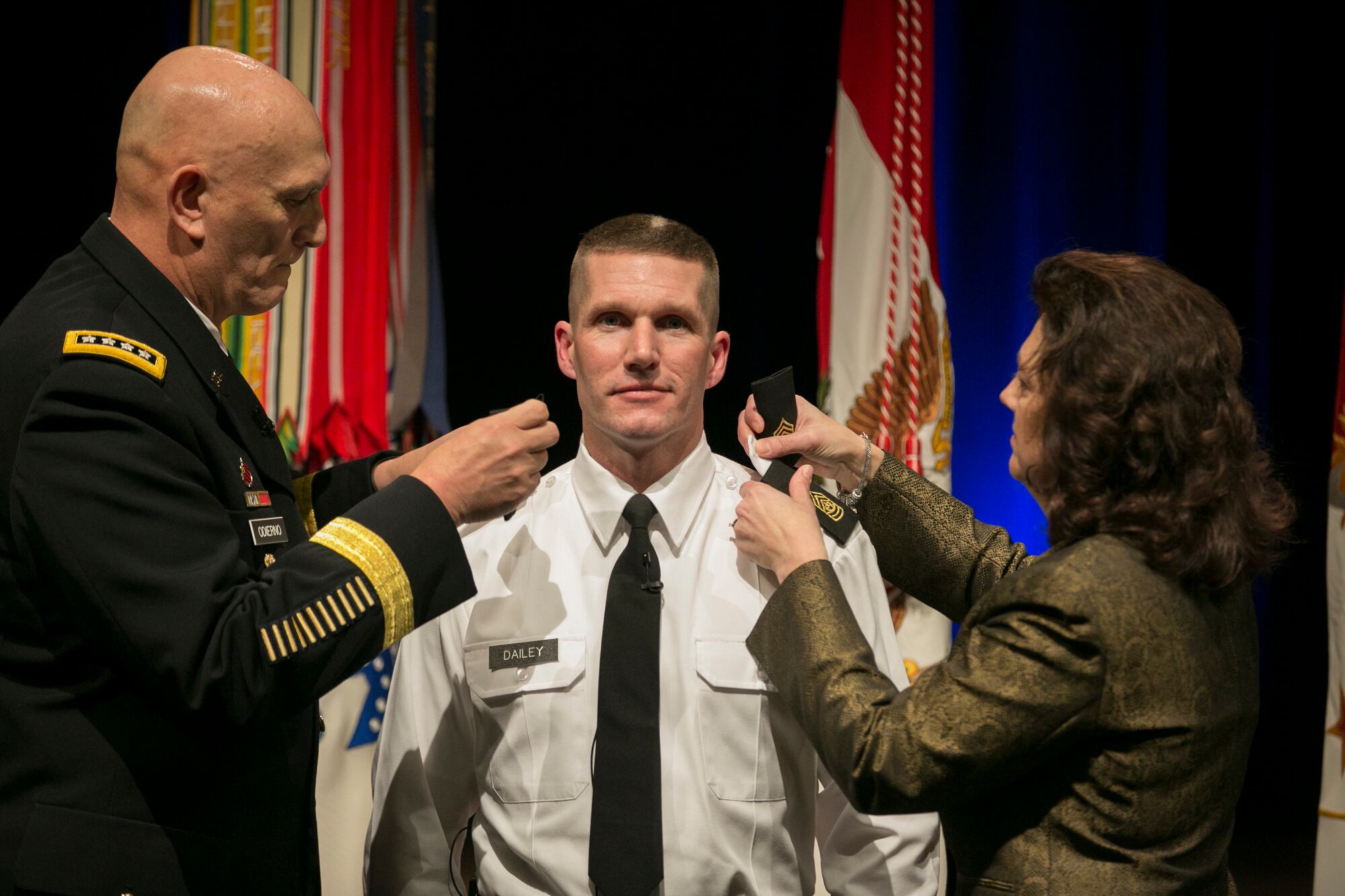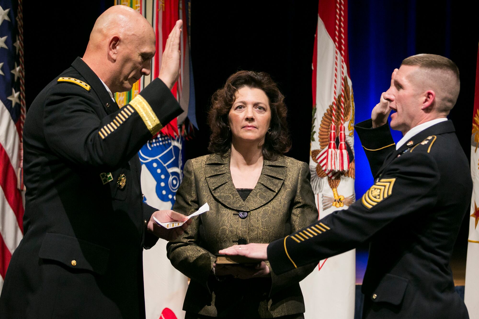 Chief of Staff of the Army Gen. Ray Odierno speaks before swearing in Command Sgt. Maj. Dan Dailey as the 15th Sergeant Major of the Army during a ceremony at the Pentagon in Arlington, Va., on Friday, January 30, 2015. (Mike Morones/Staff)Chief of Staff of the Army Gen. Ray Odierno and Holly Dailey affix new ranks as he swears in Command Sgt. Maj. Dan Dailey as the 15th Sergeant Major of the Army during a ceremony at the Pentagon in Arlington, Va., on Friday, January 30, 2015. (Mike Morones/Staff)Chief of Staff of the Army Gen. Ray Odierno and Holly Dailey affix new ranks as he swears in Command Sgt. Maj. Dan Dailey as the 15th Sergeant Major of the Army during a ceremony at the Pentagon in Arlington, Va., on Friday, January 30, 2015. (Mike Morones/Staff)Chief of Staff of the Army Gen. Ray Odierno places a jacket bearing the rank of Sergeant Major of the Army on Command Sgt. Maj. Dan Dailey during his swearing-in ceremony at the Pentagon in Arlington, Va., on Friday, January 30, 2015. (Mike Morones/Staff)Chief of Staff of the Army Gen. Ray Odierno swears in Command Sgt. Maj. Dan Dailey as the 15th Sergeant Major of the Army during a ceremony at the Pentagon in Arlington, Va., on Friday, January 30, 2015. (Mike Morones/Staff)Sergeant Major of the Army Dan Dailey makes a few remarks after being sworn-in as the 15th SMA at a ceremony at the Pentagon in Arlington, Va., on Friday, January 30, 2015. (Mike Morones/Staff)Sergeant Major of the Army Dan Dailey greets his family during his swearing-in ceremony at the Pentagon in Arlington, Va., on Friday, January 30, 2015. (Mike Morones/Staff)The crowd assembled for Sergeant Major of the Army Dan Dailey's swearing-in sing the Army Song following a ceremony at the Pentagon in Arlington, Va., on Friday, January 30, 2015. (Mike Morones/Staff)Sgt. Joseph Brennan and Pfc. Jeremy Byrd, both soldiers with D Company, 1st Battalion, 3rd Infantry Regiment, The Old Guard, check Command Sgt. Maj. Dan Dailey's new jacket before being sworn in as the 15th Sergeant Major of the Army during a ceremony at the Pentagon in Arlington, Va., on Friday, January 30, 2015. (Mike Morones/Staff)Sergeant Major of the Army shoulder boards sit backstage before Chief of Staff of the Army Gen. Ray Odierno swears in Command Sgt. Maj. Dan Dailey as the 15th Sergeant Major of the Army during a ceremony at the Pentagon in Arlington, Va., on Friday, January 30, 2015. (Mike Morones/Staff)