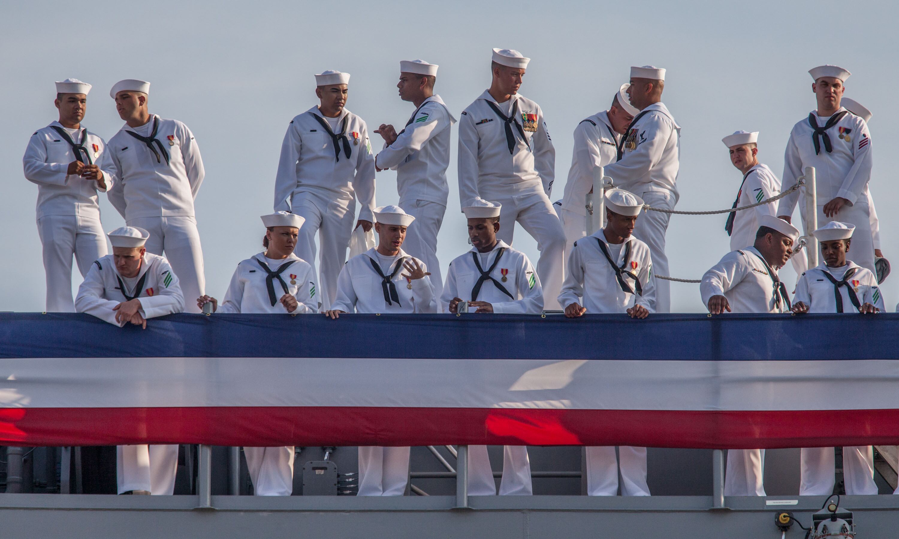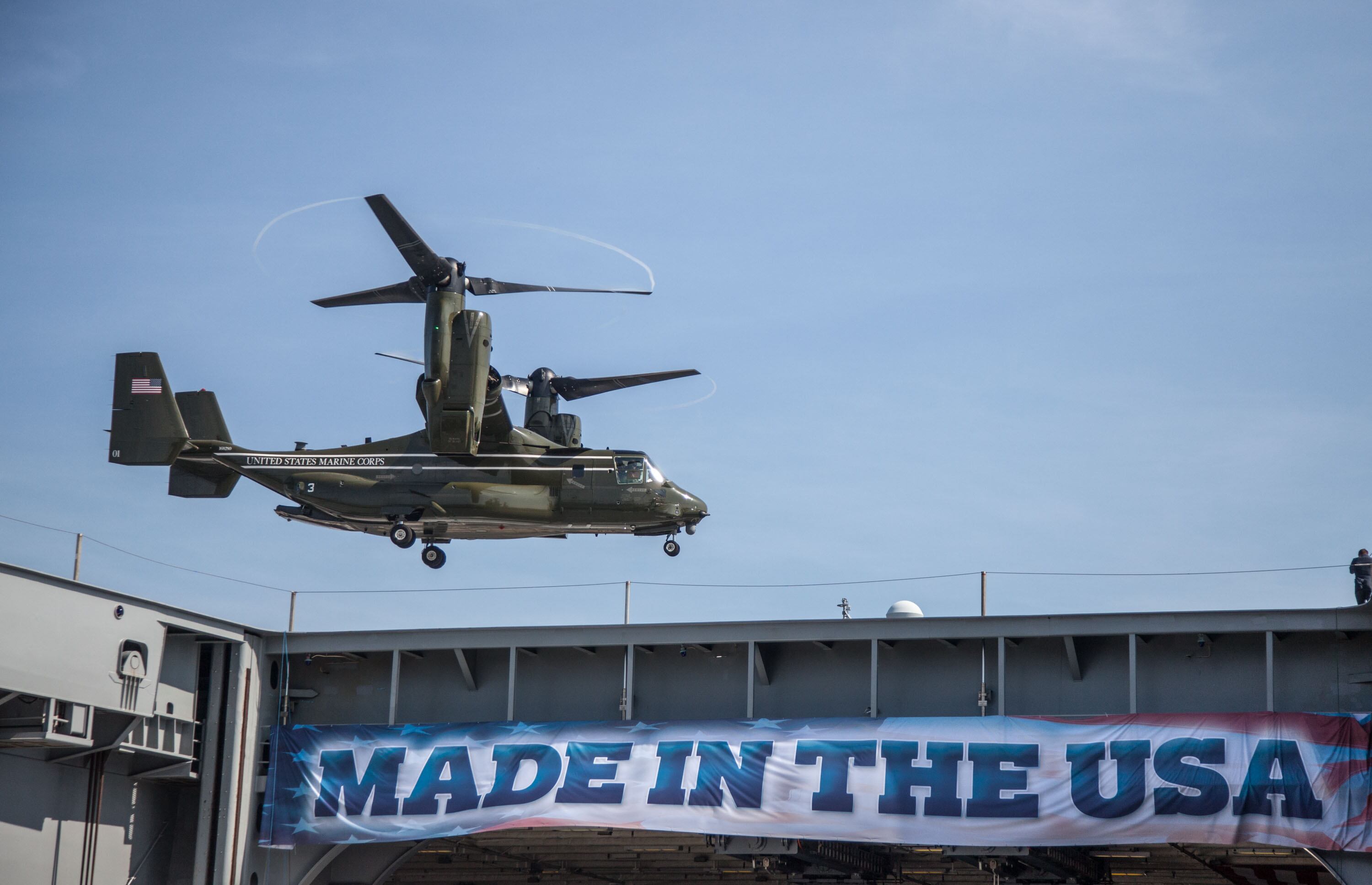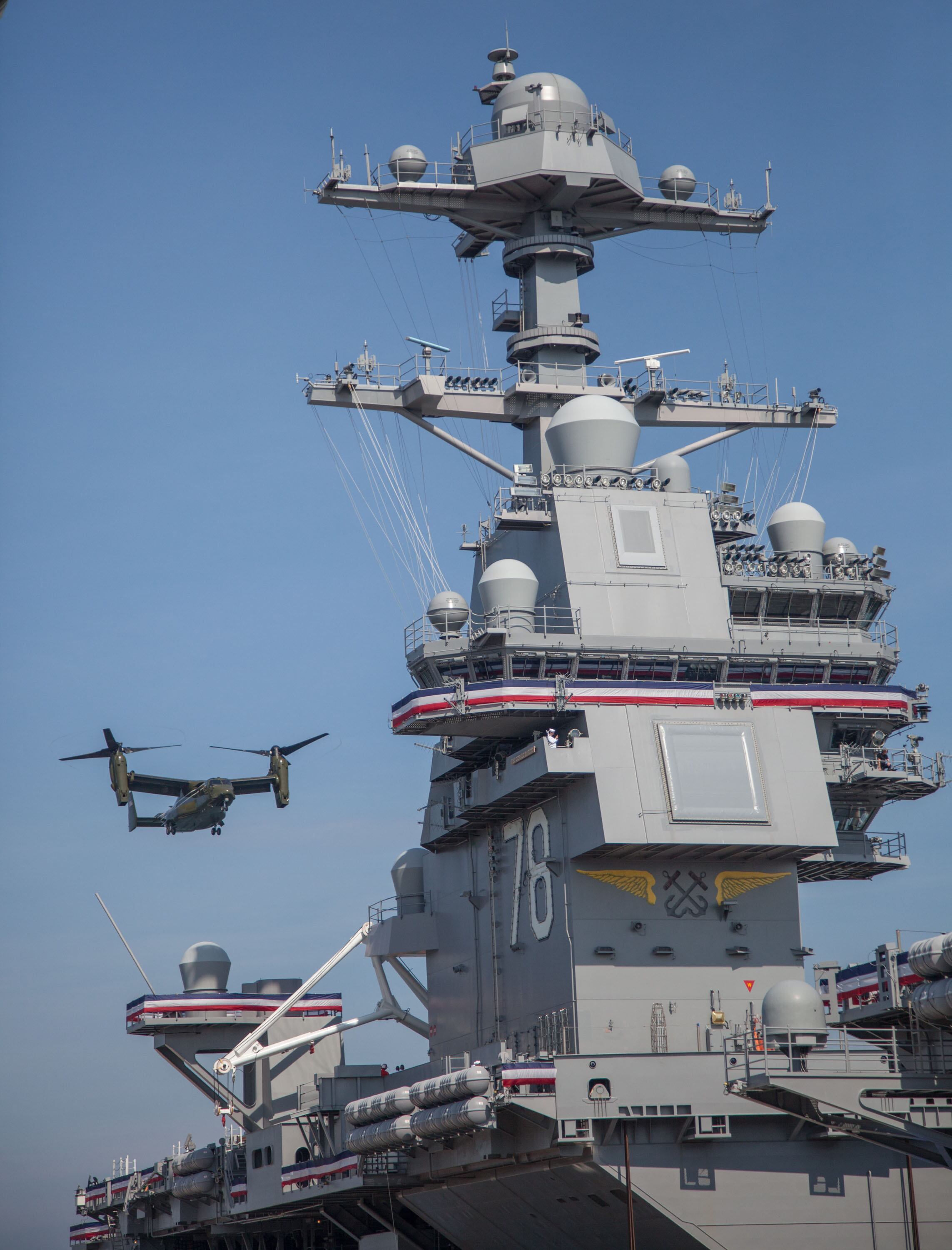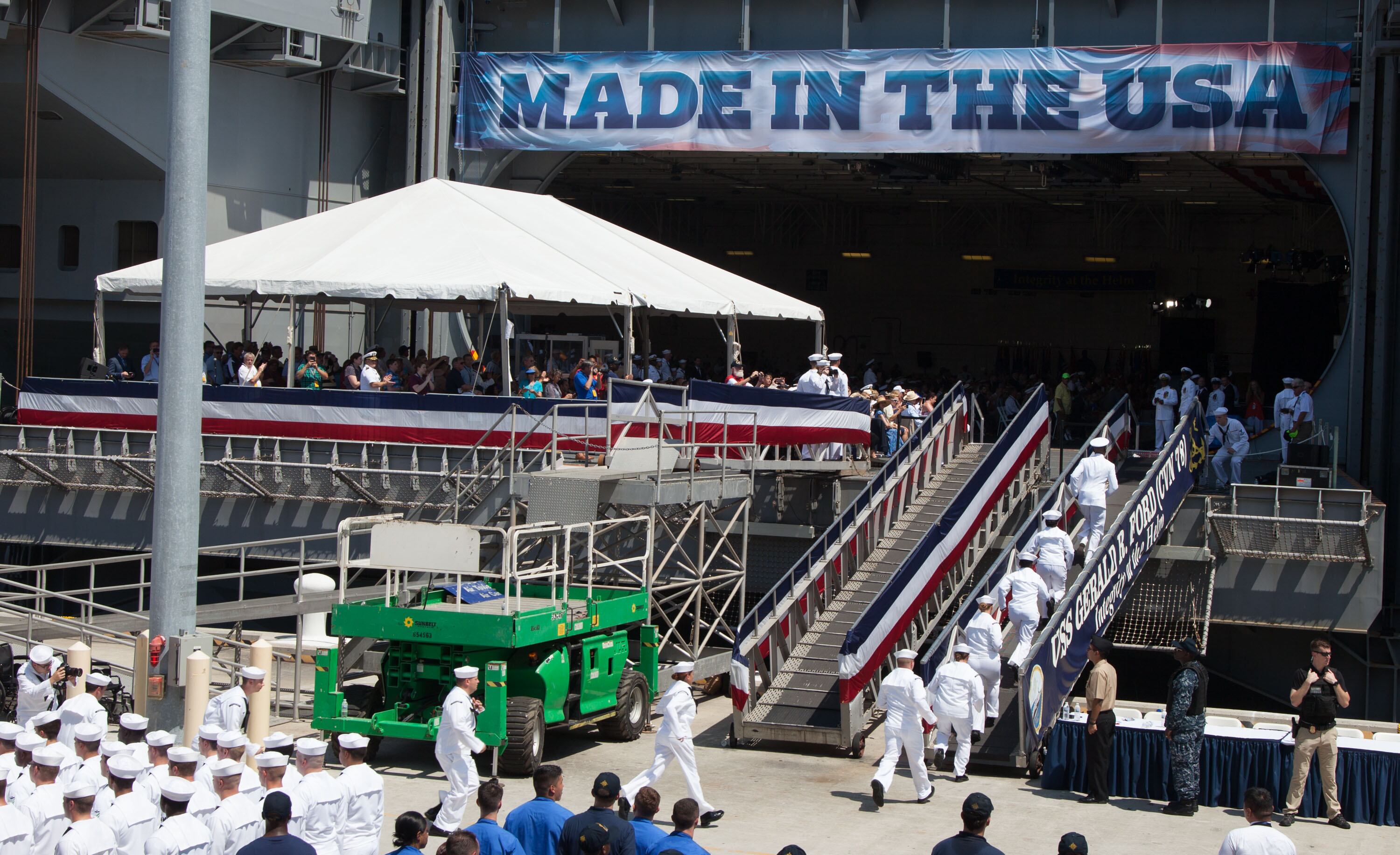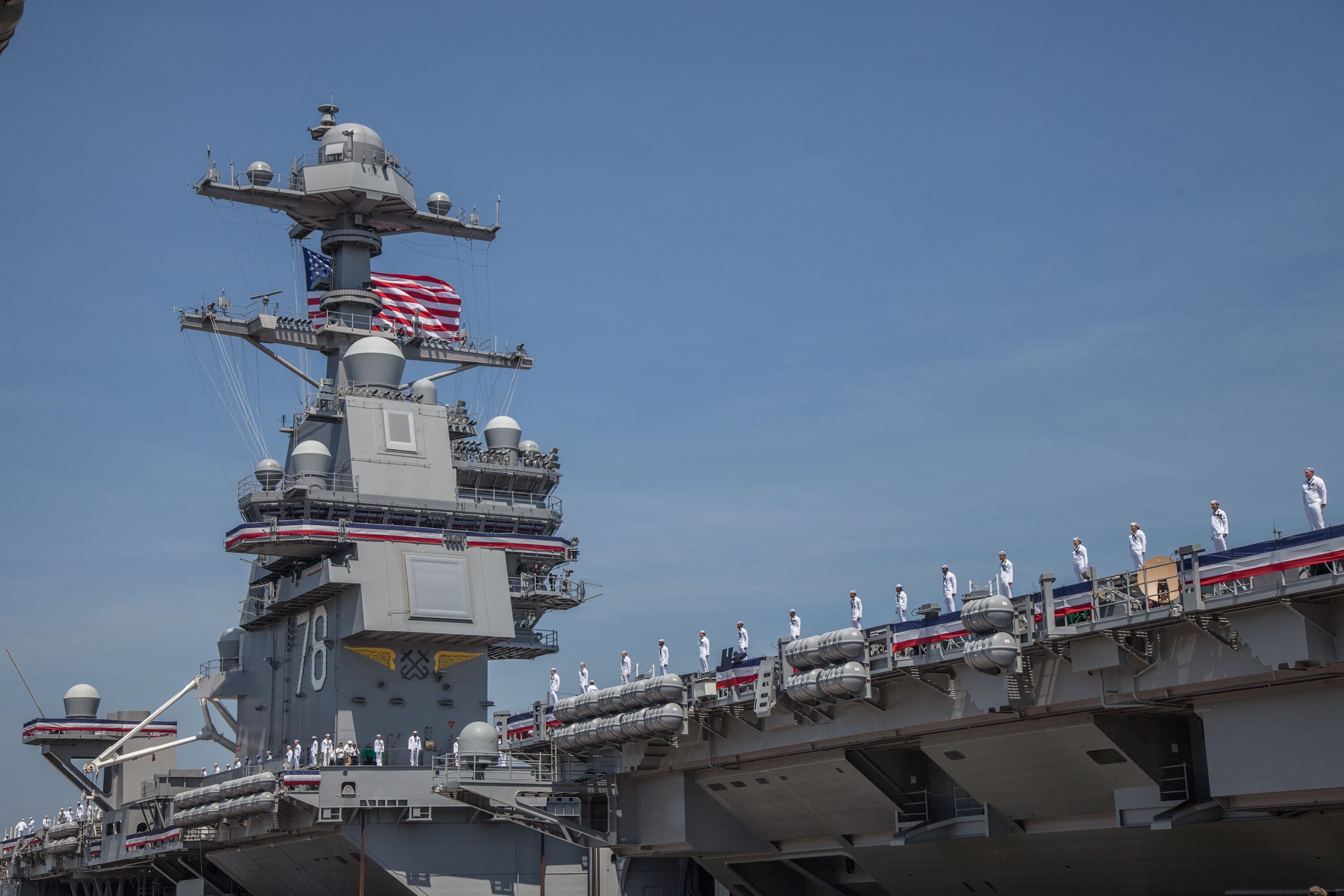 The USS Gerald R. FordPresident Donald Trump gives the keynote address at the commissioning of the aircraft carrier Gerald R. Ford and is watched by thousands of spectators on Pier 11 at Norfolk Naval Station.Navy F/A 18 Hornets fly over the carrier Eisenhower during the playing of the National Anthem and the presentation of the colors as the Navy put into commission the newest aircraft carrier, the USS Gerald R. Ford.An Osprey tilt-rotor aircraft from Marine Helicopter Squadron One make their approach to the soon-to-be commissioned aircraft carrier Gerald R. Ford slightly in advance of the arrival of President Donald Trump, who presided over the event.A MV-22 Osprey's tilt-rotor aircraft from Marine Helicopter Squadron One lands on the the soon to be commissioned aircraft carrier Gerald R. Ford in advance of the arrival of President Donald Trump, who presided over the event.Navy F/A 18 Hornets fly over the carrier Eisenhower during the playing of the National Anthem and the presentation of the colors as the Navy put into commission the newest aircraft carrier, the USS Gerald R. Ford.Sailors aboard the aircraft carrier Gerald R. Ford watch as the crowd gathers on pier II to watch their ship join the fleet today. The Ford is the first of a new class of carriers and won't be fully ready to deploy for another five years.