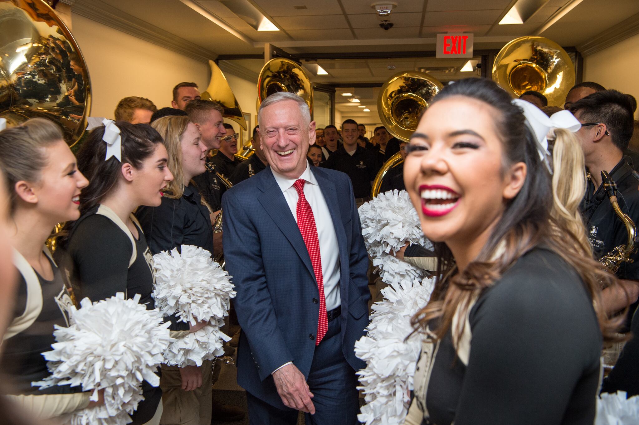 Secretary of Defense James N. Mattis cheers on the U.S. Army football team during a pep rally at the Pentagon on Dec. 8, 2017, in Washington. (Air Force Staff Sgt. Jette Carr/DoD)A CH-53E Super Stallion helicopter picks up an AV-8B Harrier engine to during a Helicopter Support Team mission as part of Combined Composite Training Unit Exercise, Dec. 1, 2017, in the Atlantic Ocean. (Cpl. Jon Sosner/Marine Corps)A Navy Super Hornet receives fuel from an Air Force KC-135 Stratotanker over Afghanistan, Dec. 7, 2017. Navy Super Hornets conducted a series of precision airstrikes against six Taliban narcotic targets in Helmand province. Air Force photo by Jeff ParkinsonArmy Staff Sgt. Nikita Revilloza, a jumpmaster, relays commands during the 20th Annual Randy Oler Memorial Operation Toy Drop at Camp MacKall, N.C. The event allows soldiers to maintain their airborne readiness and give back to the community. (Spc. Darius Davis/Army)
