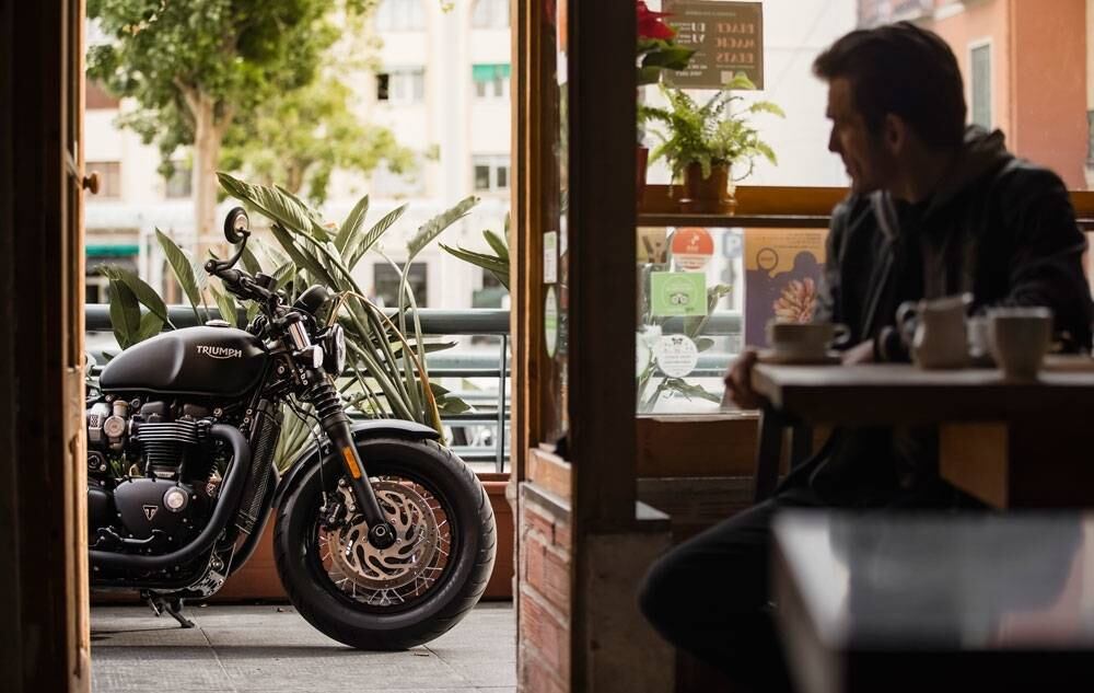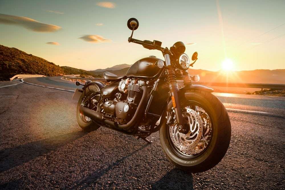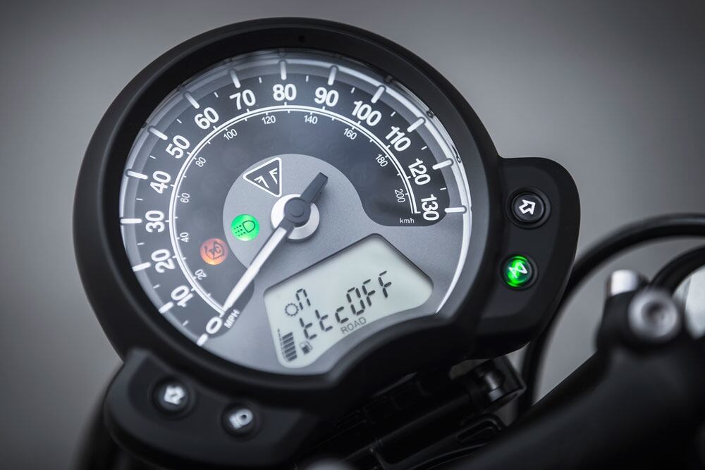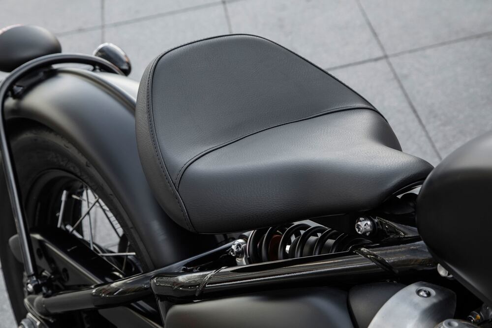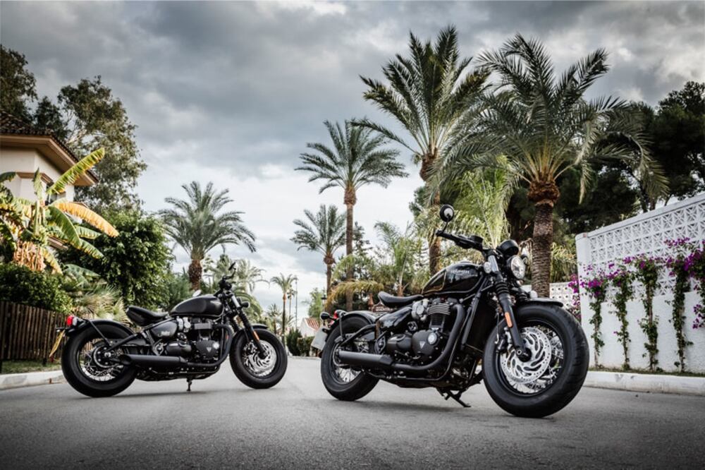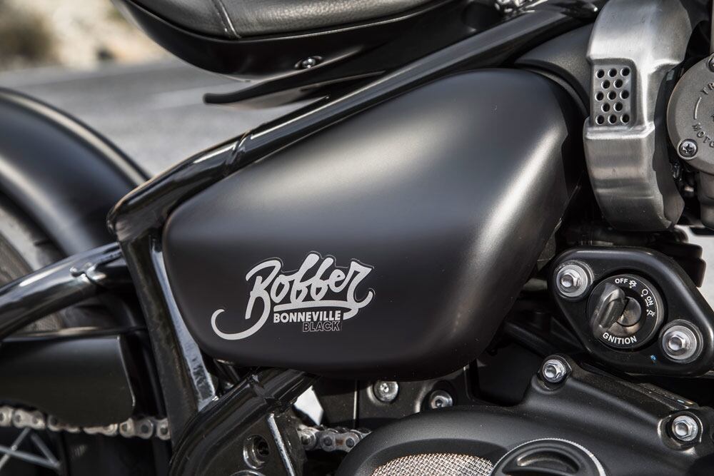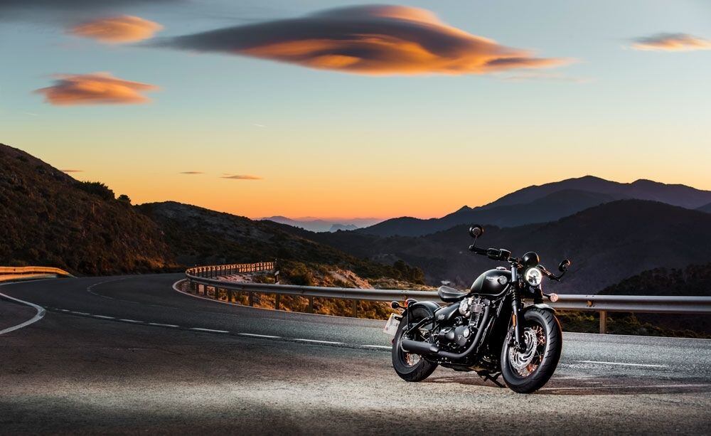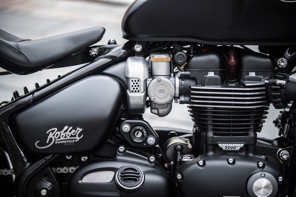 Who remembers the old Amal carburetors? Triumph went above and beyond in order to sneakily hide the Bobber Black's fuel injectors behind a fake carburetor bank. (Triumph Motorcycles)Tractor-style seats are common on custom bobbers, and the Bobber Black draws from the same vein. (Triumph Motorcycles)The Bobber Black also features LED lighting for all other external lights, including the brake light, taillight, signals and headlight. (Triumph Motorcycles)New for the Bobber Black is a daytime running light (the soft white part around the perimeter of the headlight bucket) as well as an LED headlight beam. (Triumph Motorcycles)The exhaust isn't new, but it's black now, and it still has the same killer sound. (Triumph Motorcycles)Can you spot the radiator at the front of the bike? Triumph did a great job at hiding it, and as such, it doesn't look out of place or distract from the lines of the rest of the bike. (Triumph Motorcycles)What's better than a single Brembo caliper? How about two! You won't find these doubled up on the previous version of the Bobber. Unfortunately, Triumph tells us this dual-brake setup can't be retrofitted to the older Bobber due to the complexity of the ABS system, so we'd suggest you consider starting out with the Bobber Black, or trading up from the old model if a single front brake is a deal breaker for you. (Triumph Motorcycles)The bar-end mirrors adhere to the rest of the bike's robust style. (Triumph Motorcycles)Think it looks sinister during the day? Check it out at night. (Triumph Motorcycles)Steel fenders? Yes please. It's nice having something you can tap on with your knuckle that feels as beefy as the bike looks. Sure, it adds weight, but that's not really what we're worried about here. (Triumph Motorcycles)The gauge cluster itself is nice and clean, and uncluttered. You can see the green headlight beam indicator to the immediate left of the needle and the orange traction control light is lit up, notifying the rider that traction control has been turned off. You also have a handy fuel gauge, as well as a gear indicator in the top left corner. (Triumph Motorcycles)Remember the Henry Ford quote? "You can have any color you want, so long as it's black." You can have the Bobber in Gloss Black and Matte Black, but the latter will cost you a little bit extra. (Triumph Motorcycles)Not too brutal that you can't stop for some good coffee. (Triumph Motorcycles)Regardless of how good the coffee might be, you'll soon be looking back at the bike. Trust us. (Triumph Motorcycles)Left:See that button on the bottom right of the left switch assembly? That's the built-in cruise control button: One press arms it, and the second press sets the speed at the current pace you're going. You can touch either the front or rear brake, push the cruise button a third time, or blip the throttle to disable it. Right: The right-side throttle grip is uncluttered, featuring only start/kill switch, mode button, and hazard light switch. (Triumph Motorcycles)The Bobber Black's timeless style naturally highlighted against a canvas adorned with the Spanish hillside. (Triumph Motorcycles)(Triumph Motorcycles)Riders will find the ignition next to their right thigh. (Triumph Motorcycles)