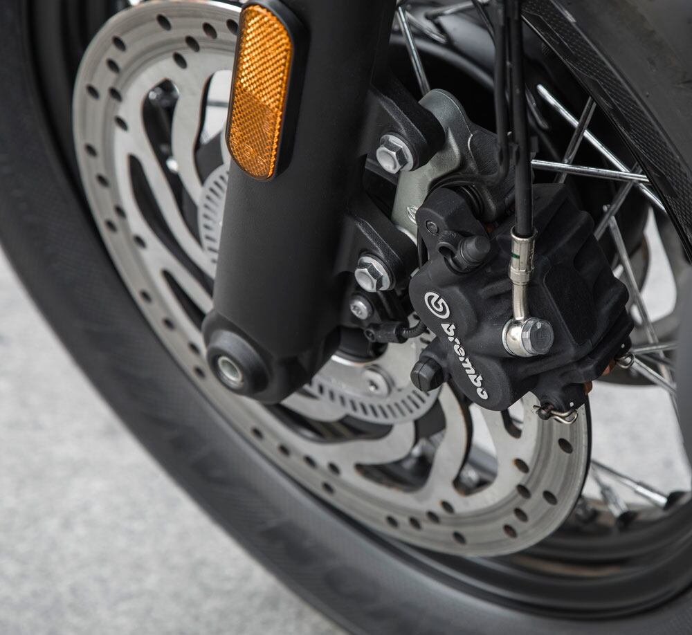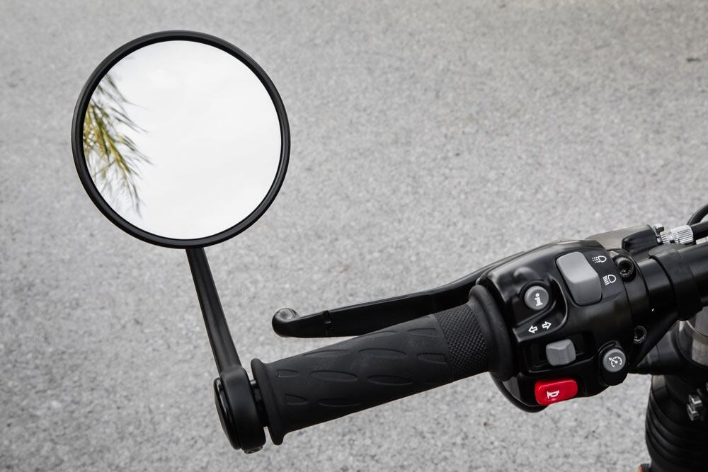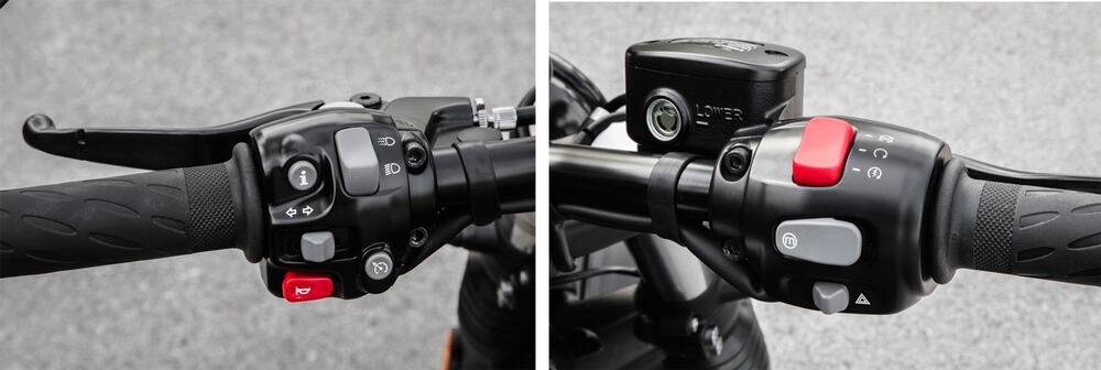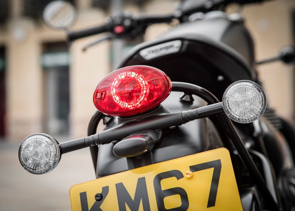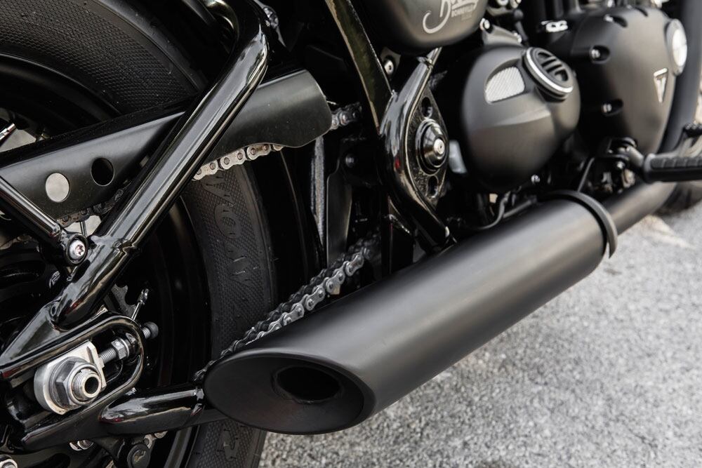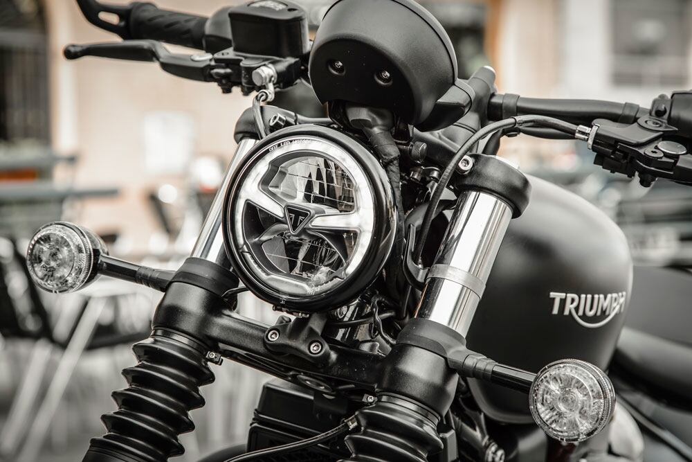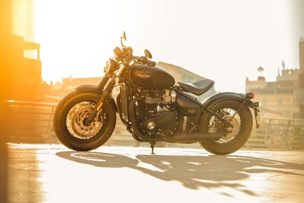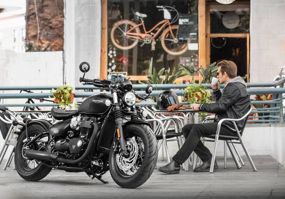 Who remembers the old Amal carburetors? Triumph went above and beyond in order to sneakily hide the Bobber Black's fuel injectors behind a fake carburetor bank. (Triumph Motorcycles)Tractor-style seats are common on custom bobbers, and the Bobber Black draws from the same vein. (Triumph Motorcycles)The Bobber Black also features LED lighting for all other external lights, including the brake light, taillight, signals and headlight. (Triumph Motorcycles)New for the Bobber Black is a daytime running light (the soft white part around the perimeter of the headlight bucket) as well as an LED headlight beam. (Triumph Motorcycles)The exhaust isn't new, but it's black now, and it still has the same killer sound. (Triumph Motorcycles)Can you spot the radiator at the front of the bike? Triumph did a great job at hiding it, and as such, it doesn't look out of place or distract from the lines of the rest of the bike. (Triumph Motorcycles)What's better than a single Brembo caliper? How about two! You won't find these doubled up on the previous version of the Bobber. Unfortunately, Triumph tells us this dual-brake setup can't be retrofitted to the older Bobber due to the complexity of the ABS system, so we'd suggest you consider starting out with the Bobber Black, or trading up from the old model if a single front brake is a deal breaker for you. (Triumph Motorcycles)The bar-end mirrors adhere to the rest of the bike's robust style. (Triumph Motorcycles)Think it looks sinister during the day? Check it out at night. (Triumph Motorcycles)Steel fenders? Yes please. It's nice having something you can tap on with your knuckle that feels as beefy as the bike looks. Sure, it adds weight, but that's not really what we're worried about here. (Triumph Motorcycles)The gauge cluster itself is nice and clean, and uncluttered. You can see the green headlight beam indicator to the immediate left of the needle and the orange traction control light is lit up, notifying the rider that traction control has been turned off. You also have a handy fuel gauge, as well as a gear indicator in the top left corner. (Triumph Motorcycles)Remember the Henry Ford quote? "You can have any color you want, so long as it's black." You can have the Bobber in Gloss Black and Matte Black, but the latter will cost you a little bit extra. (Triumph Motorcycles)Not too brutal that you can't stop for some good coffee. (Triumph Motorcycles)Regardless of how good the coffee might be, you'll soon be looking back at the bike. Trust us. (Triumph Motorcycles)Left:See that button on the bottom right of the left switch assembly? That's the built-in cruise control button: One press arms it, and the second press sets the speed at the current pace you're going. You can touch either the front or rear brake, push the cruise button a third time, or blip the throttle to disable it. Right: The right-side throttle grip is uncluttered, featuring only start/kill switch, mode button, and hazard light switch. (Triumph Motorcycles)The Bobber Black's timeless style naturally highlighted against a canvas adorned with the Spanish hillside. (Triumph Motorcycles)(Triumph Motorcycles)Riders will find the ignition next to their right thigh. (Triumph Motorcycles)