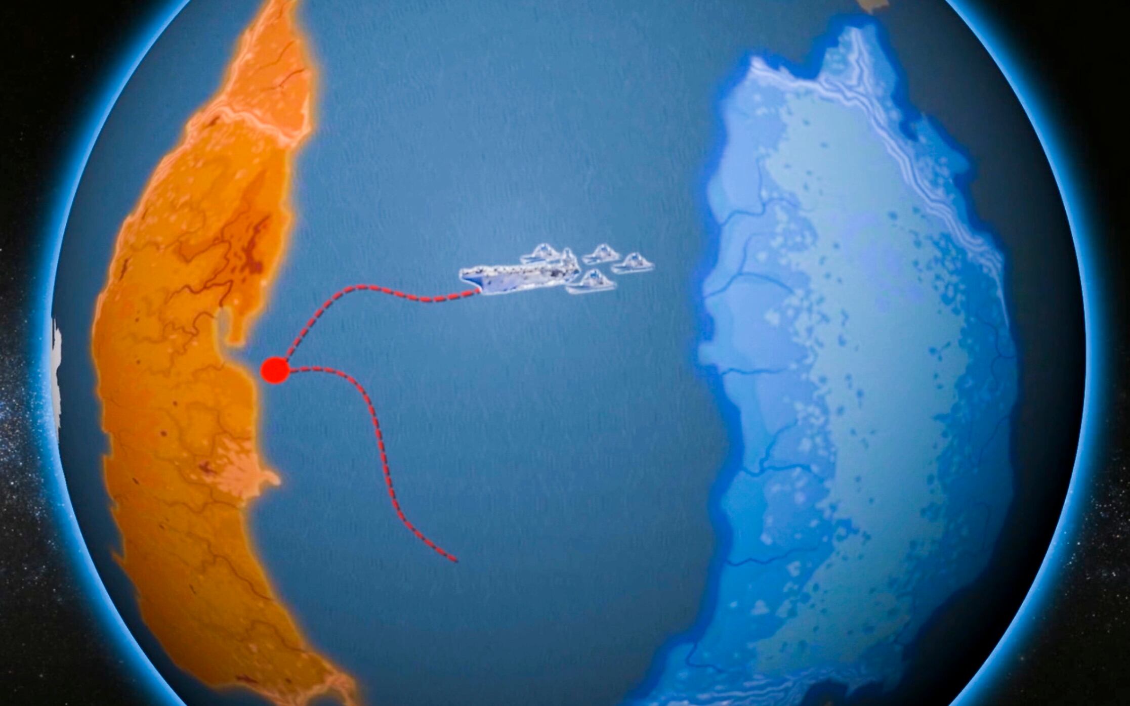 A computer simulation shows the flight of a prospective Russian nuclear-powered cruise missile en route to target. (RU-RTR Russian Television via AP)