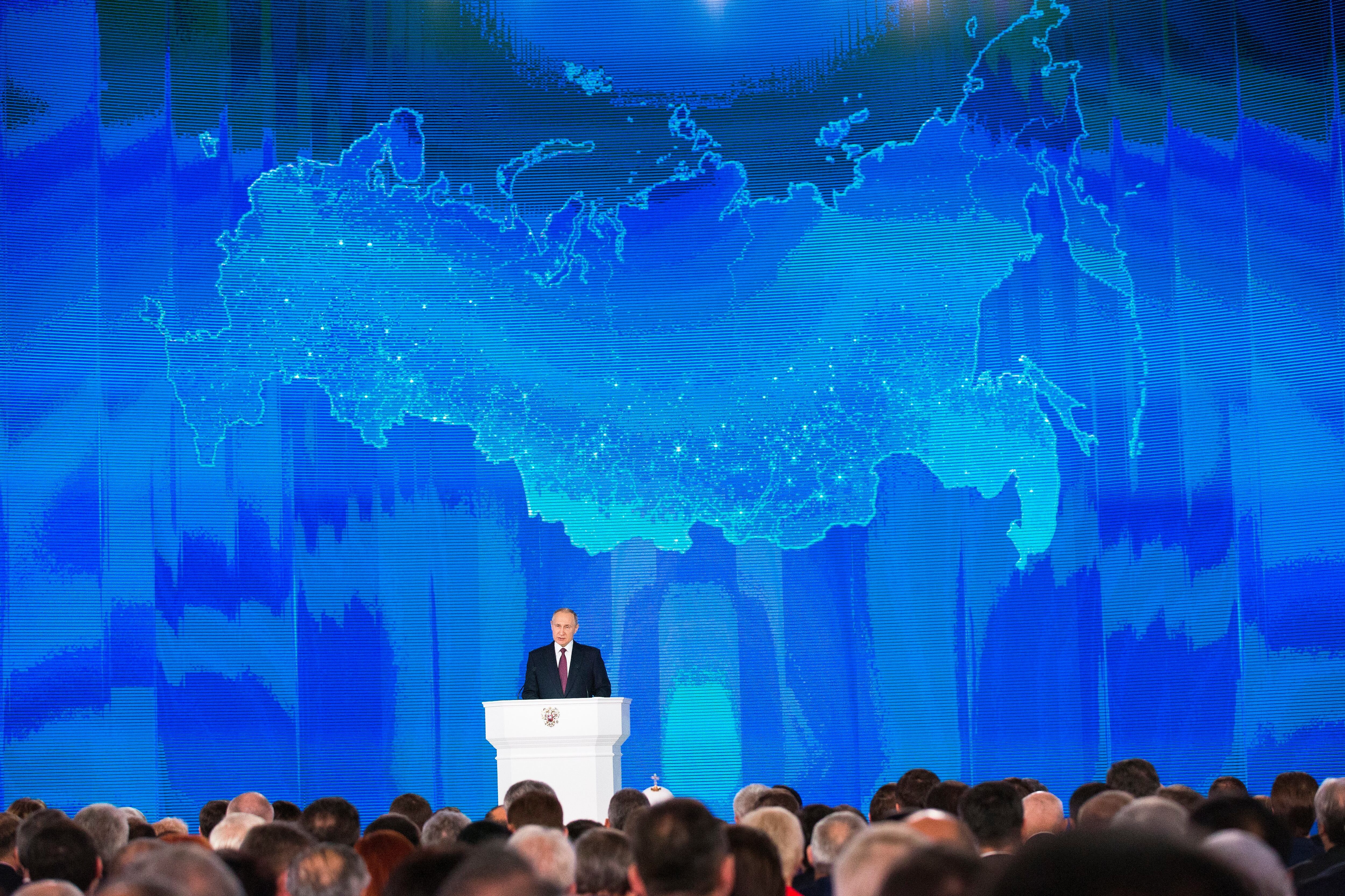 Russian President Vladimir Putin gives his annual state of the nation address in Manezh in Moscow, Russia, Thursday, March 1, 2018. Putin set a slew of ambitious economic goals, vowing to boost living standards, improve health care and education and build modern infrastructure in a state-of-the-nation address. (AP Photo/Alexander Zemlianichenko)