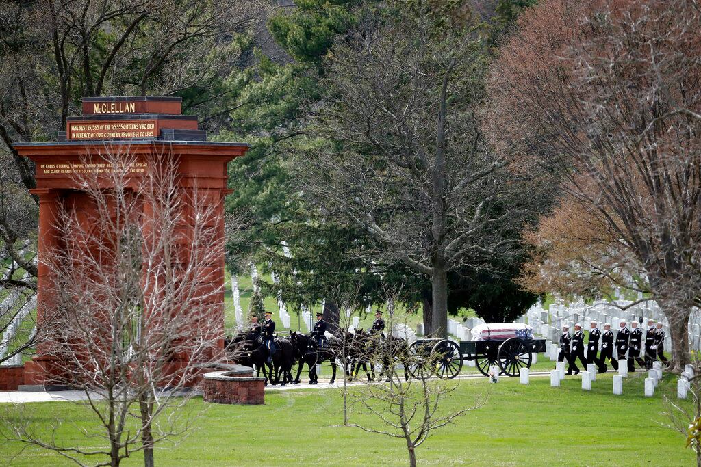 A horse drawn caisson arrives through the McClellan Gate for burial services for Capt. Thomas J. Hudner Jr., a naval aviator and Medal of Honor recipient from Concord, Mass., at Arlington National Cemetery Wednesday, April 4, 2018 in Arlington, Va. Hudner earned the Medal of Honor for his actions in the Battle of the Chosin Reservoir during the Korean War. (Alex Brandon/AP)The flag is folded during burial services for Capt. Thomas J. Hudner Jr., a naval aviator and Medal of Honor recipient from Concord, Mass., at Arlington National Cemetery Wednesday, April 4, 2018, in Arlington, Va. Hudner earned the Medal of Honor for his actions in the Battle of the Chosin Reservoir during the Korean War. (Alex Brandon/AP)The casket team prepares to fold the flag during burial services for Capt. Thomas J. Hudner Jr., a naval aviator and Medal of Honor recipient from Concord, Mass., at Arlington National Cemetery Wednesday, April 4, 2018 in Arlington, Va. Hudner earned the Medal of Honor for his actions in the Battle of the Chosin Reservoir during the Korean War. (Alex Brandon/AP)The Medal of Honor flag flies during burial services for Capt. Thomas J. Hudner Jr., a naval aviator and Medal of Honor recipient from Concord, Mass., at Arlington National Cemetery Wednesday, April 4, 2018 in Arlington, Va. Hudner earned the Medal of Honor for his actions in the Battle of the Chosin Reservoir during the Korean War. (Alex Brandon/AP)The firing party fires one of three volleys during burial services for Capt. Thomas J. Hudner Jr., a naval aviator and Medal of Honor recipient from Concord, Mass., at Arlington National Cemetery Wednesday, April 4, 2018 in Arlington, Va. Hudner earned the Medal of Honor for his actions in the Battle of the Chosin Reservoir during the Korean War.(Alex Brandon/AP)U.S. Navy Cmdr. Nathan Scherry, commanding officer, precommissioning unit, Thomas Hudner, right, gives condolences to Georgea Hudner, during burial services for her husband Capt. Thomas J. Hudner Jr., a naval aviator and Medal of Honor recipient from Concord, Mass., at Arlington National Cemetery Wednesday, April 4, 2018 in Arlington, Va. Hudner earned the Medal of Honor for his actions in the Battle of the Chosin Reservoir during the Korean War.(Alex Brandon/AP)Joint Chiefs Chairman Gen. Joseph Dunford, right, speaks with Georgea Hudner, during burial services for her husband, Capt. Thomas J. Hudner Jr., a naval aviator and Medal of Honor recipient from Concord, Mass., at Arlington National Cemetery Wednesday, April 4, 2018 in Arlington, Va. Hudner earned the Medal of Honor for his actions in the Battle of the Chosin Reservoir during the Korean War.(Alex Brandon/AP)The flag is presented by U.S. Navy Rear Adm. William Galinis, right, to Georgea Hudner, during burial services for her husband, Capt. Thomas J. Hudner Jr., a naval aviator and Medal of Honor recipient from Concord, Mass., at Arlington National Cemetery Wednesday, April 4, 2018 in Arlington, Va. Hudner earned the Medal of Honor for his actions in the Battle of the Chosin Reservoir during the Korean War. (Alex Brandon/AP)A flyover of F-18 Superhornets from Strike Fighter Squadron VFA 32 flies over during burial services for Capt. Thomas J. Hudner Jr., a naval aviator and Medal of Honor recipient from Concord, Mass., at Arlington National Cemetery Wednesday, April 4, 2018 in Arlington, Va. Hudner earned the Medal of Honor for his actions in the Battle of the Chosin Reservoir during the Korean War. (Alex Brandon/AP)In this July 12, 2013, file photo, retired U.S. Navy Capt. Thomas Hudner, who was awarded the Medal of Honor by President Truman, poses on the porch at his home in Concord, Mass. Hudner intentionally crashed his plane during the Korean War in 1950 to try to save his wingman Jesse Brown, whose plane had been shot down. Hudner died Monday, Nov. 13, 2017, at age 93, and will be buried Wednesday, April 4, 2018, at Arlington National Cemetery in Arlington, Va. (Charles Krupa/AP)