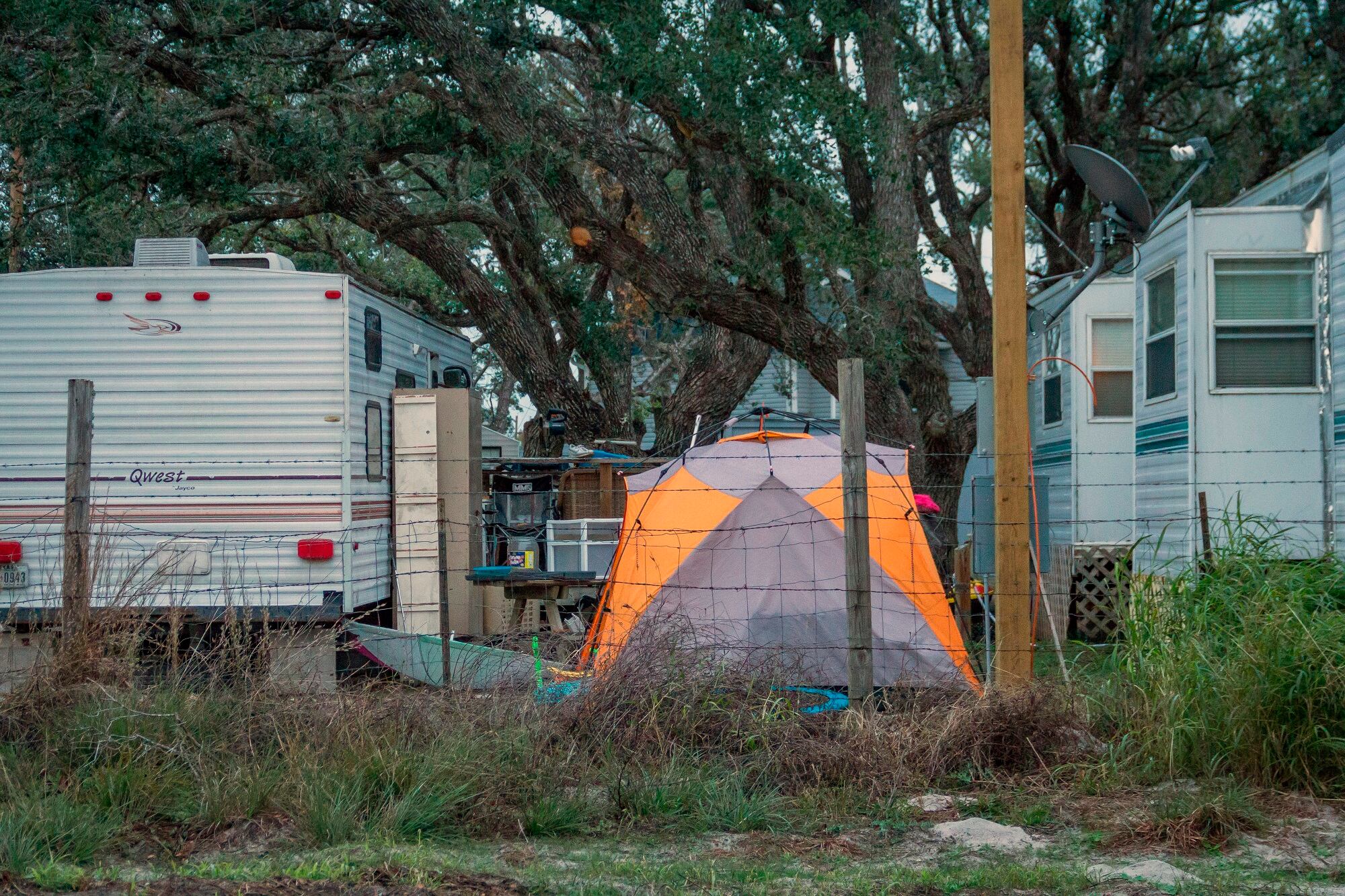 “I don’t care what shape it’s in, it beats sleeping on a dirt floor,” said Christy Combs, who moved with her husband, four children and five dogs into a tent after their rented apartment in Aransas Pass, Texas, was left uninhabitable by floodwater.