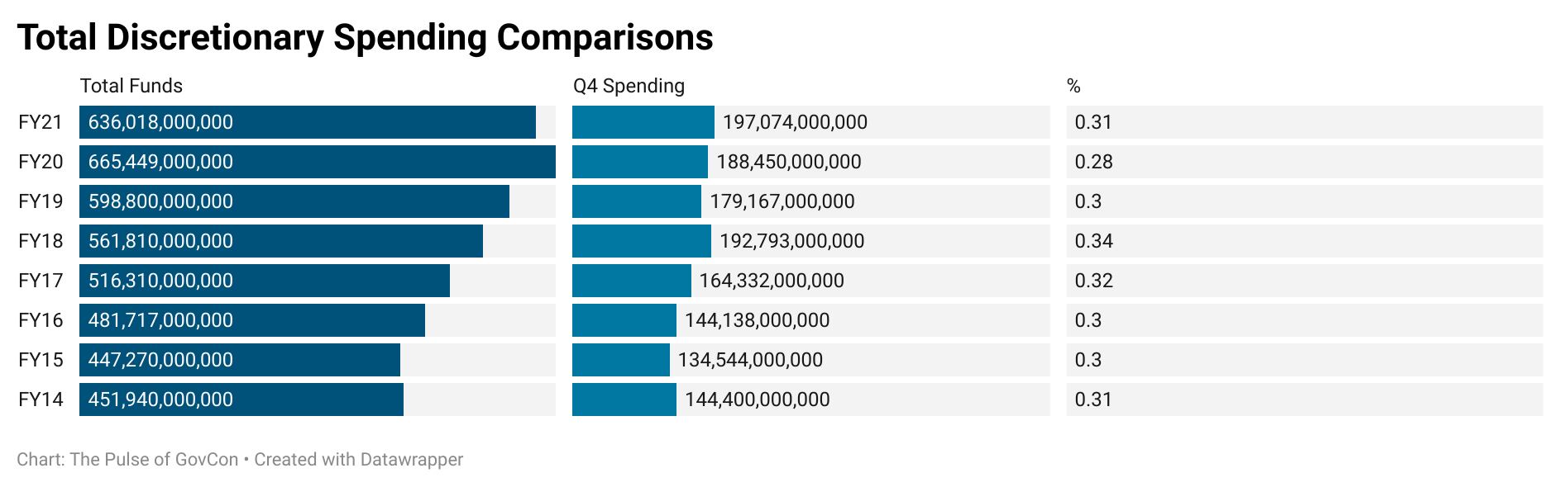 And if fiscal 2022 is anything like previous years, the final three months will account for about a third of total obligations. Large government contractors get most of that payout, with small businesses following behind, according to analysis from The Pulse of GovCon, a woman-owned business intelligence advisory firm focused on government contracting.