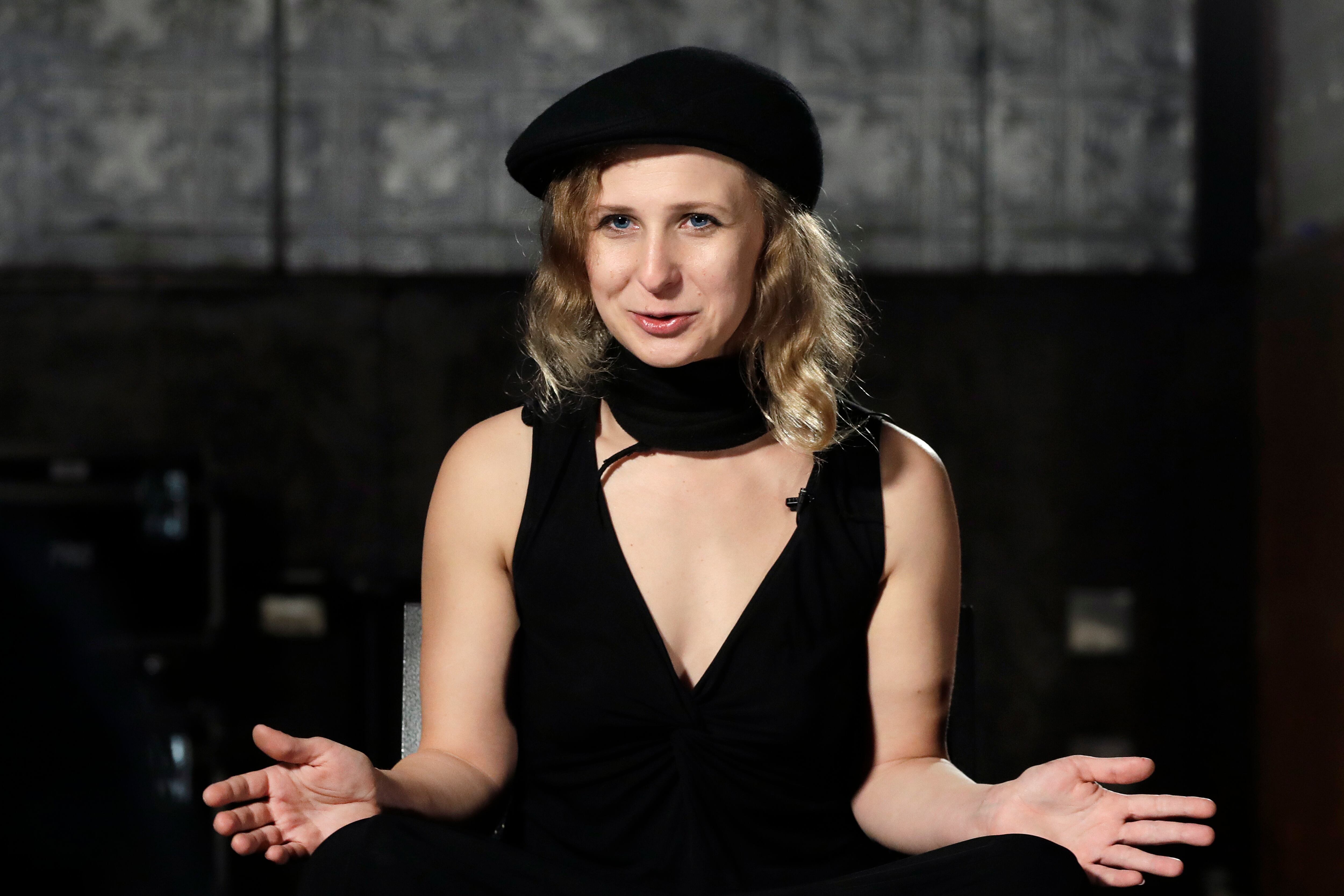 In this Friday, Oct. 13, 2017 photo, Maria Alekhina, of the Russian, punk band Pussy Riot, speaks during an interview at La Mama Theater in New York. The Russian political activist, convicted in 2012 of hooliganism and released from prison in 2013, was the target of three phishing emails during March-April 2015 at her Gmail address, according to data from the cybersecurity firm Secureworks. (AP Photo/Mark Lennihan)
