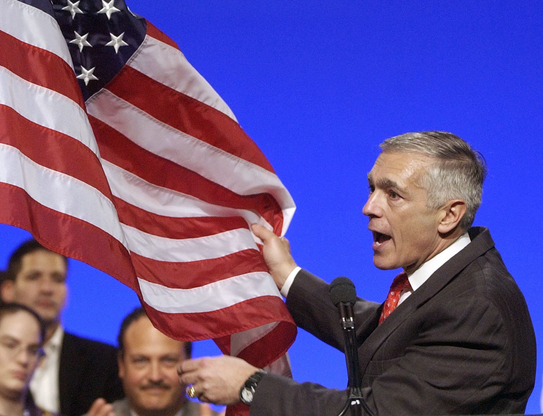 FILE - In this Saturday, Dec. 6, 2003 file photo, presidential candidate Wesley Clark holds a U.S. flag as he speaks to delegates at the Florida Democratic Party convention in Lake Buena Vista, Fla. The commander in chief of U.S. European command and candidate for Democratic presidential nomination in 2003 was the target of 13 phishing emails during April-December 2015 at his Gmail address, according to data from the cybersecurity firm Secureworks. (AP Photo/Scott Martin)