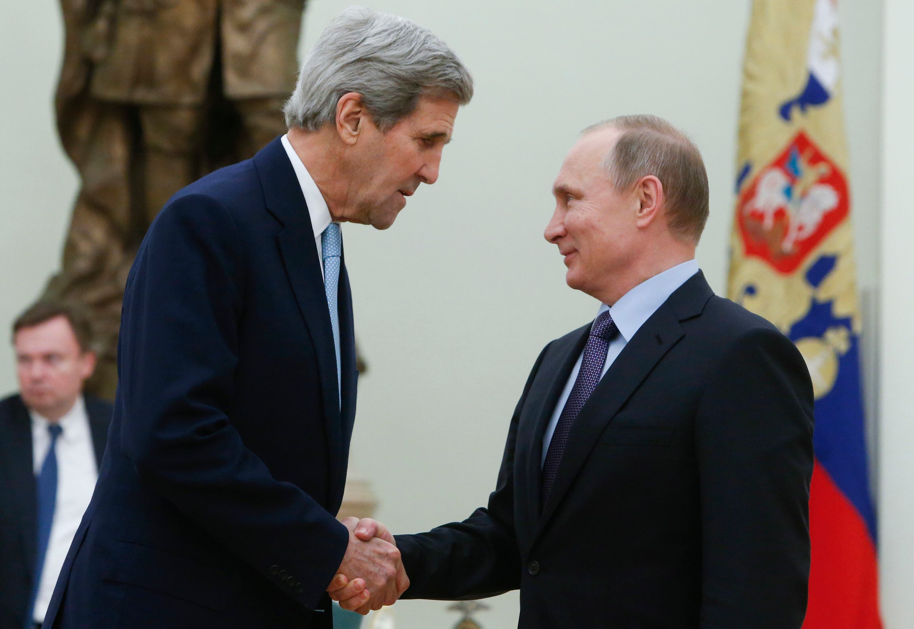 FILE - In this Tuesday, Dec. 15, 2015 file photo, U.S. Secretary of State John Kerry, left, shakes hands with Russian President Vladimir Putin during their meeting in the Kremlin in Moscow, Russia. The secretary of state under President Barack Obama, 2004 Democratic presidential candidate and former U.S. senator from Massachusetts was the target of at least five phishing emails during June-December 2015 at his Gmail address, according to data from the cybersecurity firm Secureworks. (Sergei Karpukhin/Pool Photo via AP)