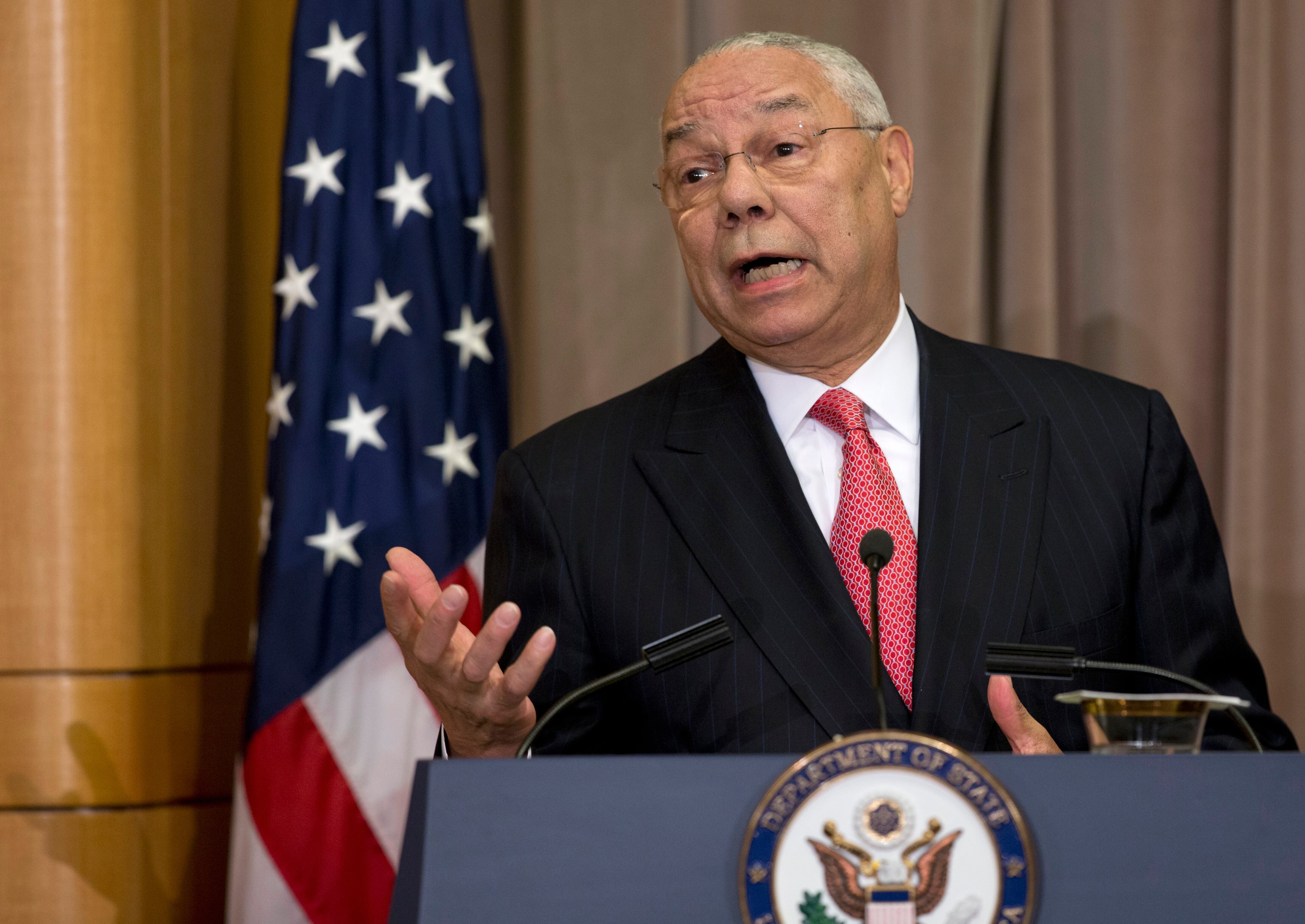 FILE - In this Sept. 3, 2014 file photo, former Secretary of State Colin Powell speaks at the State Department in Washington. The secretary of state under President George W. Bush, national security adviser under President Ronald Reagan, and former chairman of the Joint Chiefs of Staff was the target of one phishing email in June 2015 at his Gmail addresss, according to data from the cybersecurity firm Secureworks. (AP Photo/Carolyn Kaster)