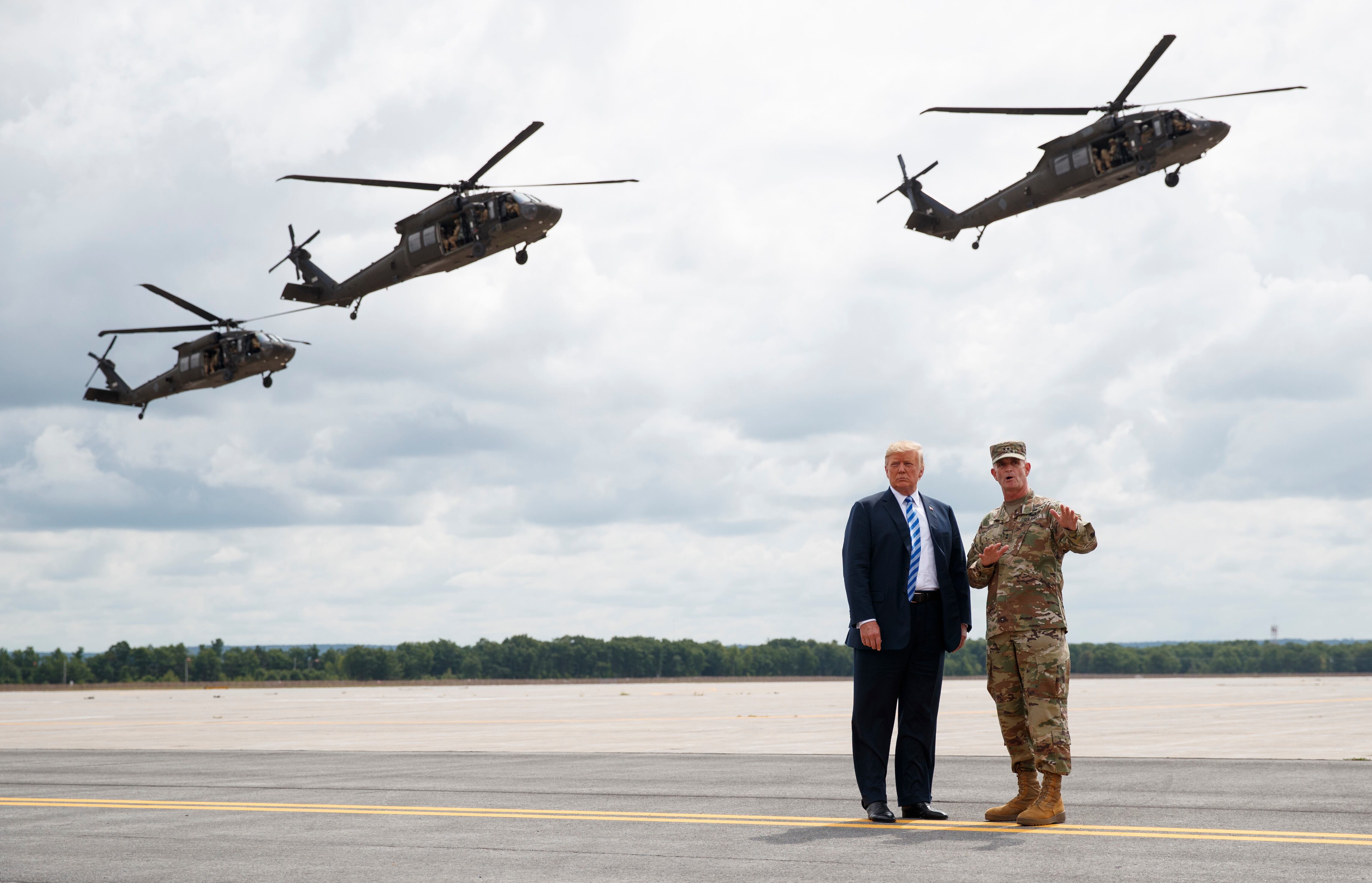 Trump’s visit to Fort Drum, home to the 10th Mountain Division, was marked by a military exercise that included artillery fire and rotary-wing aircraft.