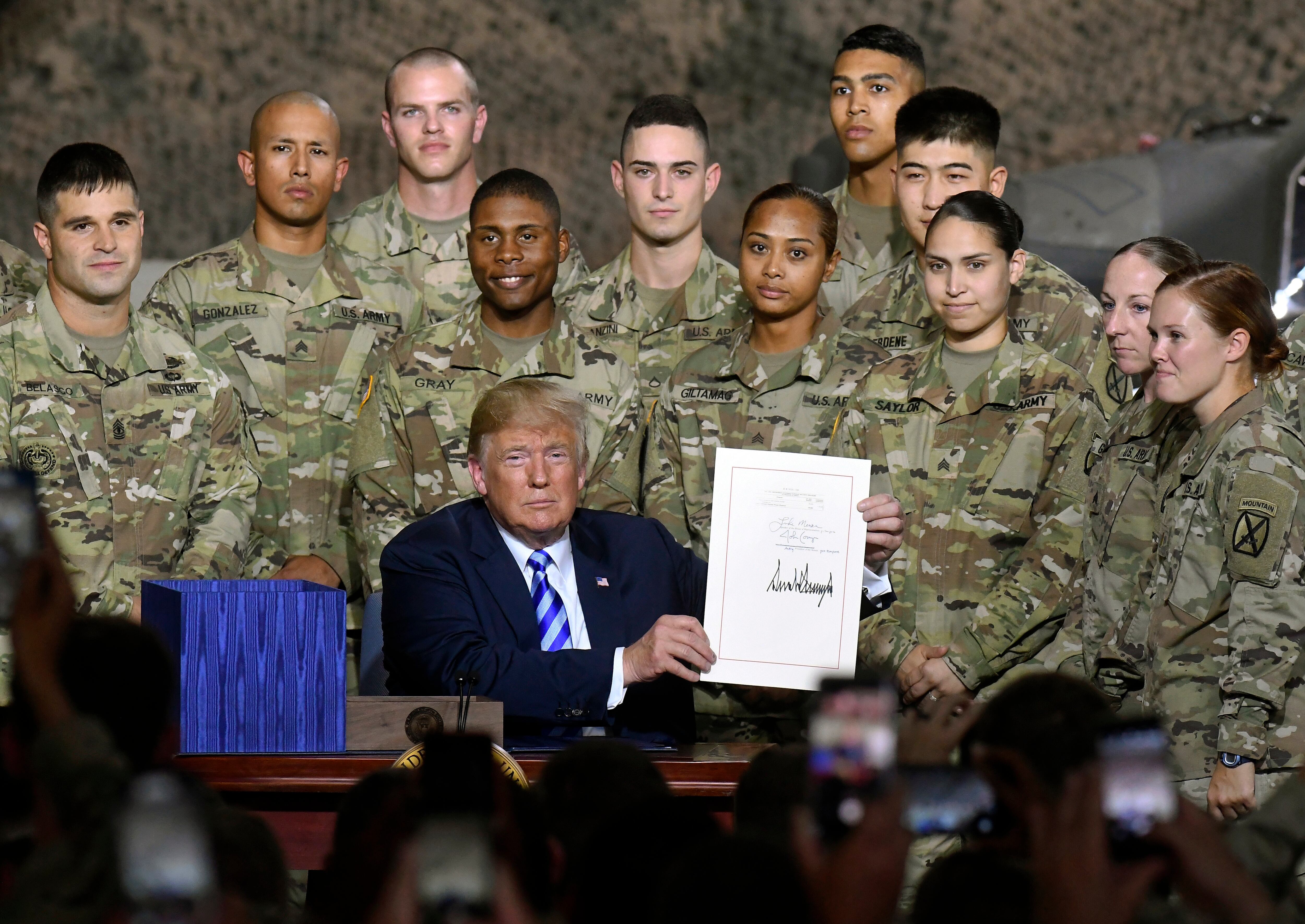Vice President Mike Pence, the Joint Chiefs of Staff and Deputy Defense Secretary Patrick Shanahan attended the event — and more than a dozen uniformed soldiers flanked Trump as he signed the bill.