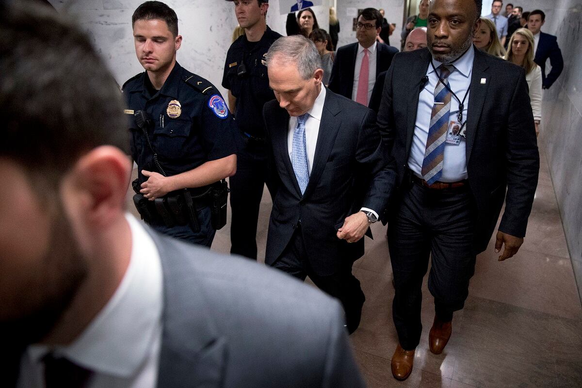 The EPA chief, ringed by his staff and security team, appeared to ignore them. He briskly made his way out to a waiting black SUV with tinted windows and drove away.