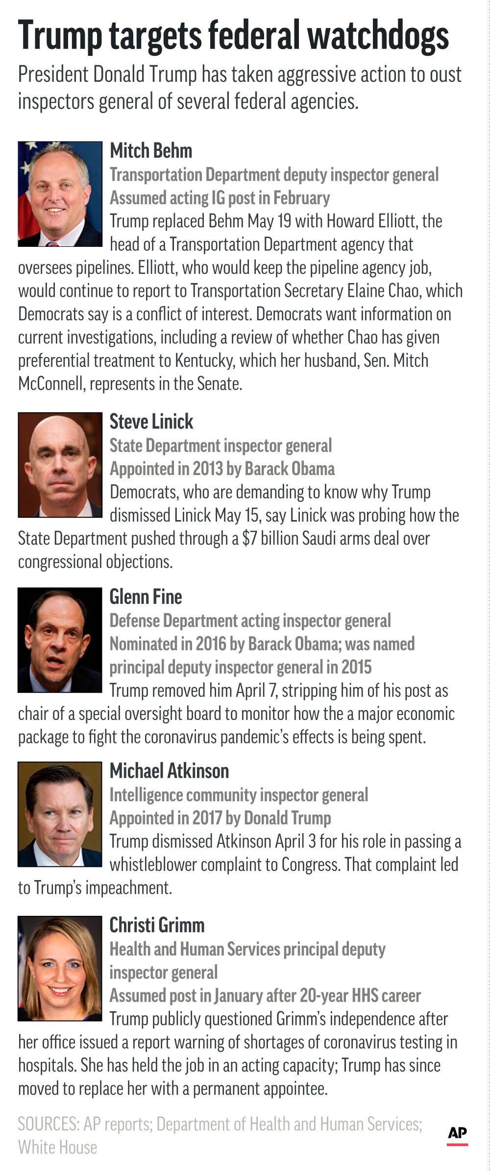 In addition, Trump demoted acting Defense Department Inspector General Glenn Fine, effectively removing him as head of a special board to oversee auditing of the coronavirus economic relief package. Fine later resigned.