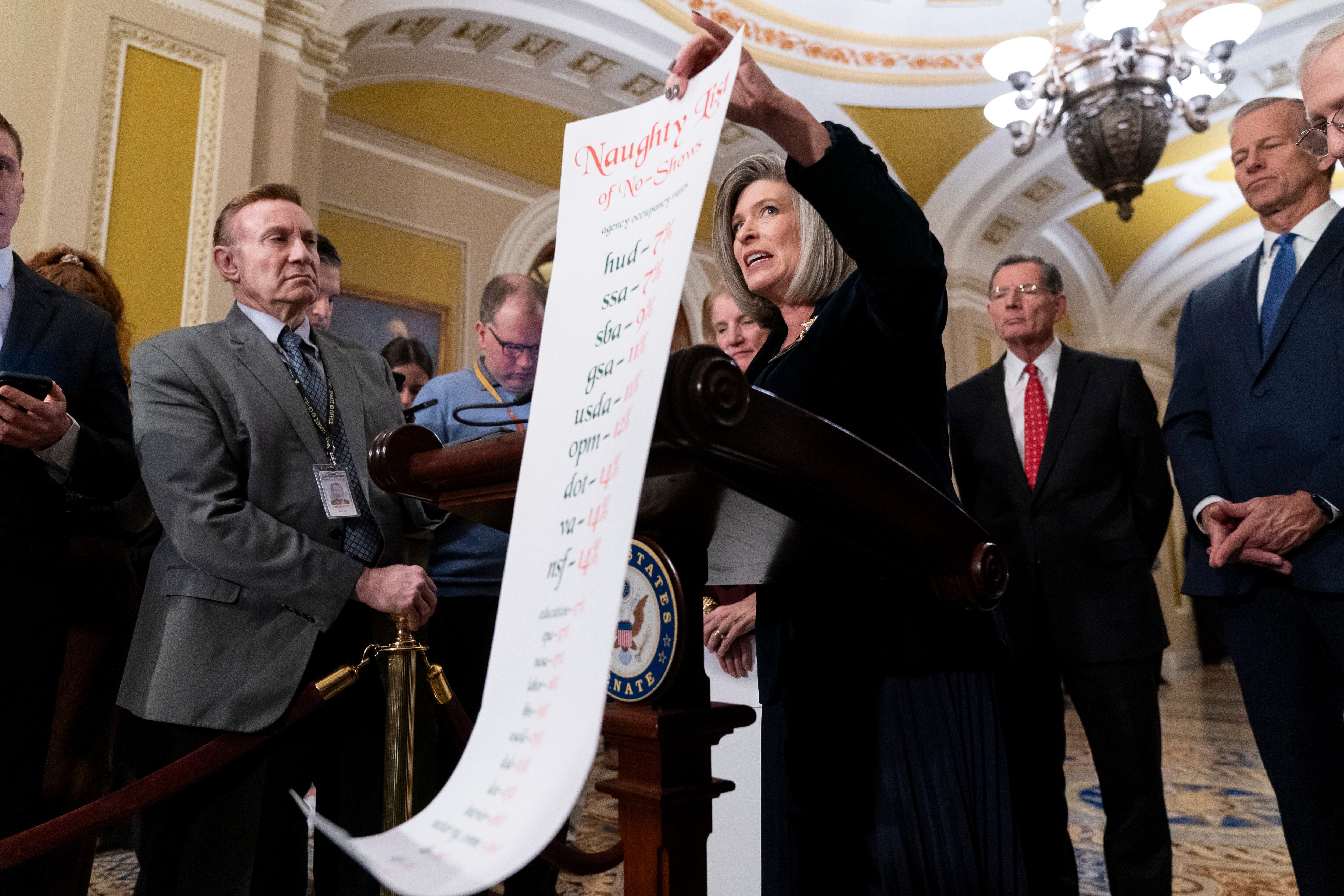 Sen. Joni Ernst, R-Iowa, unveiled her version of Santa’s naughty list late Tuesday, featuring a ranking of federal agencies with low occupancy rates in their buildings and calling for government workers to return to offices.