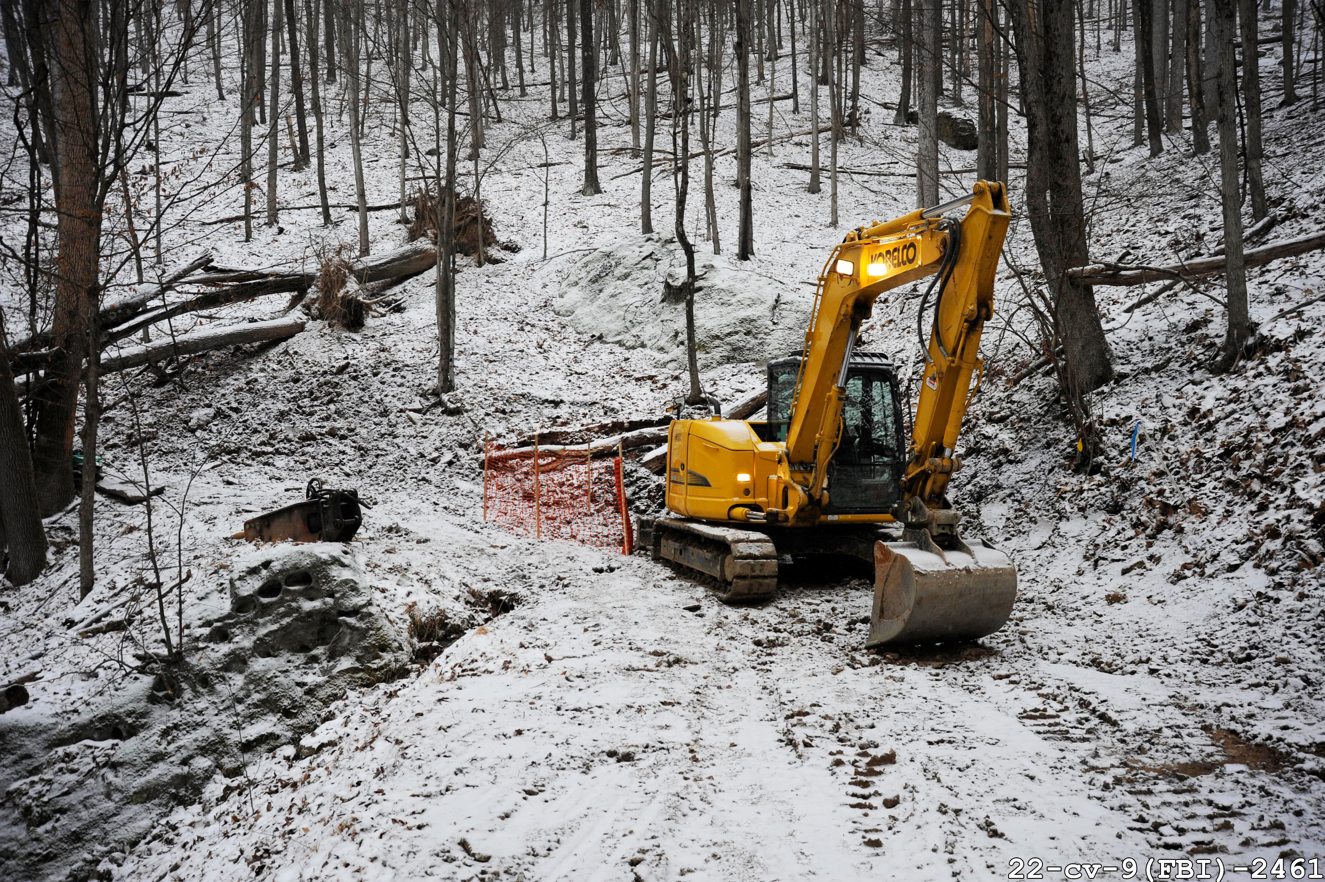 McCarthy said he got to the top of the ridge and started back down the other side. That’s when he laid eyes on the FBI operation, on the opposite slope, about 400 yards away. He saw lights powered by a generator. A parked excavator. A smaller piece of equipment, perhaps a skid-steer or quad, moving up and down the hill. A brown-black gash in the earth surrounded by snow. People huddling under a makeshift canopy.