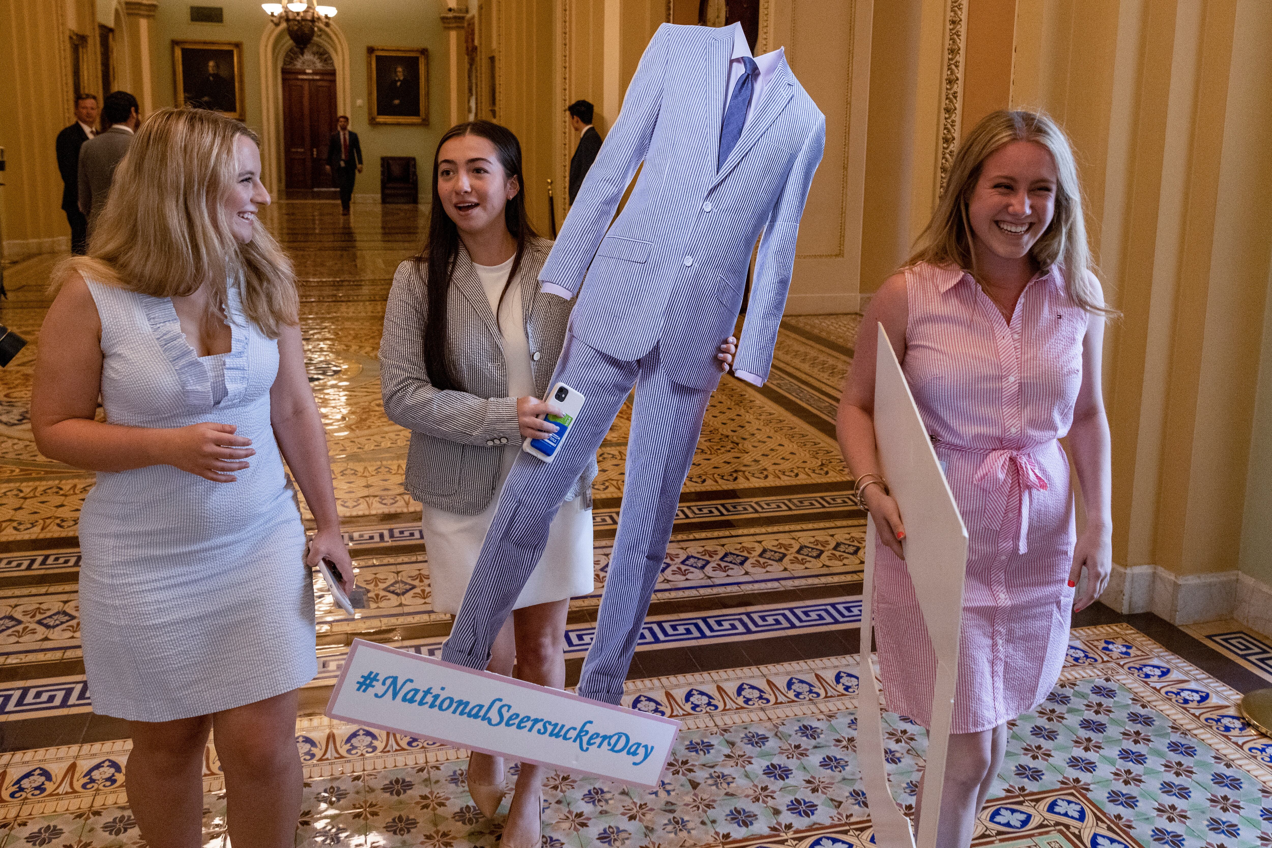 That’s the logic behind the annual Seersucker Day in Congress, a tradition led by Sen. Cassidy and Sen. Dianne Feinstein of California that sees Hill staff, lawmakers and others coordinate one day in June to wear seersucker — a lightweight, tightly woven cotton fabric that is striped, usually in pastels, and slightly puckered to give off a gathered, somewhat wrinkly look. On the day, it’s customary for lawmakers in various offices, Republican and Democrat, southerner and, yes, northerners too, to snap a photo wearing suits, jackets, ties and skirts in a dizzying, optical illusion-like sea of stripes.