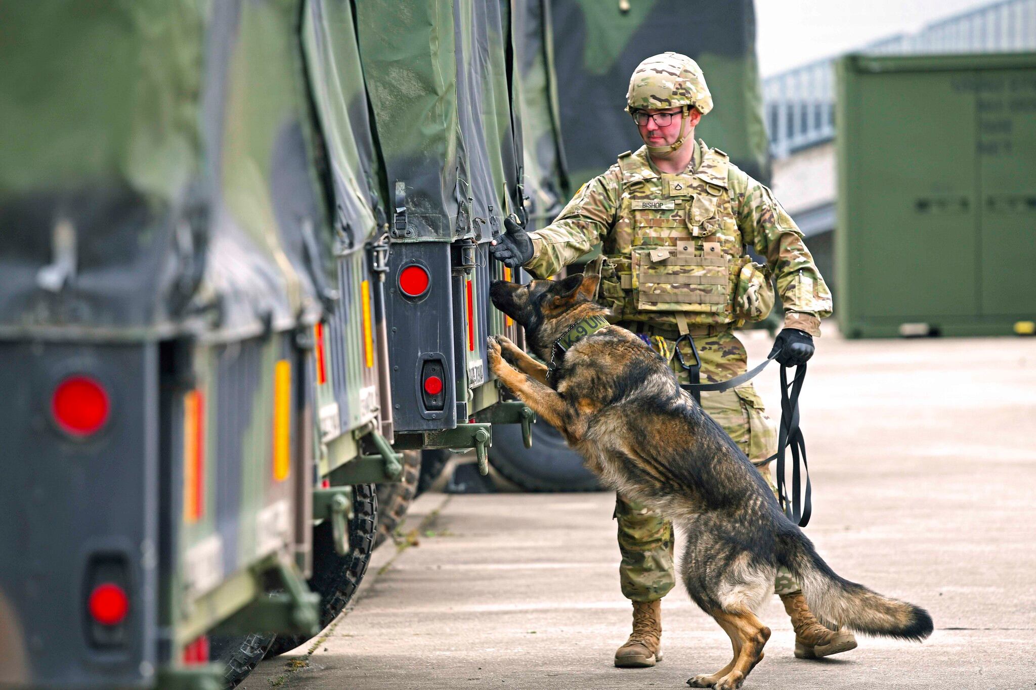 An Army military working dog and its handler undergo certification tests April 15, 2021, in Stuttgart, Germany. (Yvonne Najera/Army)