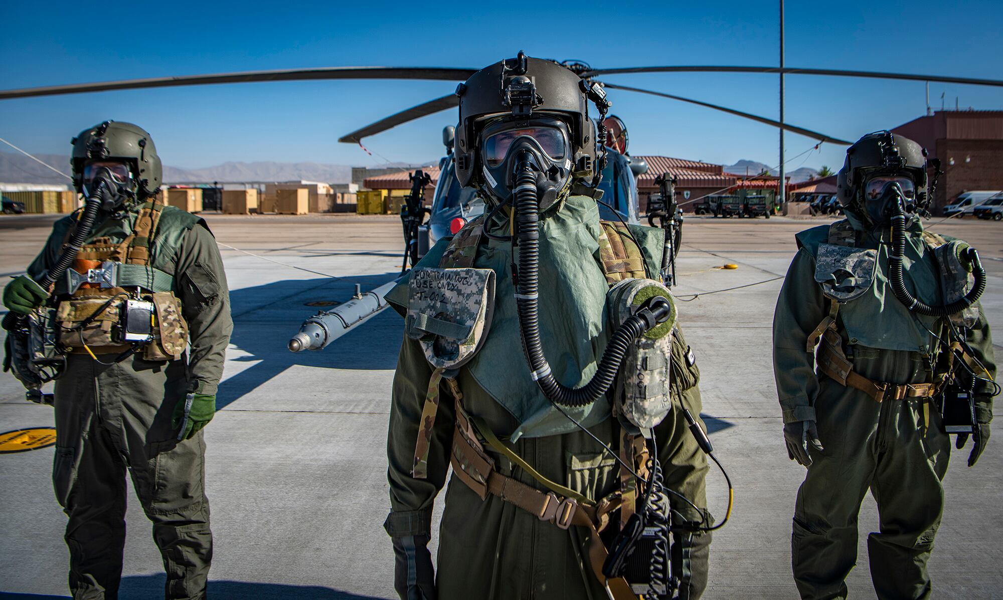 Airmen assigned to the 88th Test and Evaluation Squadron pose for a photo in full Chemical, Biological, Radiological, and Nuclear flight gear during a developmental test at Nellis Air Force Base, Nev., April 21, 2021. The airmen participated in on-going testing of the new Uniform Integrated Protective Ensemble Air two-piece system. (Senior Airman Dwane R. Young/Air Force)