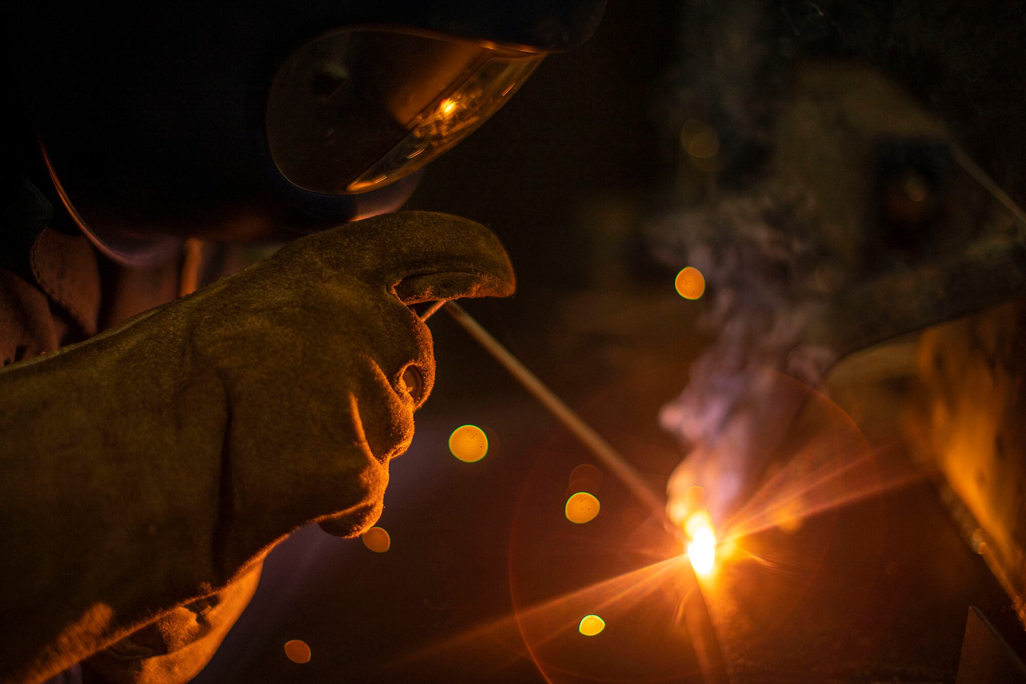 U.S. Navy Hull Maintenance Technician 3rd Class Sunday Morales III welds oxygen tank brackets for the amphibious transport dock USS Portland (LPD 27) medical clinic, April 26, 2021. (Sgt. Alexis Flores/Marine Corps)